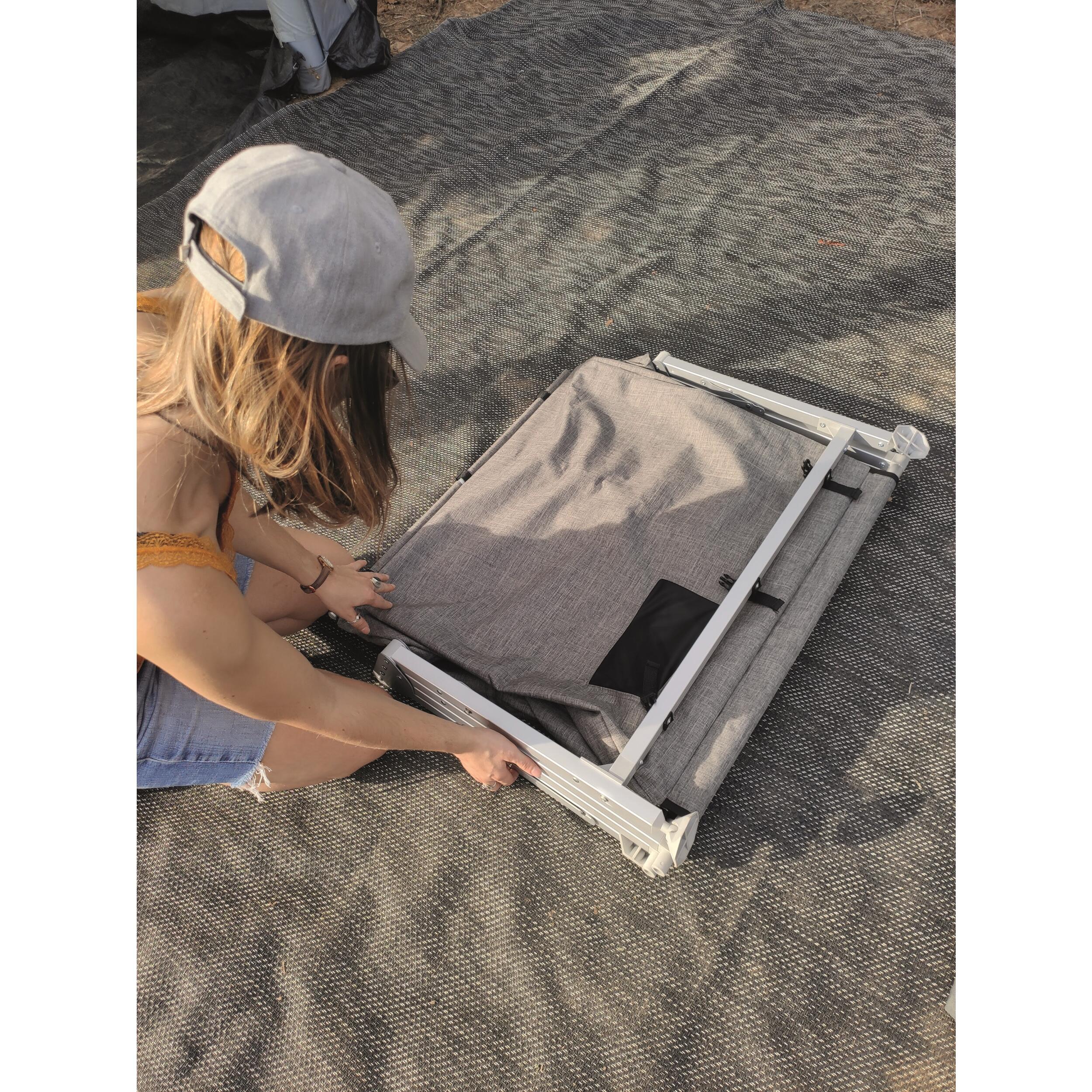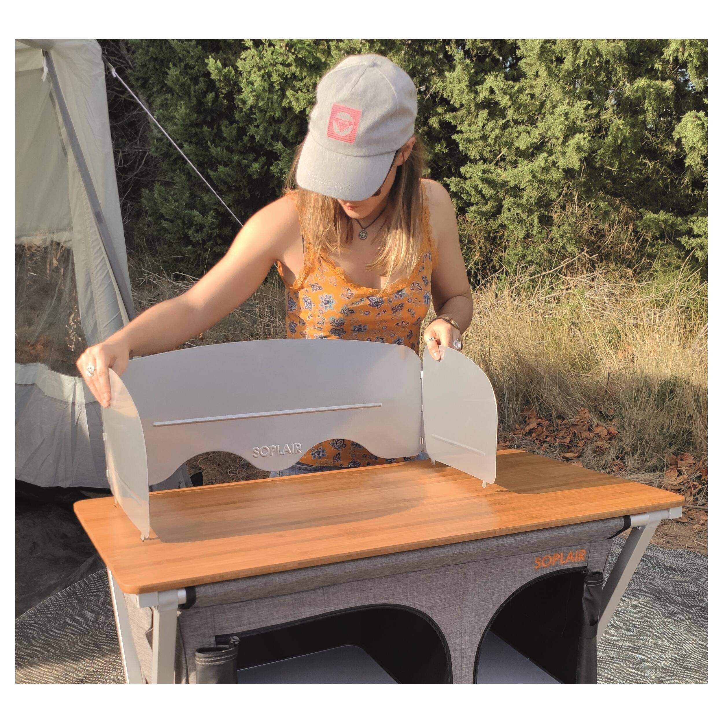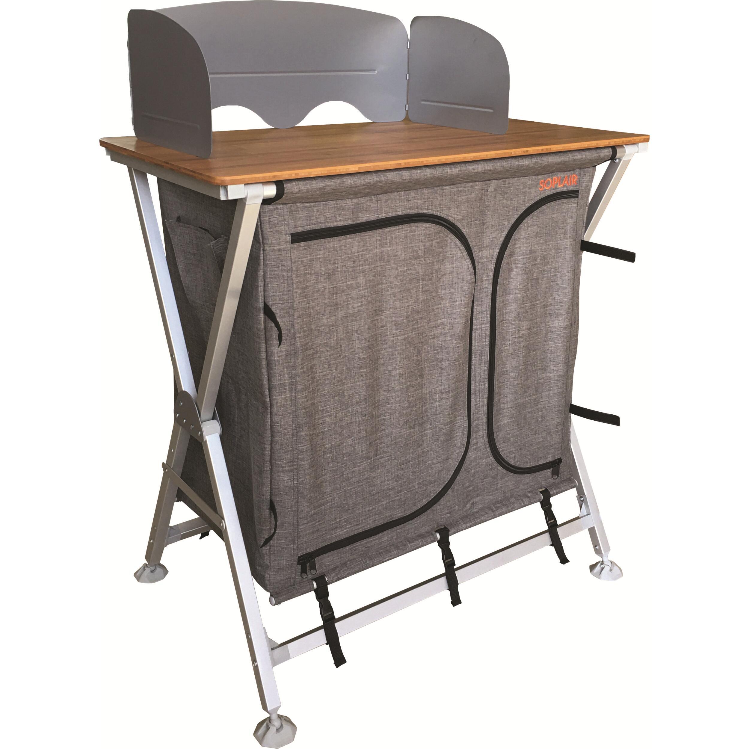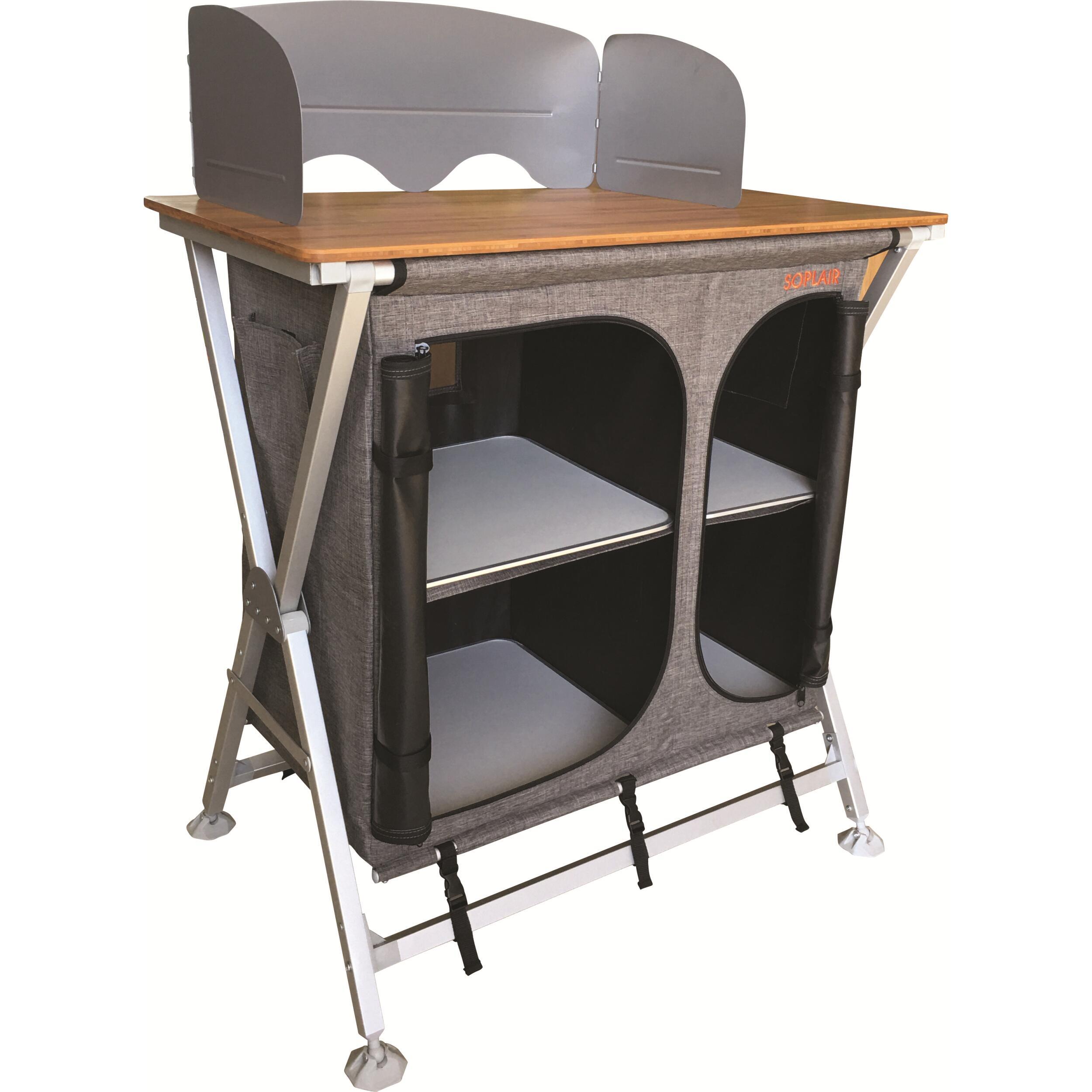Meuble de cuisine avec plan de travail en bambou naturel et armature pliante en aluminium. Equipé de quatre espaces confortables de rangement et d’une poche de chaque côté. Un pare-flamme en aluminium vient se positionner sur son magnifique plateau en bambou. Sa toile en polyester enduit PVC possède des aérations afin d’éviter les odeurs de renfermé. Ses pieds à tête rotative vous permettent d’ajuster le meuble aux variations des sols.