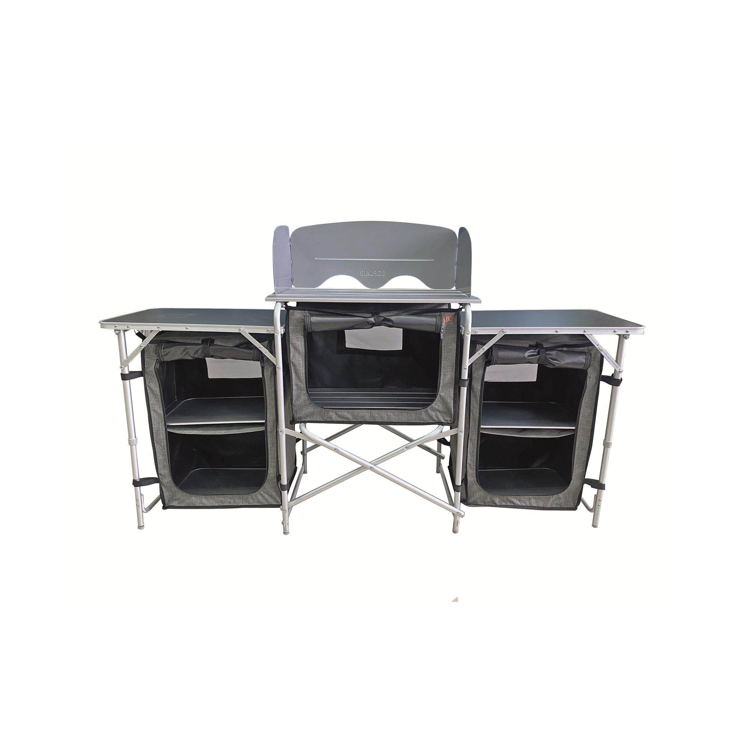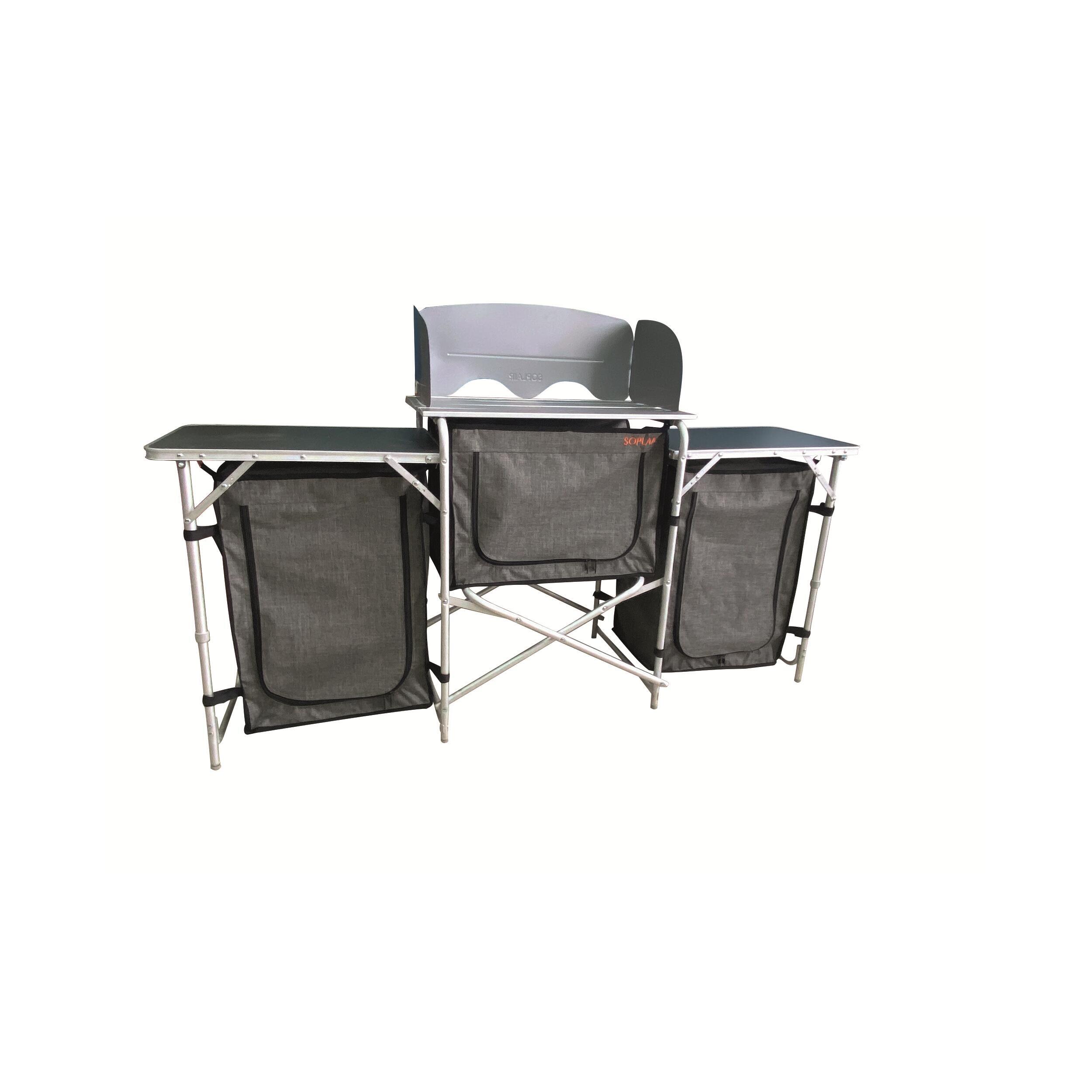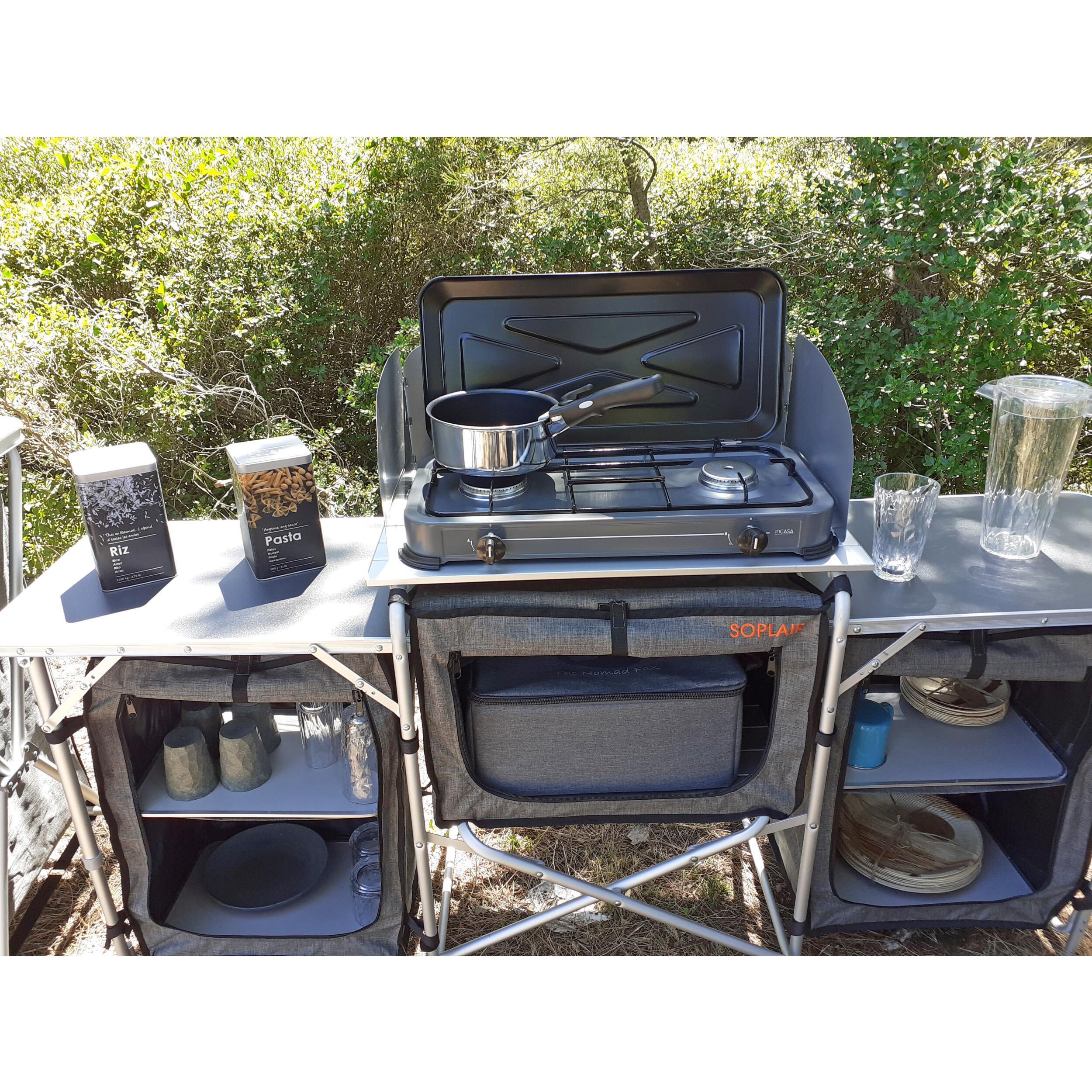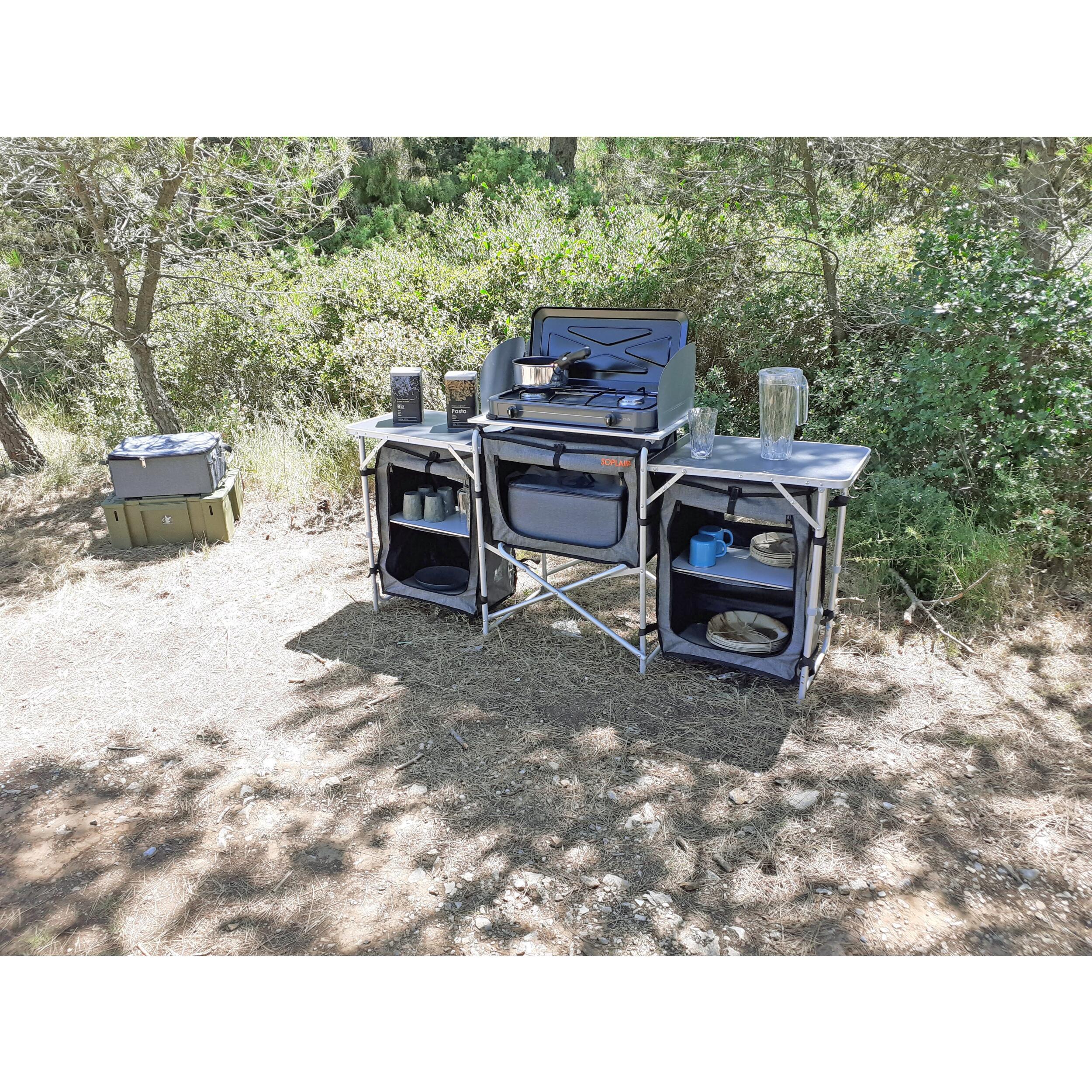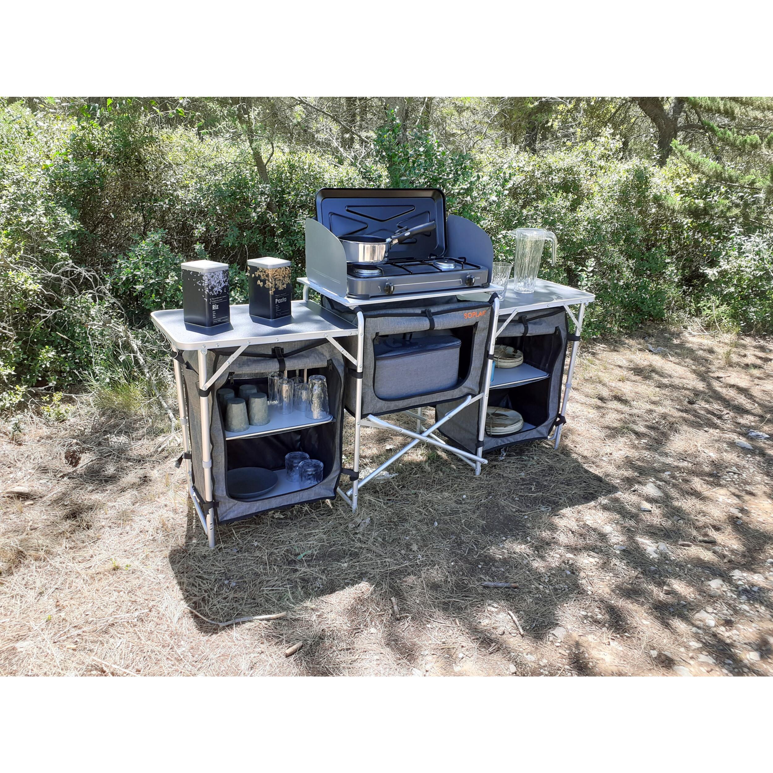 Le jour va se lever et vous avez envie d’un bon petit déjeuner ? Vous aurez tout sous la main pour préparer vos tartines. Idéal pour y poser un réchaud jusqu’à trois feux, protégé par son pare-flamme inclus, vous laisserez bouillir l’eau du café pendant que vous irez dresser la table. Et si vous souhaitez une très grande cuisine outdoor associez-le avec le modèle Boréal et Austral assortis. Sac de transport inclus.