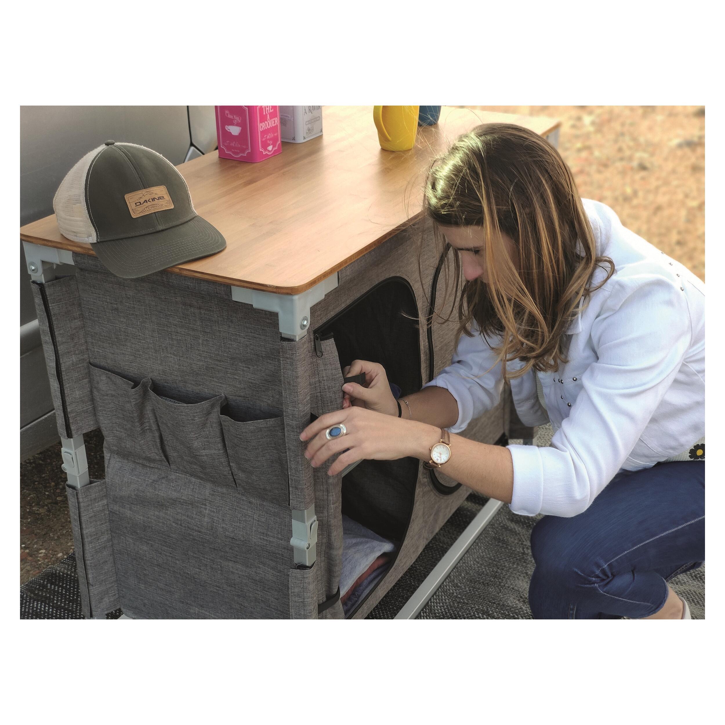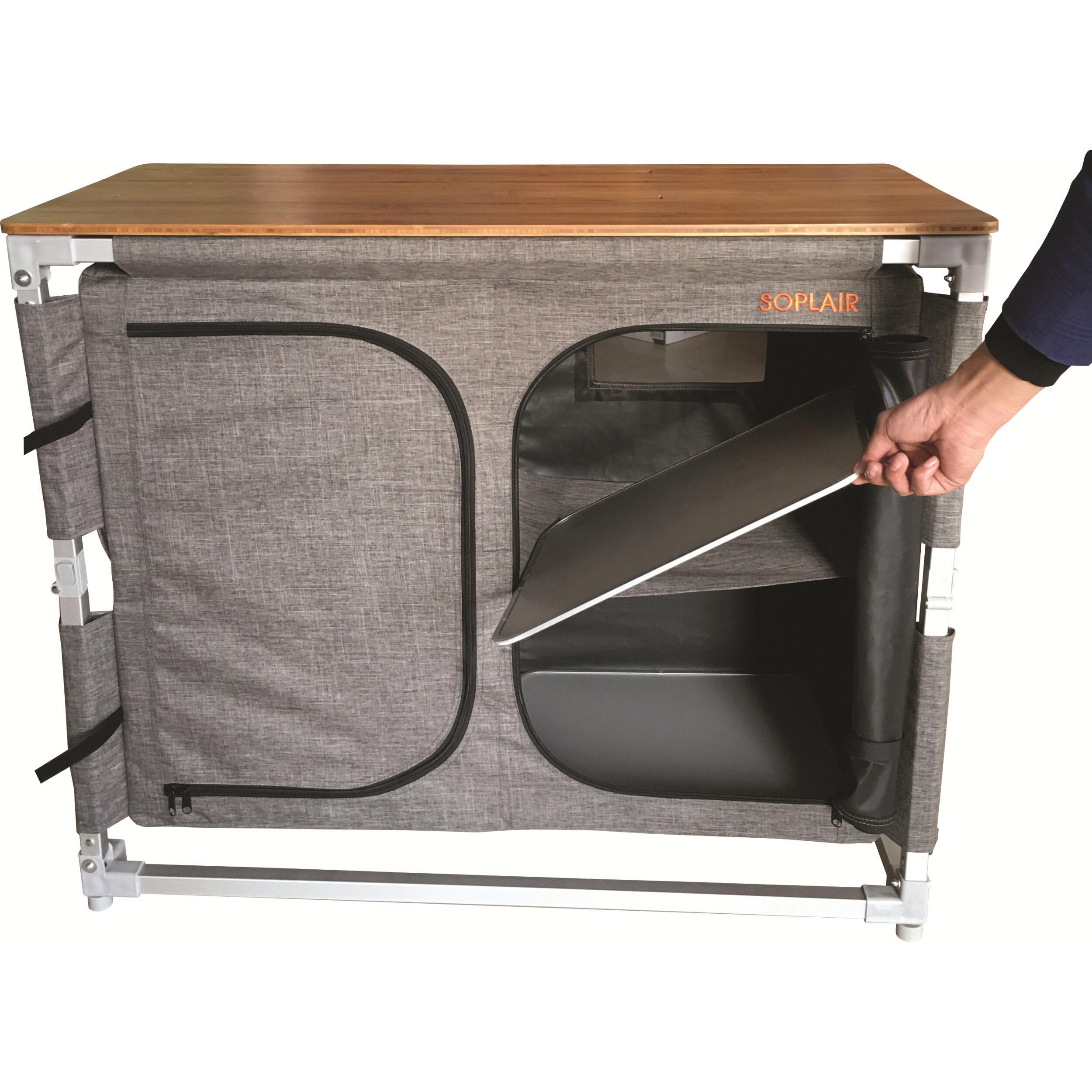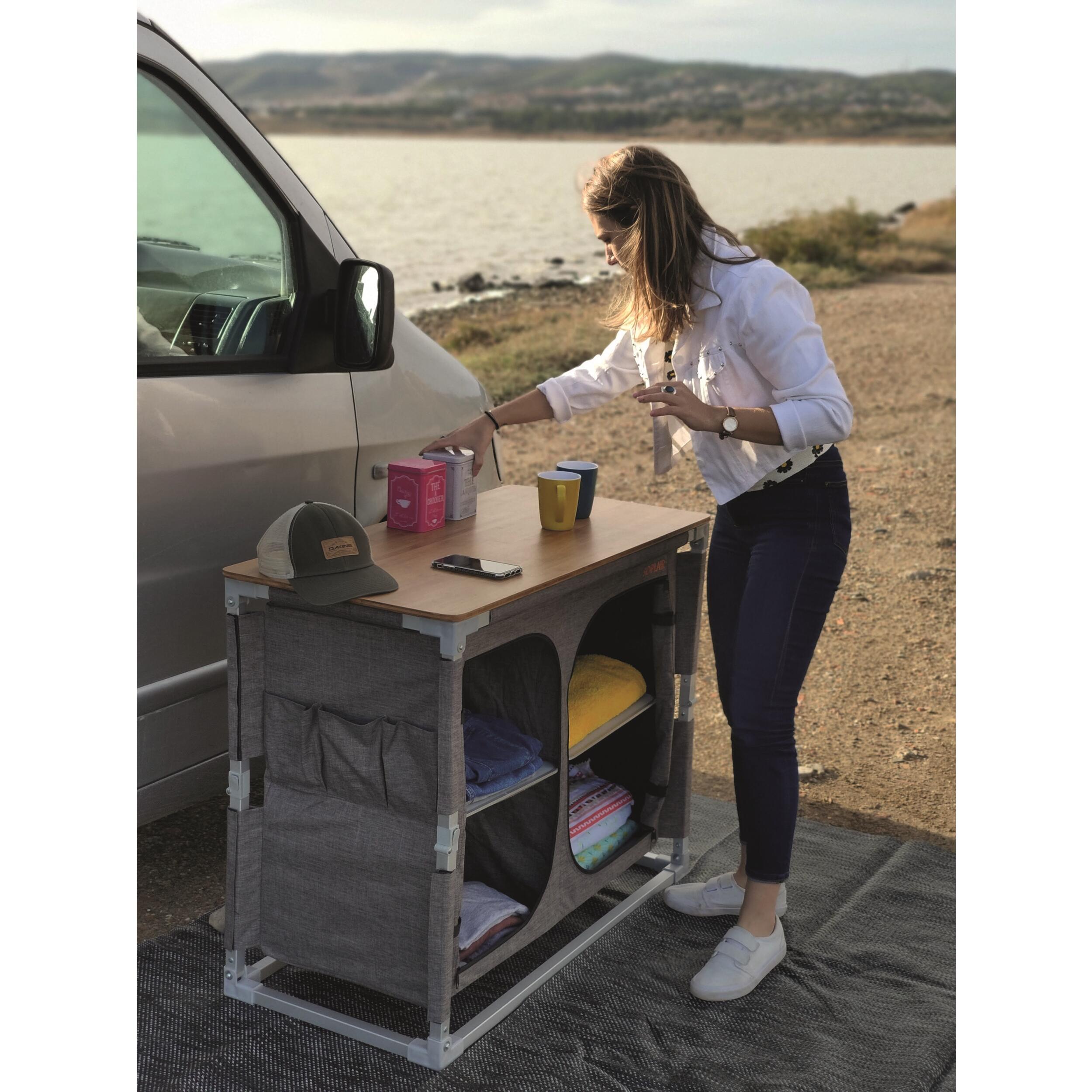 Meuble de rangement avec plateau en bambou naturel parfait pour le camping. Ultra pratique grâce à son système de pliage / dépliage facile et rapide. Mise en place et rangement en seulement quelques secondes ! Il dispose de quatre espaces de rangement distincts et de petites poches sur chacun des côtés. Sa toile résistante en polyester enduit PVC possède des aérations afin d’éviter les odeurs de renfermé. Son plan de travail en bambou lui donne un côté raffiné.