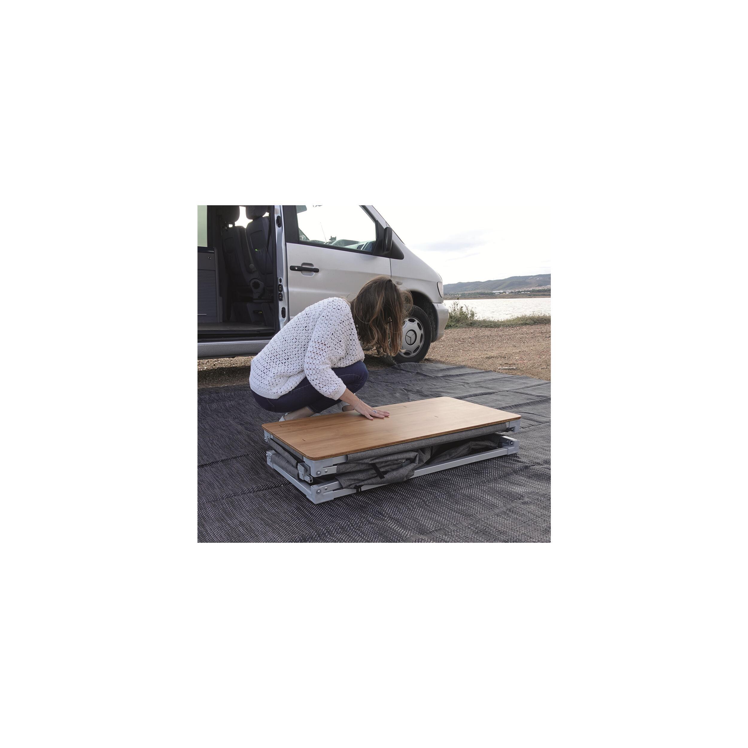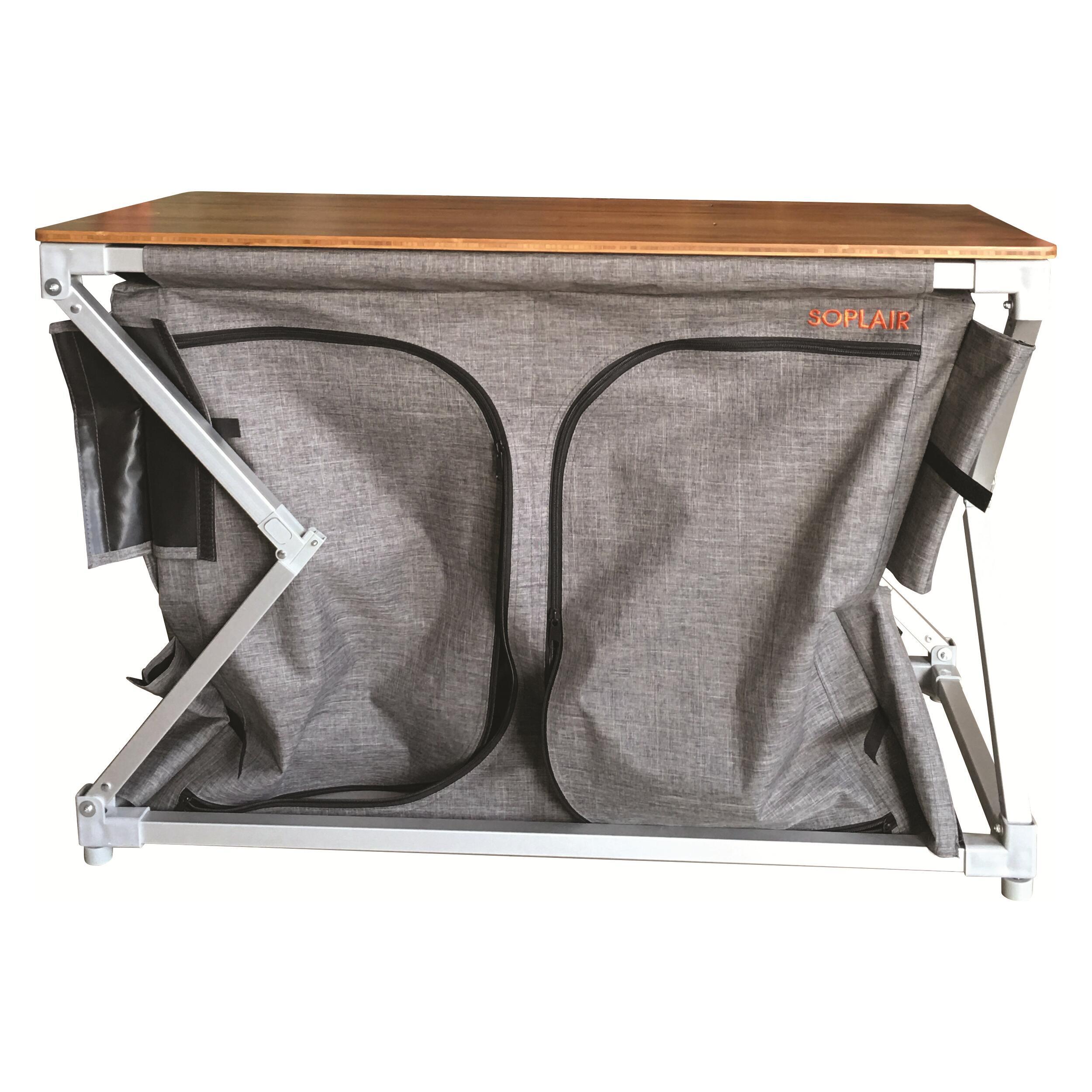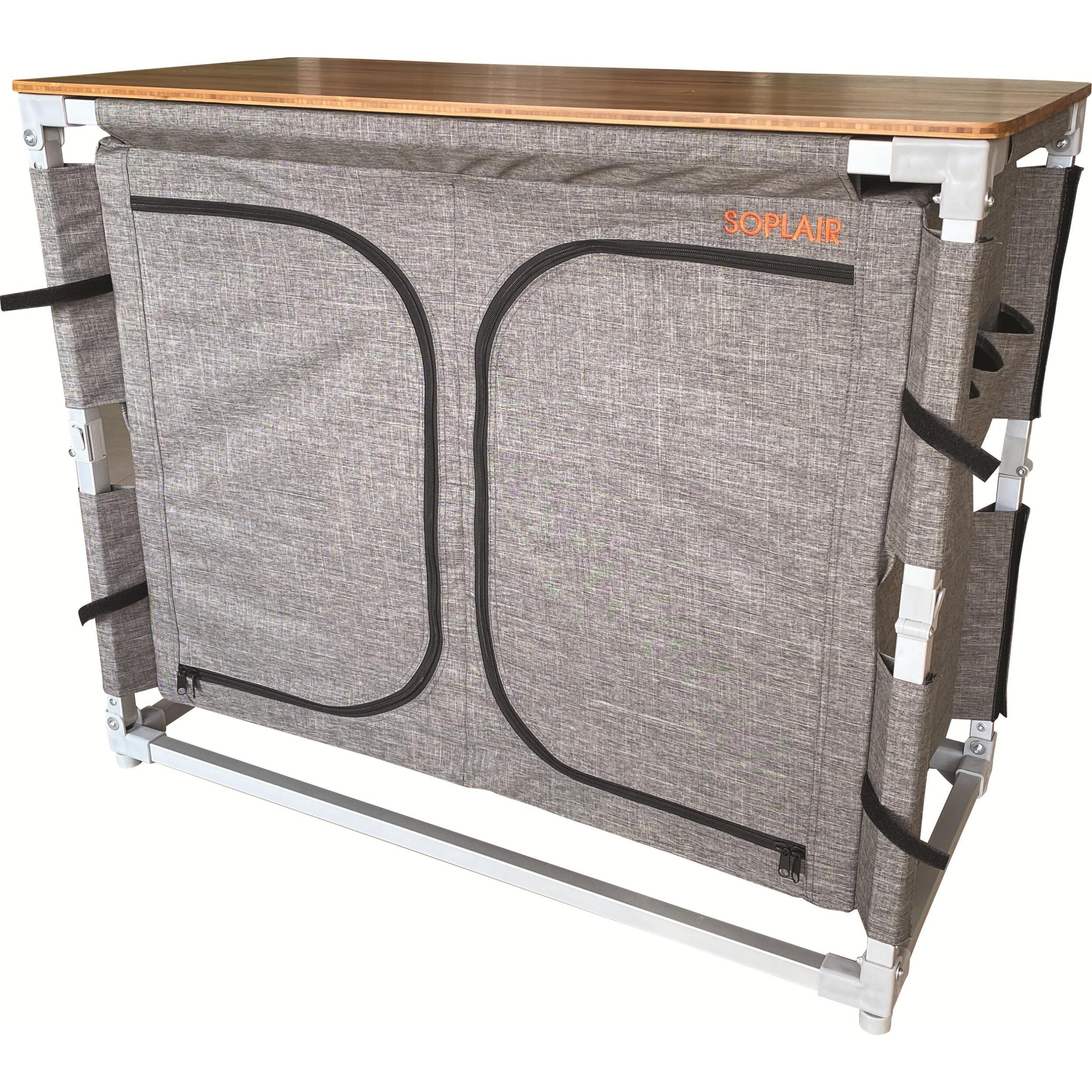 Meuble de rangement avec plateau en bambou naturel parfait pour le camping. Ultra pratique grâce à son système de pliage / dépliage facile et rapide. Mise en place et rangement en seulement quelques secondes ! Il dispose de quatre espaces de rangement distincts et de petites poches sur chacun des côtés. Sa toile résistante en polyester enduit PVC possède des aérations afin d’éviter les odeurs de renfermé. Son plan de travail en bambou lui donne un côté raffiné.