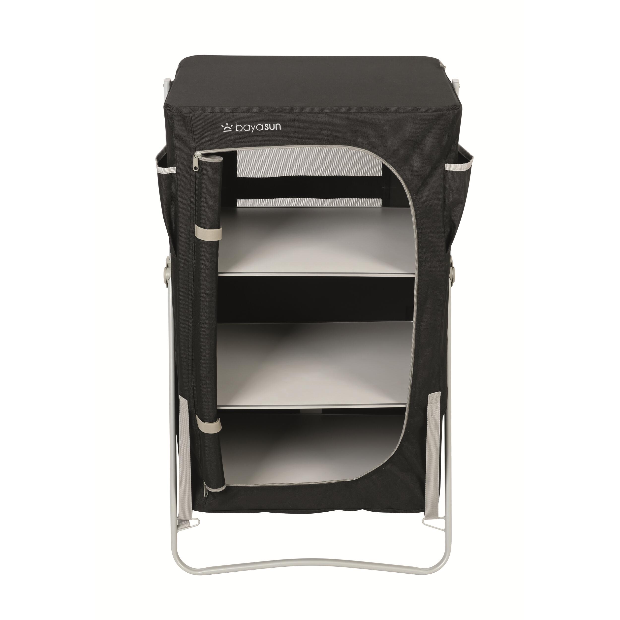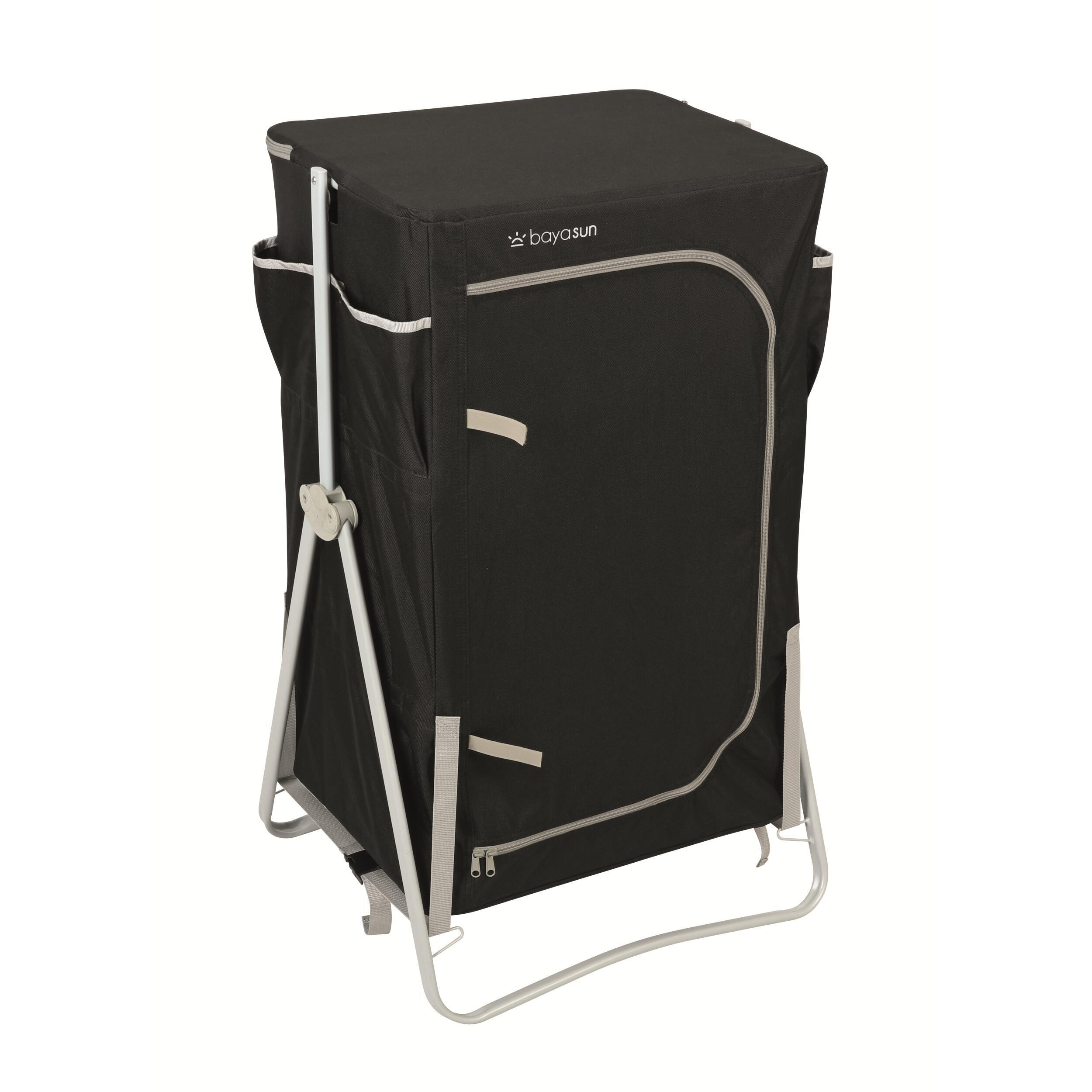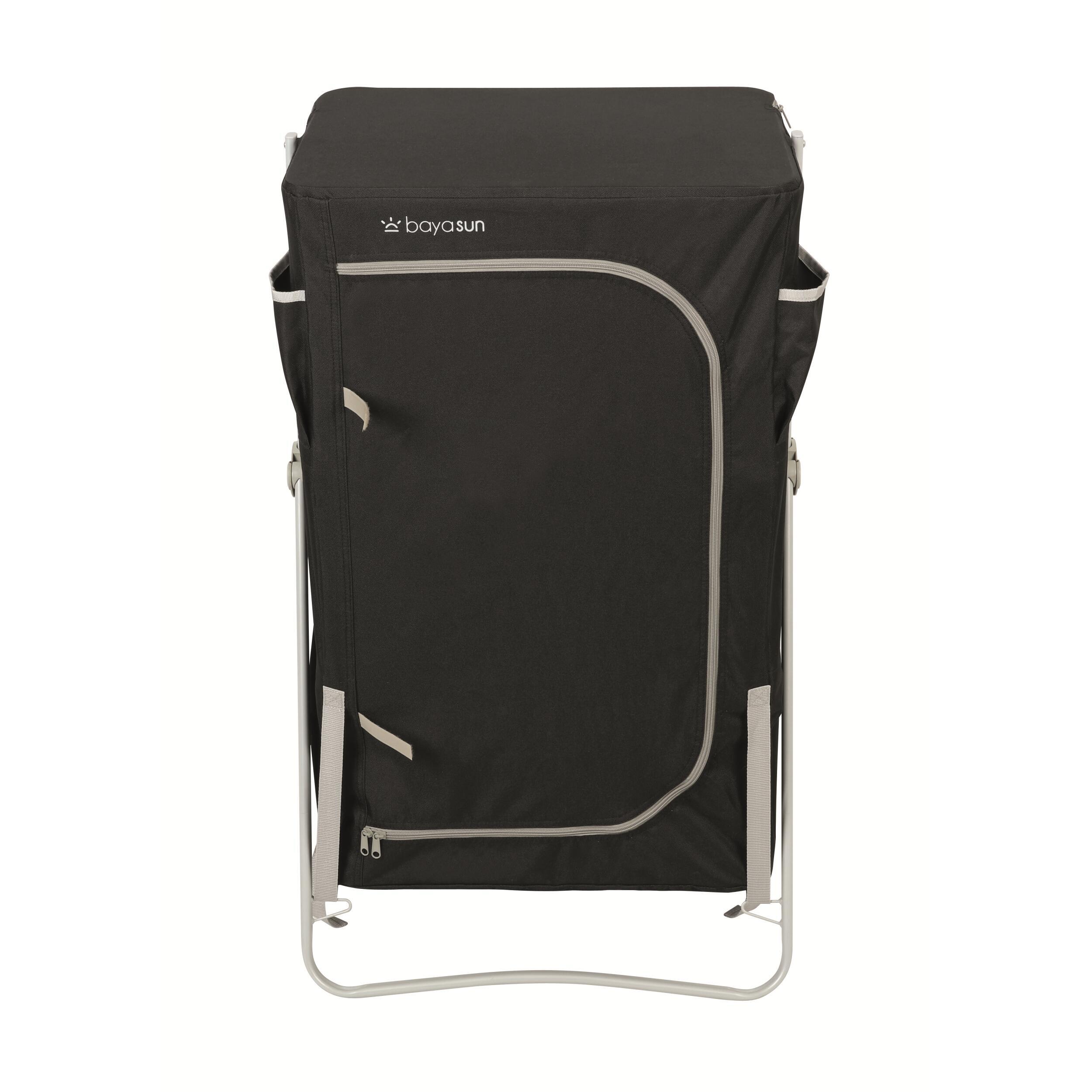Meuble de rangement pliant Baya Sun avec structure acier, toile polyester 600D aérée, poches latérales, pieds réglables et sac de transport inclus.