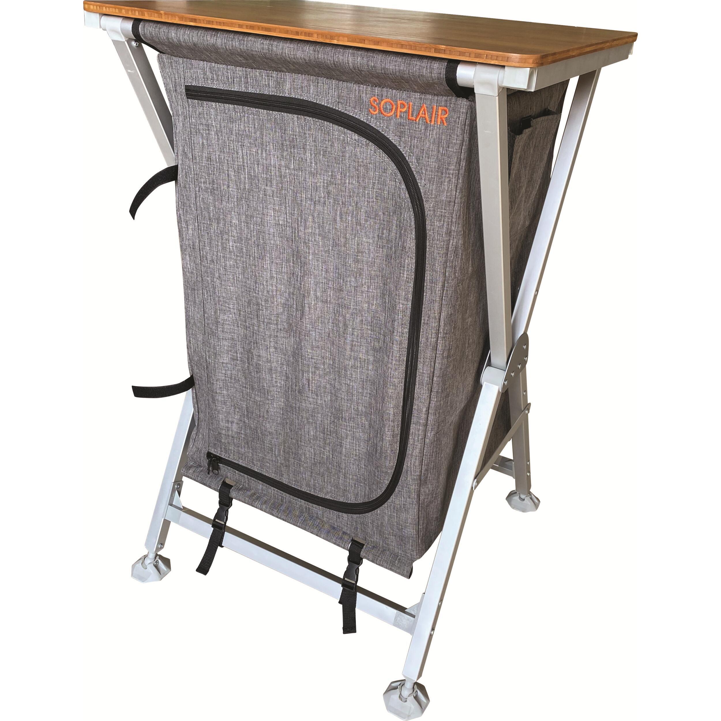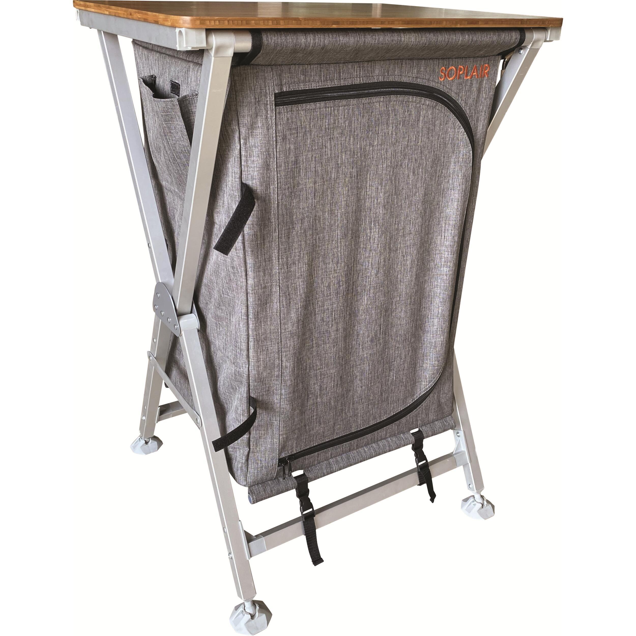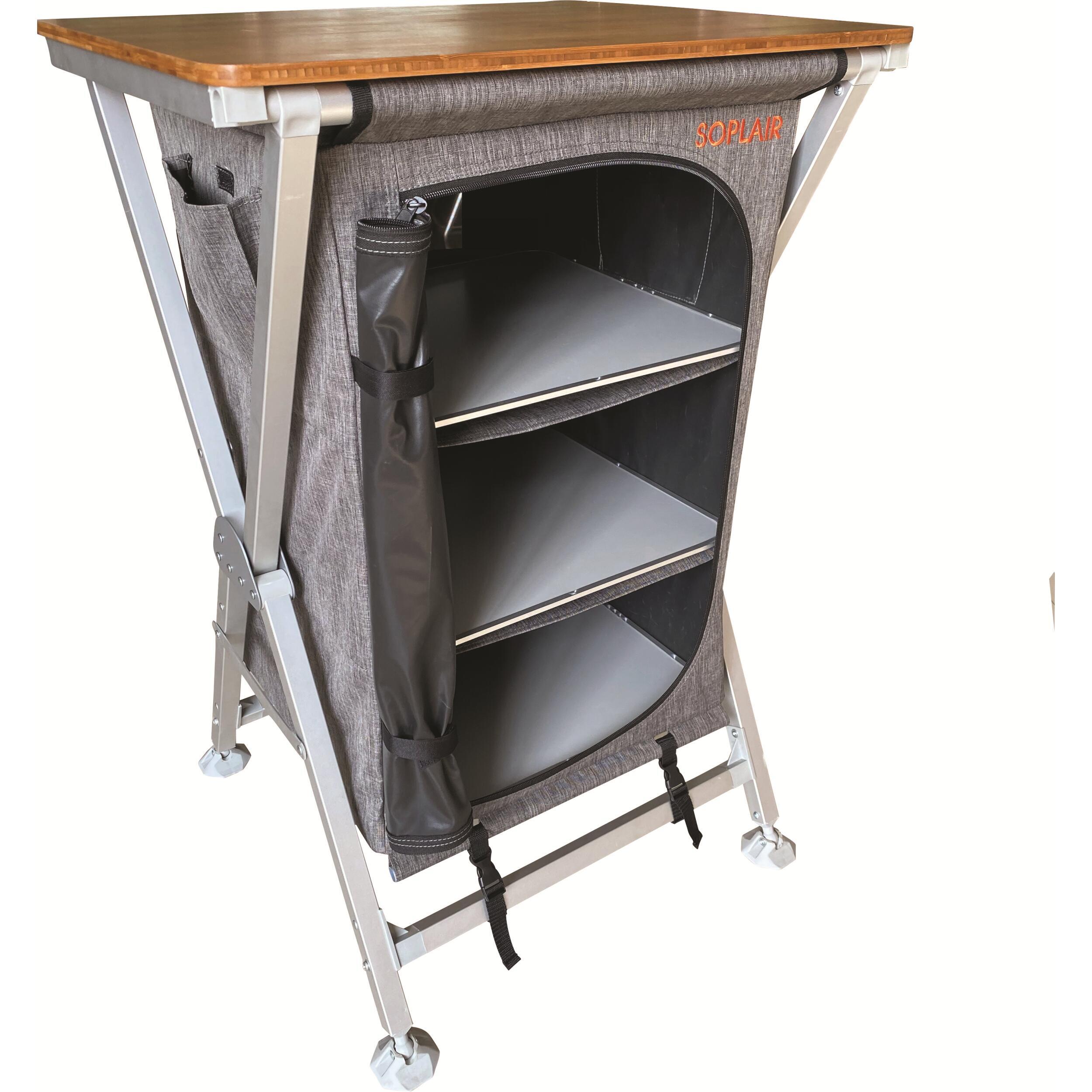 Meuble de rangement avec plateau en bambou naturel et armature pliante en aluminium. Equipé de trois espaces de rangement et d’une poche de chaque côté. Son plateau en bambou lui donne un côté chaleureux. Sa toile en polyester enduit PVC possède des aérations afin d’éviter les odeurs de renfermé. Ses pieds à tête rotative vous permettent d’ajuster le meuble aux variations des sols. Pliage simple et compact.