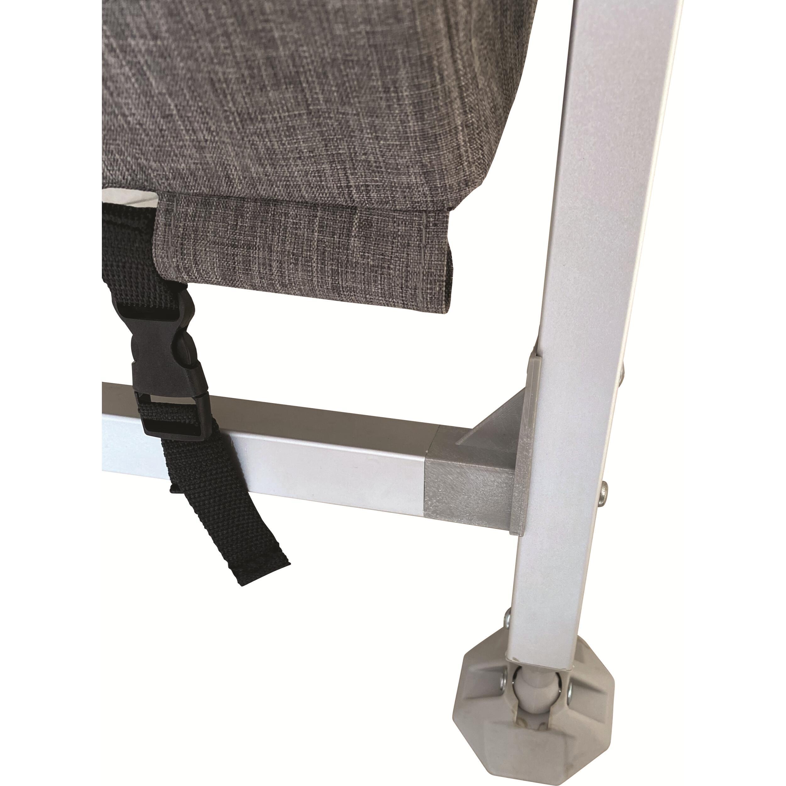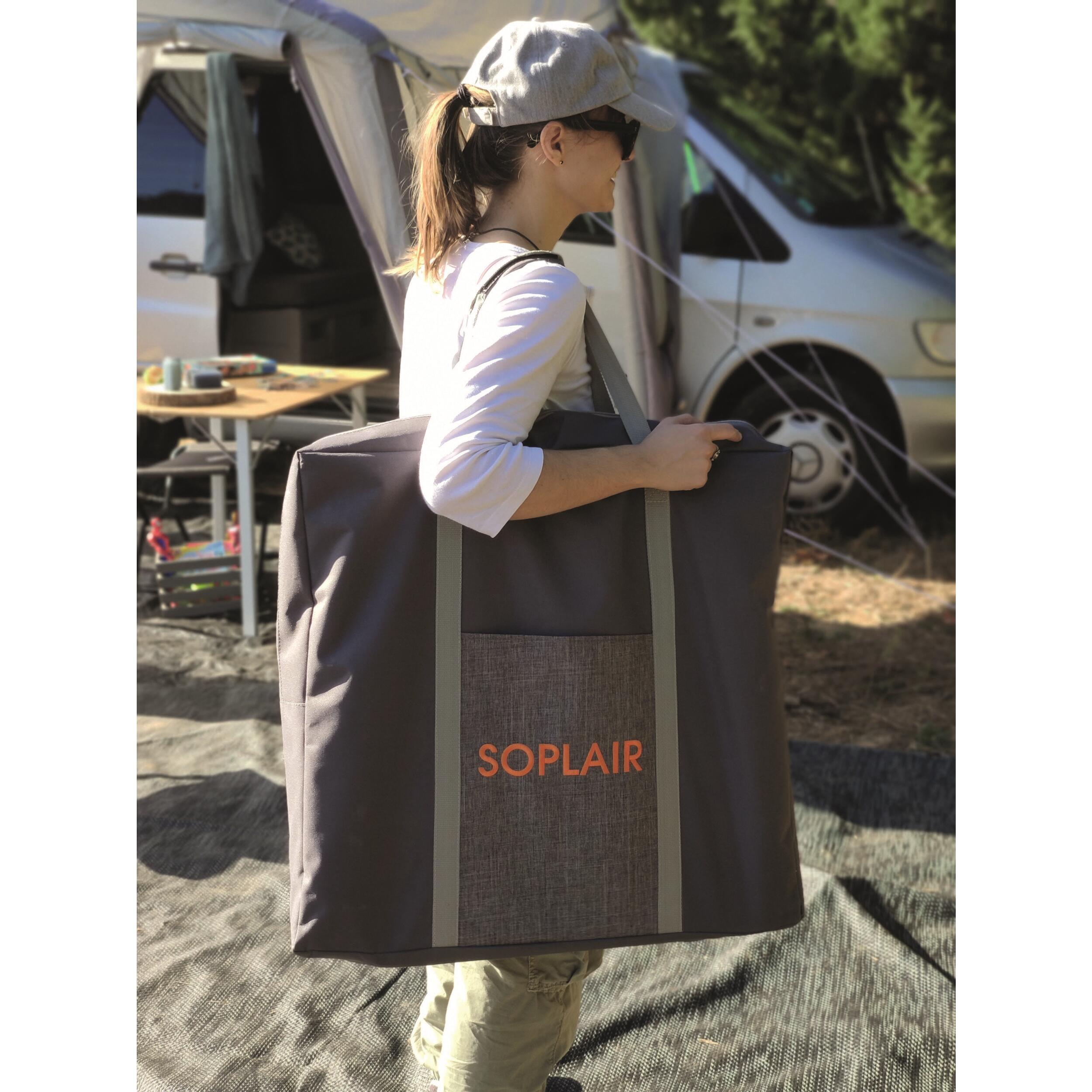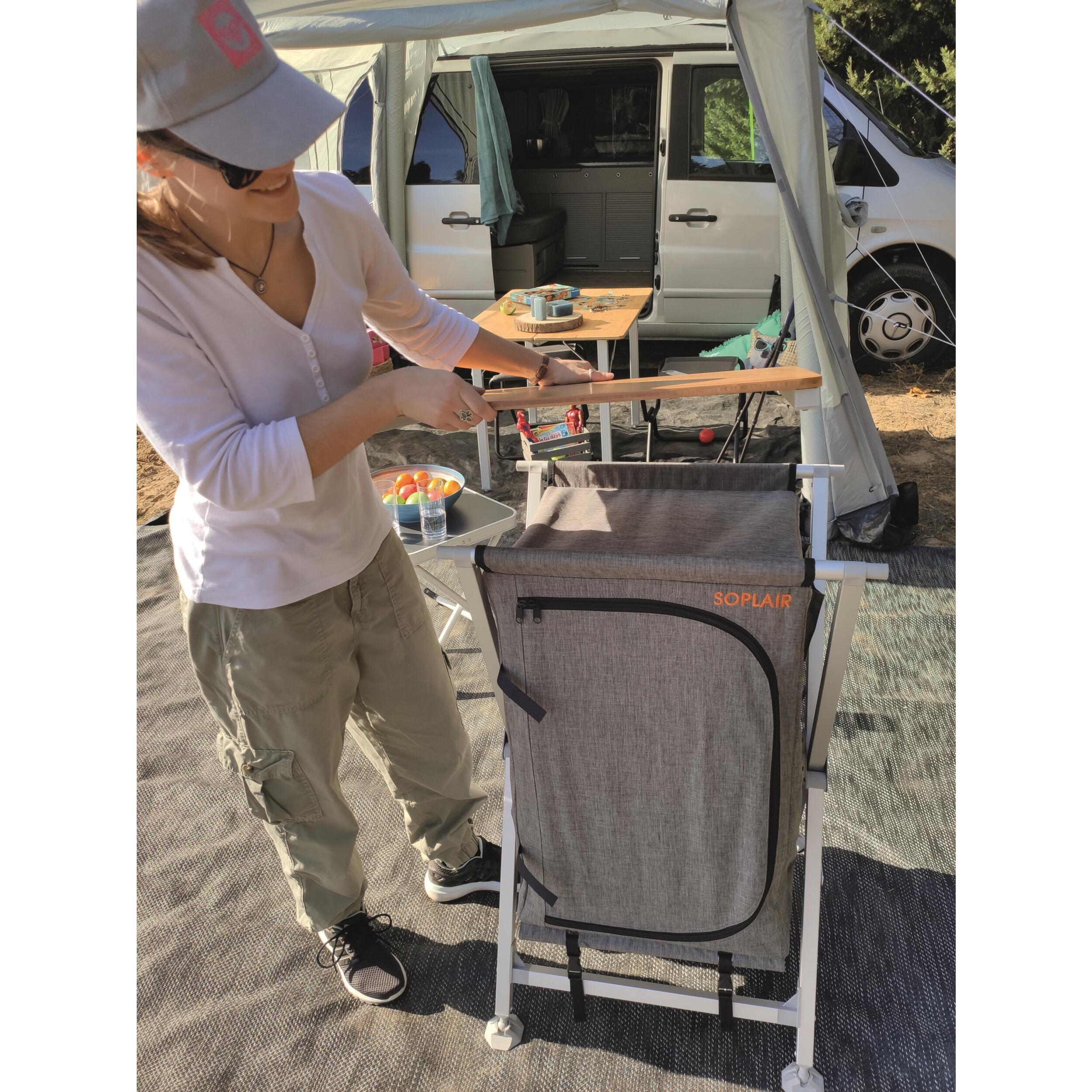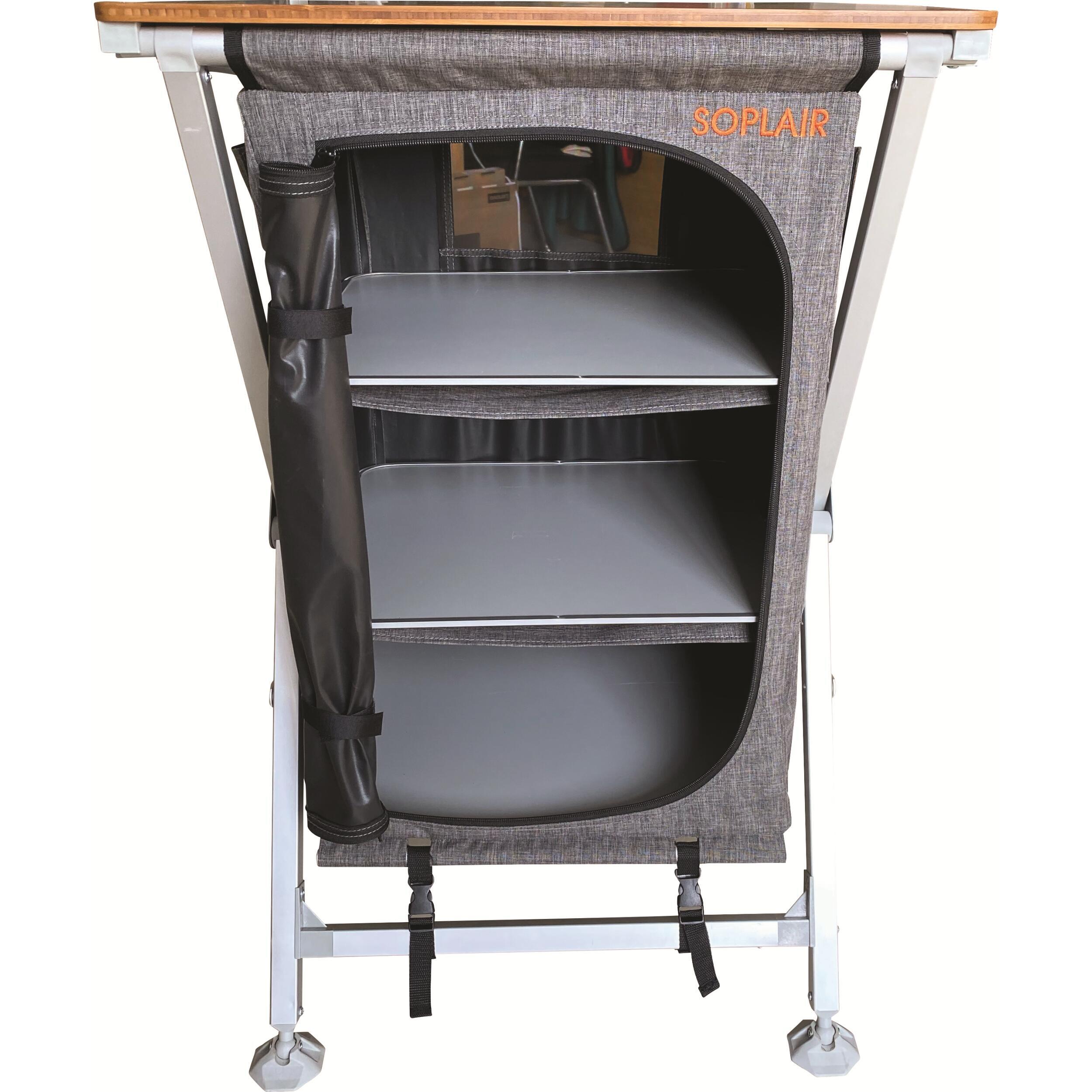 Meuble de rangement avec plateau en bambou naturel et armature pliante en aluminium. Equipé de trois espaces de rangement et d’une poche de chaque côté. Son plateau en bambou lui donne un côté chaleureux. Sa toile en polyester enduit PVC possède des aérations afin d’éviter les odeurs de renfermé. Ses pieds à tête rotative vous permettent d’ajuster le meuble aux variations des sols. Pliage simple et compact.