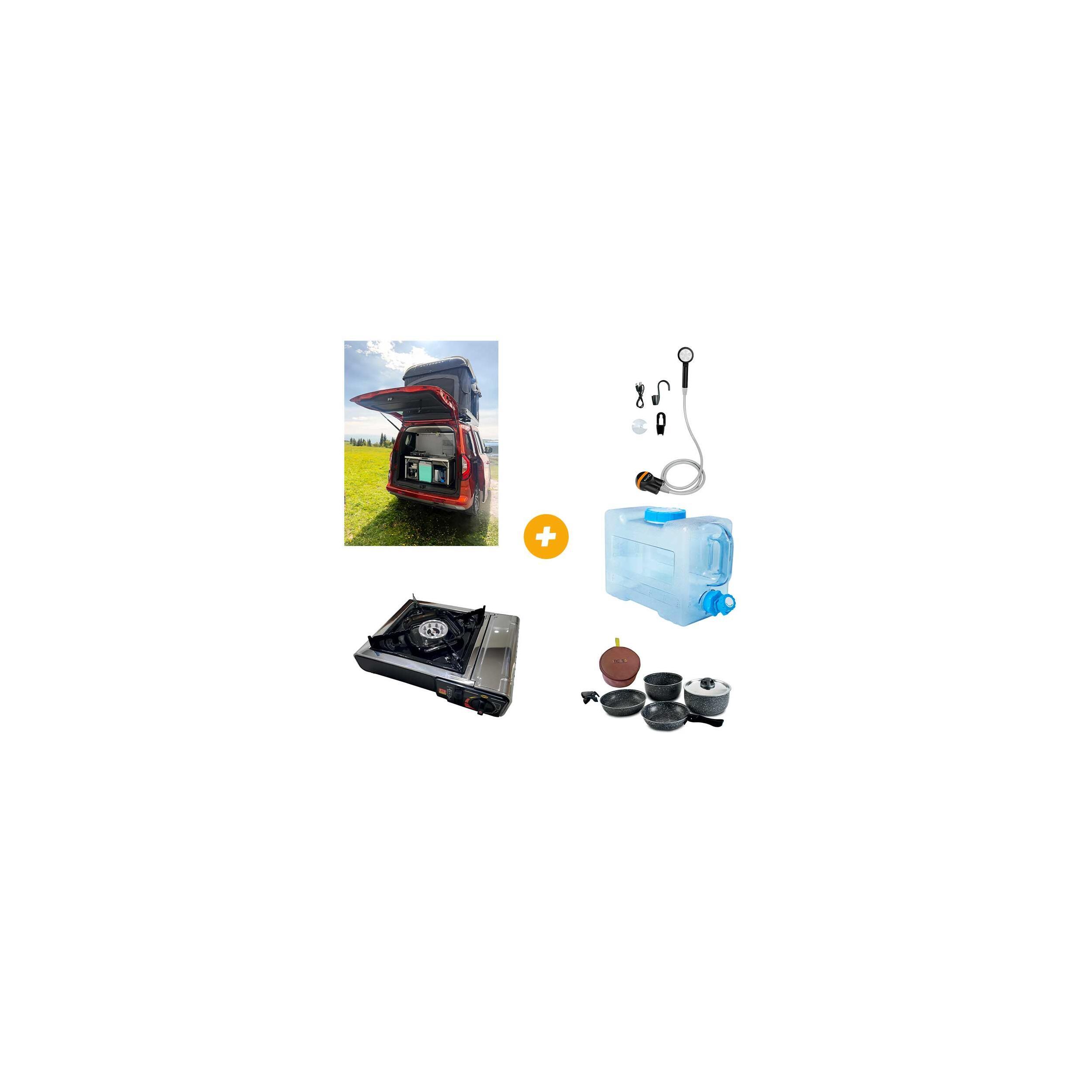 Le pack Kitch&Box 95 x 50 cm + Accessoires inclut tout le nécessaire pour cuisiner en plein air avec un meuble de cuisine modulable, une douche portable, un réchaud à gaz, un réservoir d'eau et une popote duo 8 pièces.