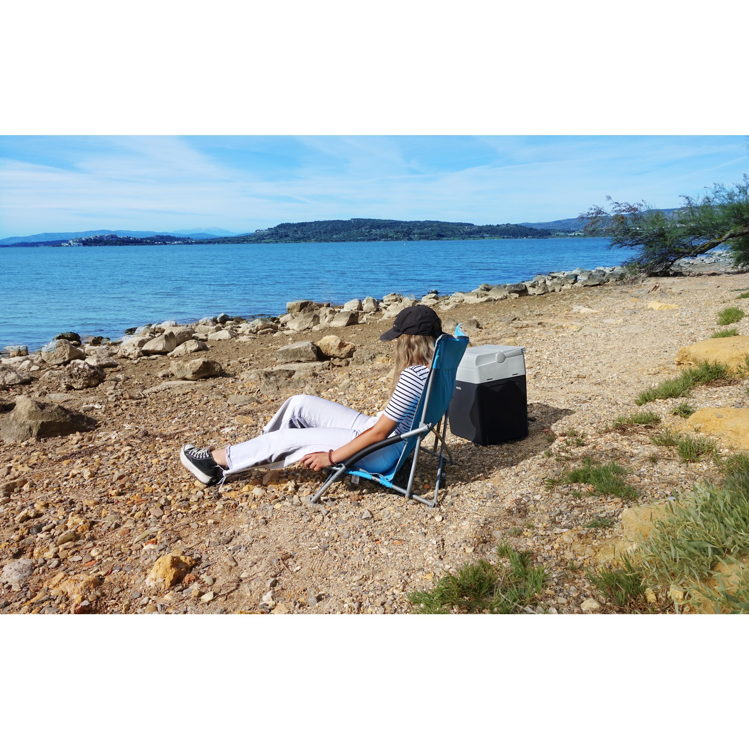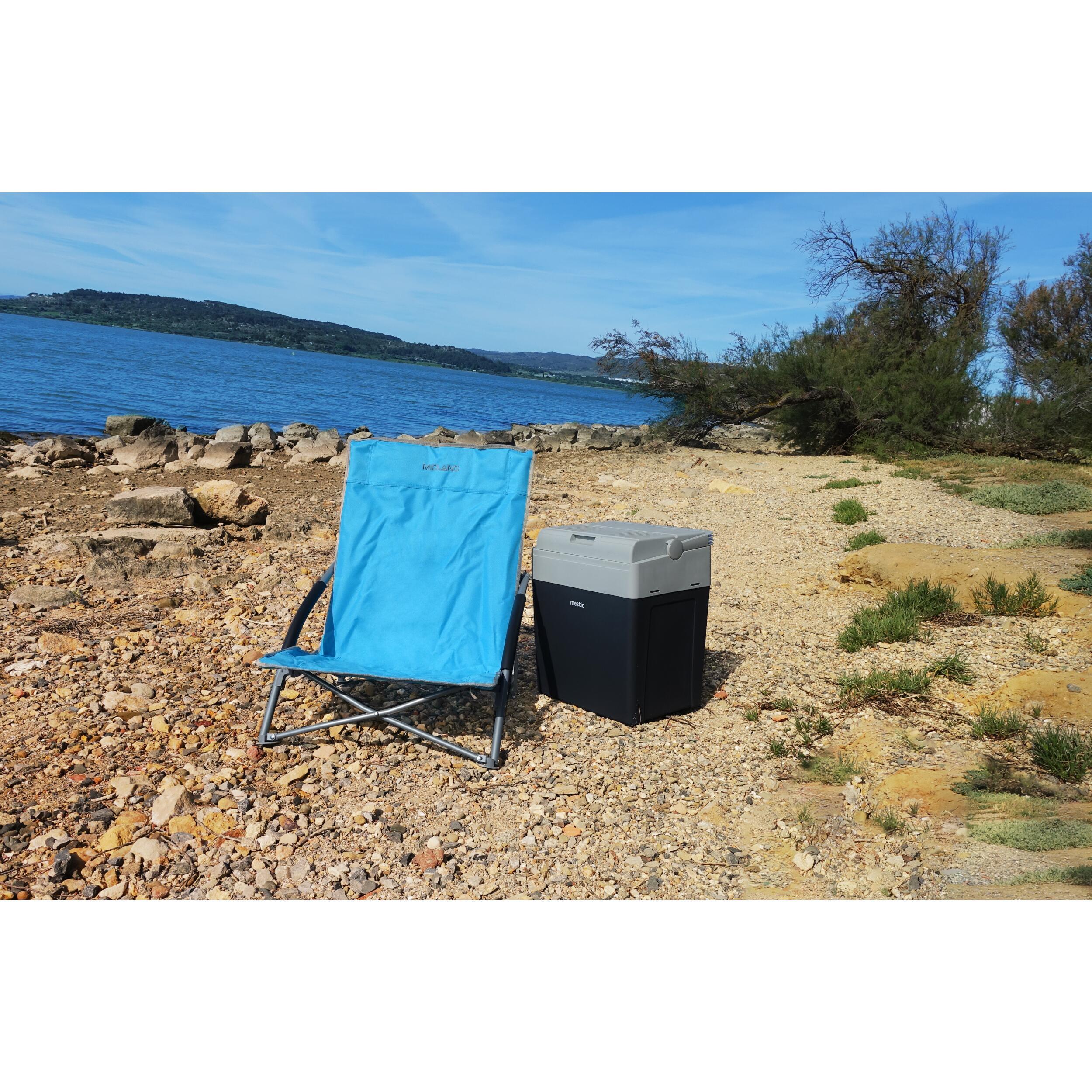 Siège de plage avec pieds larges spécialement conçus pour les sols meubles. Accoudoirs en mousse résistants facilitant la levée. Toile en polyester 600D et armature en acier tubes ronds diamètre 19, 16 et 13 mm.