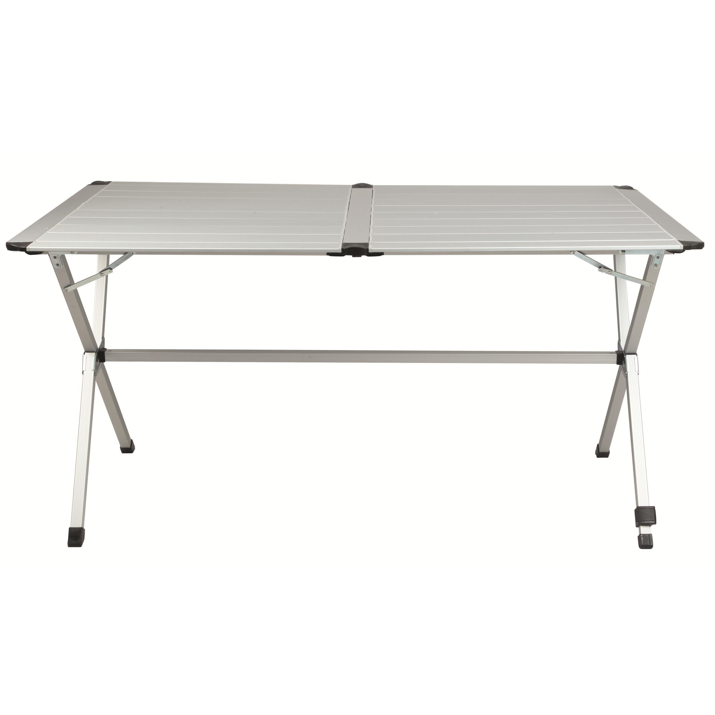 Table avec châssis pliant et plateau à lamelles aluminium enroulables. Le système de crémaillères "Gap Less" permet le maintien parfait de chacune des lamelles : le plateau est parfaitement stable. Le renfort central permet une meilleure stabilité de la structure pliante. 4ème pied réglable en hauteur afin de compenser les irrégularités du terrain. Se monte et se démonte facilement.