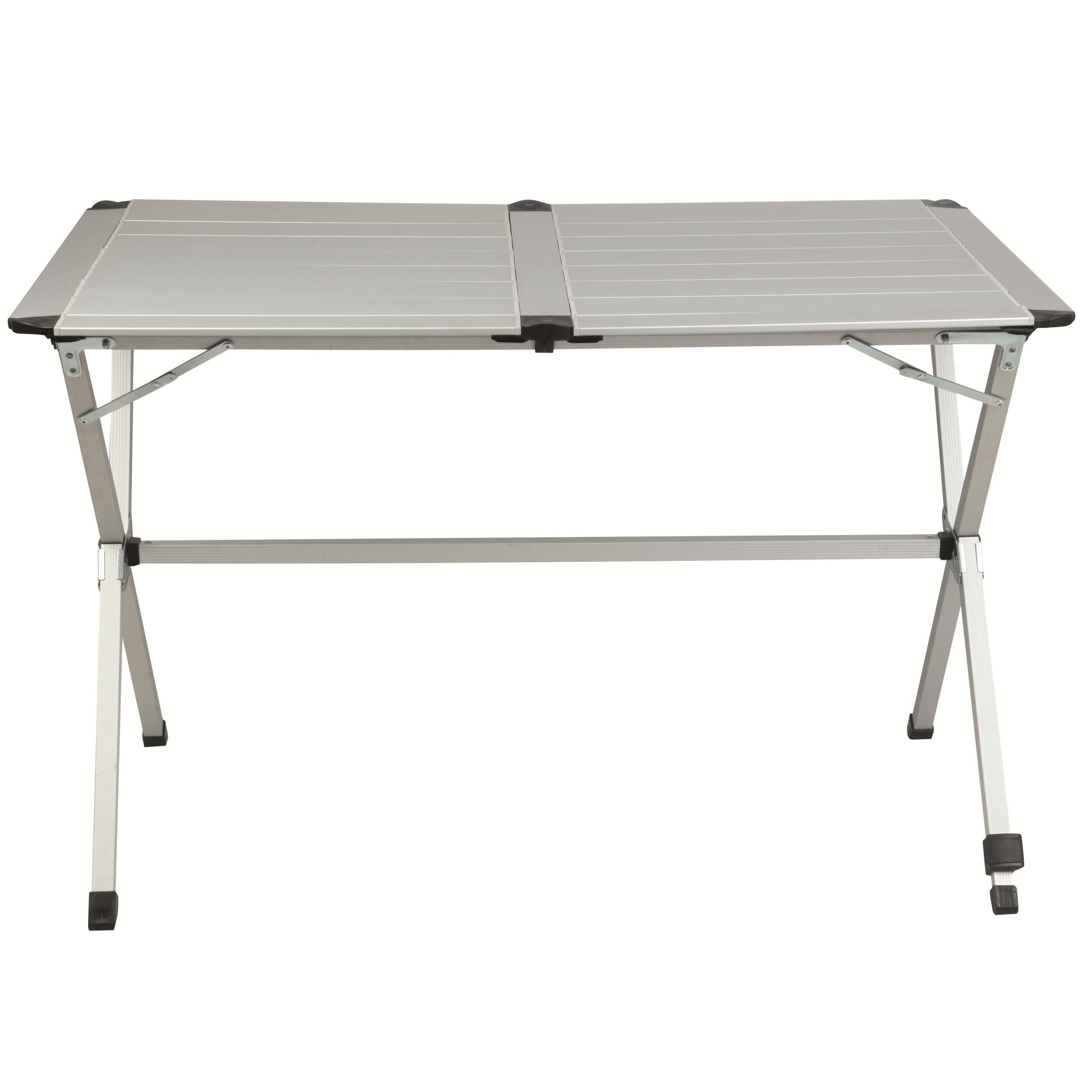 Tables avec châssis pliant et plateau à lamelles aluminium enroulables. Le système de crémaillères "Gap Less" permet le maintien parfait de chacune des lamelles : le plateau est parfaitement stable. Le renfort central permet une meilleure stabilité de la structure pliante. 4ème pied réglable en hauteur afin de compenser les irrégularités du terrain. Se montent et se démontent facilement.