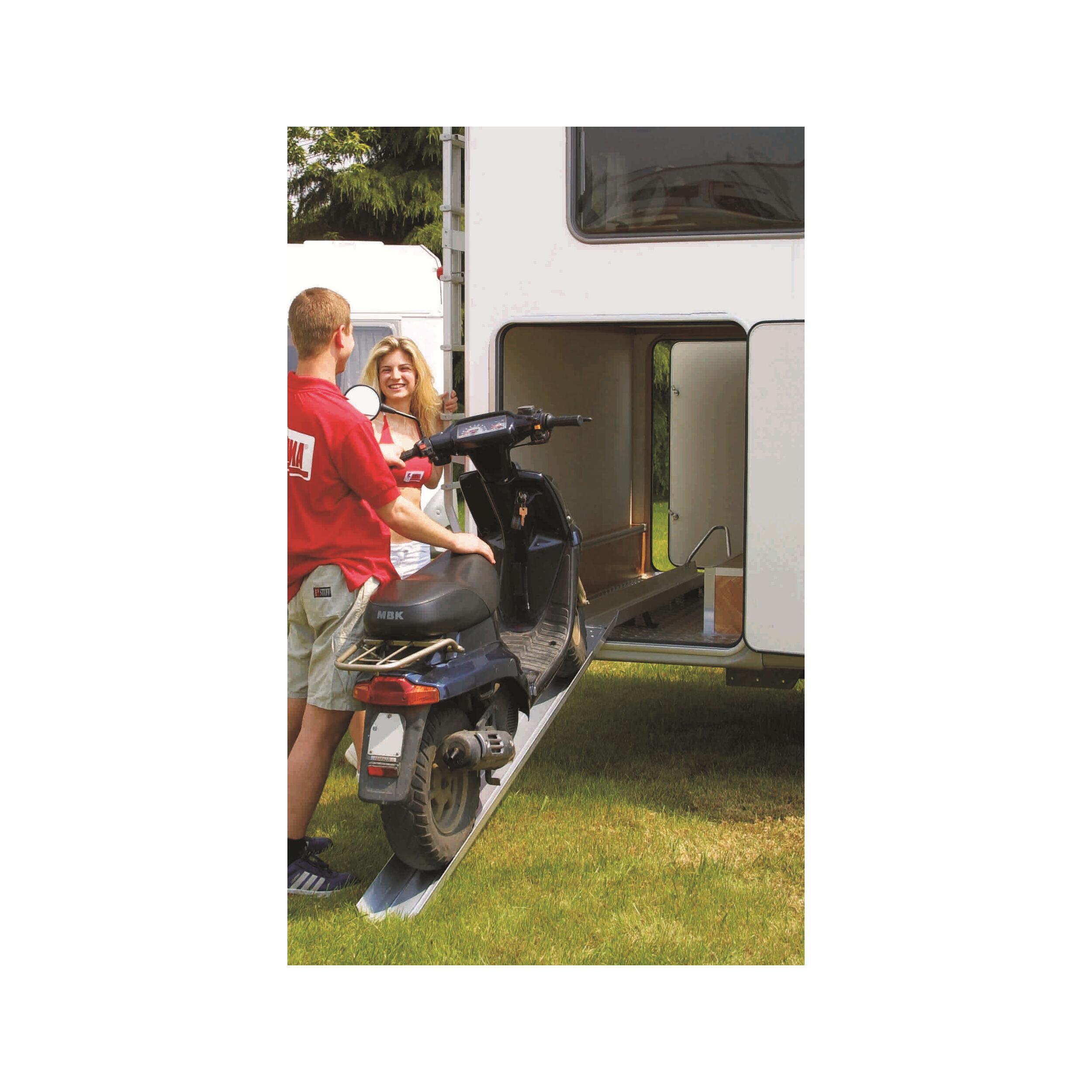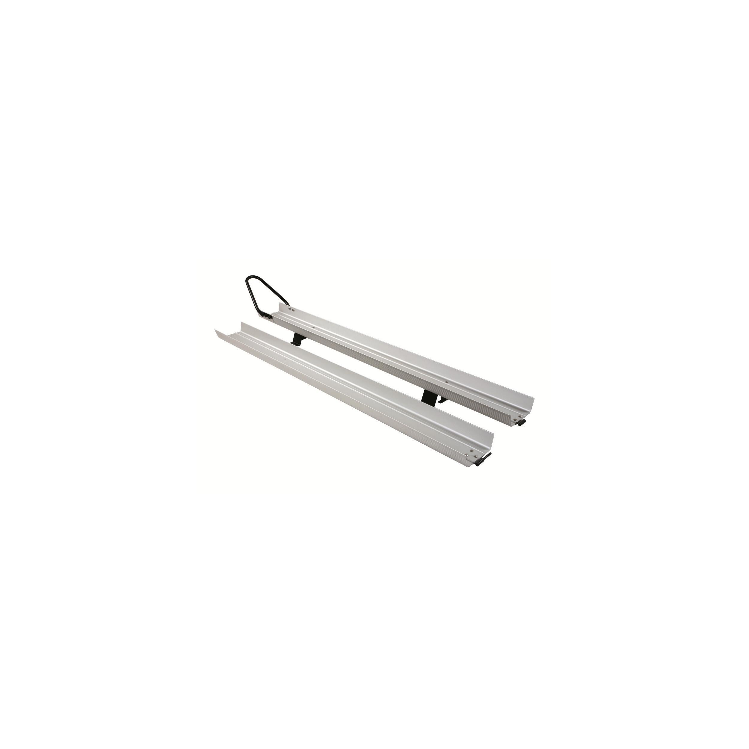 Composé d’un rail porte-moto en aluminium anodisé et d’une rampe d’accès facilement encastrable sur le rail, conçu pour être installé dans une soute pour un chargement de la moto plus rapide.