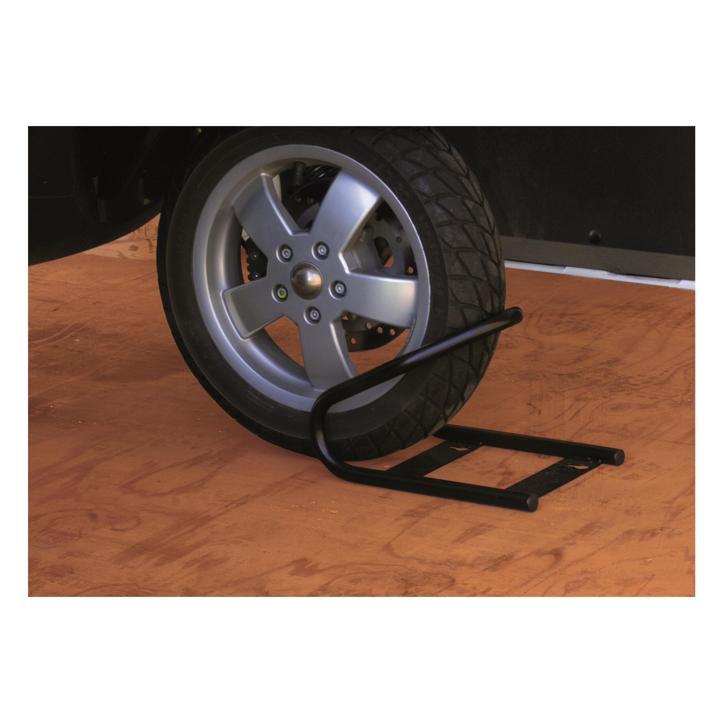 Dispositif de blocage de roue pour votre moto à utiliser avec le Carry-Ramp. En acier verni noir.