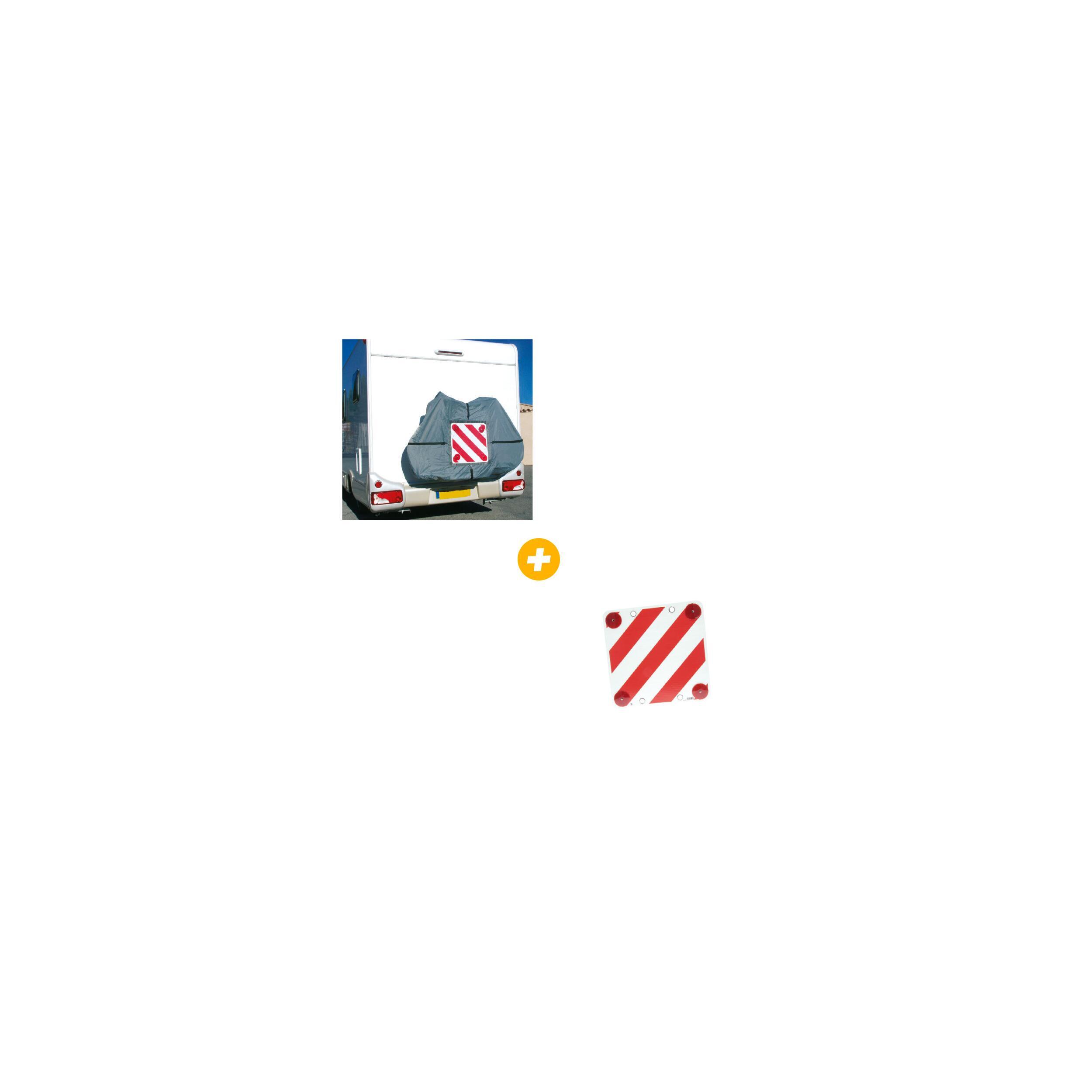 Fenêtre pour panneau réfléchissant. Moins de prise au vent. Moins d'usure de la bâche. Universelle pour porte-vélos camping-car. Sangles réglables.