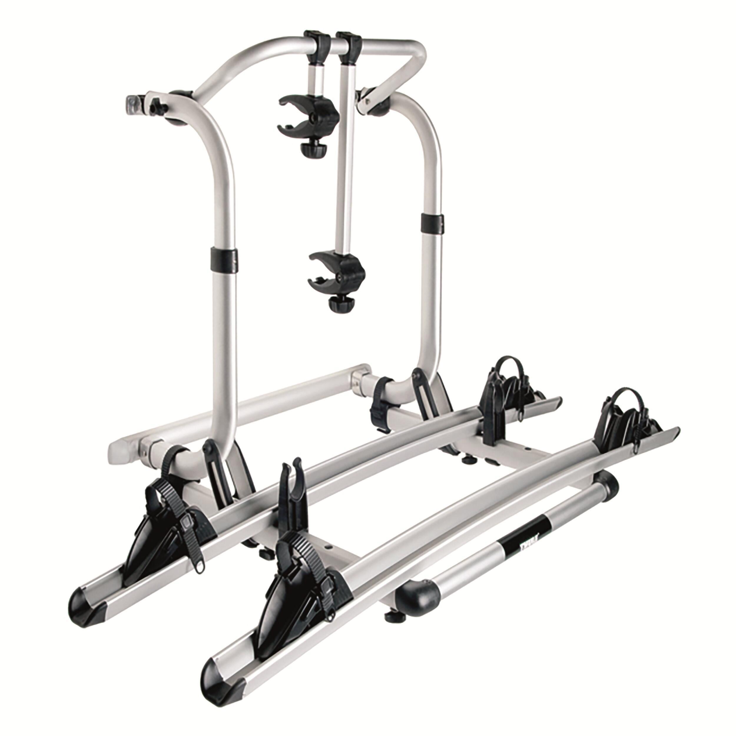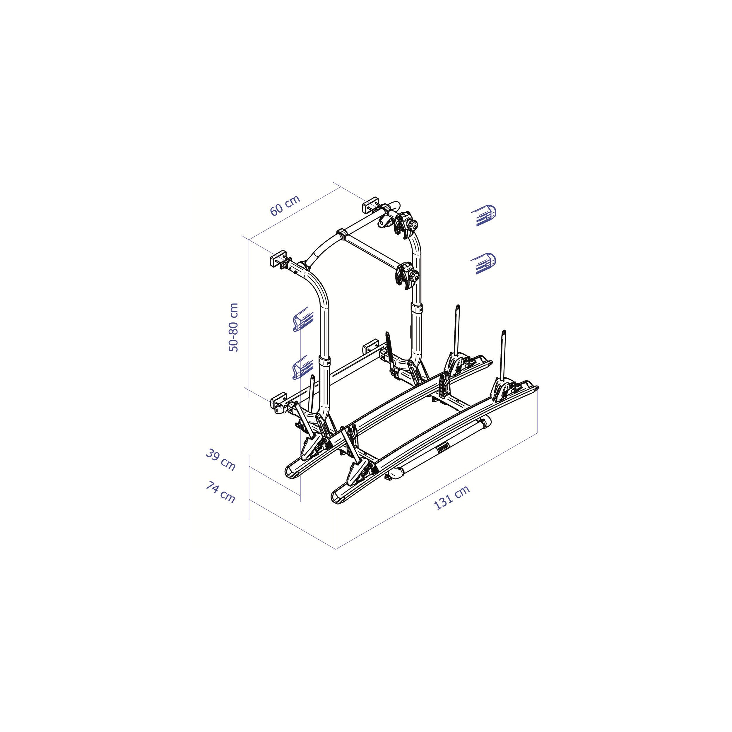Porte 2 vélos avec cadre en aluminium. Extension en porte 3 ou 4 vélos possible. La plateforme est verrouillable et parfaitement stable pendant la route : fixation optimale des vélos. Les rails coulissent de gauche à droite facilitant ainsi le positionnement des vélos. Les supports de roues coulissent également pour faciliter le placement du vélo. Possibilité de verrouiller les barres de maintien grâce aux serrures antivol compatibles.