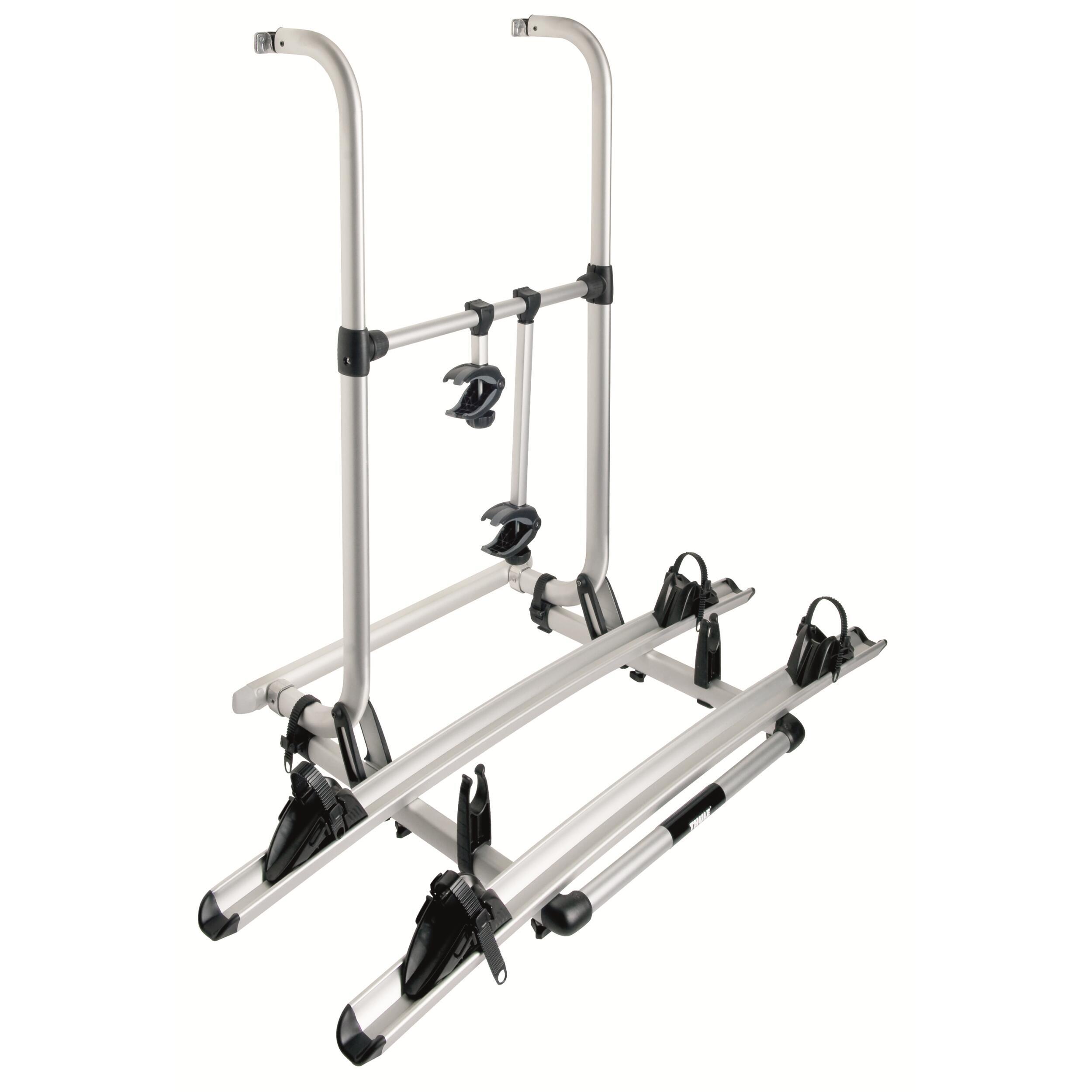 Porte 2 vélos avec cadre en aluminium. Extension en porte 3 ou 4 vélos possible. La plateforme est verrouillable et parfaitement stable pendant la route : fixation optimale des vélos. Les rails coulissent de gauche à droite facilitant ainsi le positionnement des vélos. Les supports de roues coulissent également pour faciliter le placement du vélo. Possibilité de verrouiller les barres de maintien grâce aux serrures antivol compatibles.