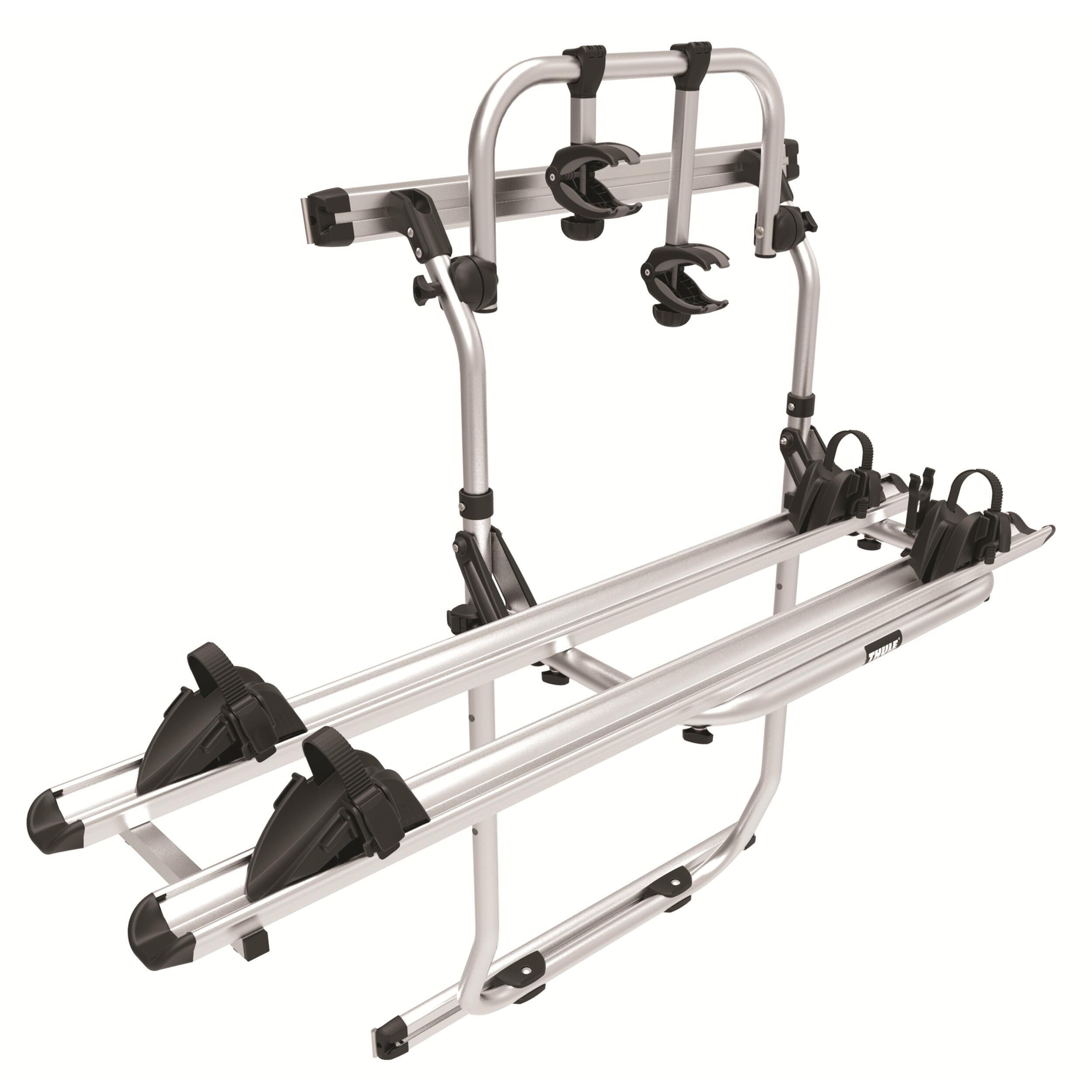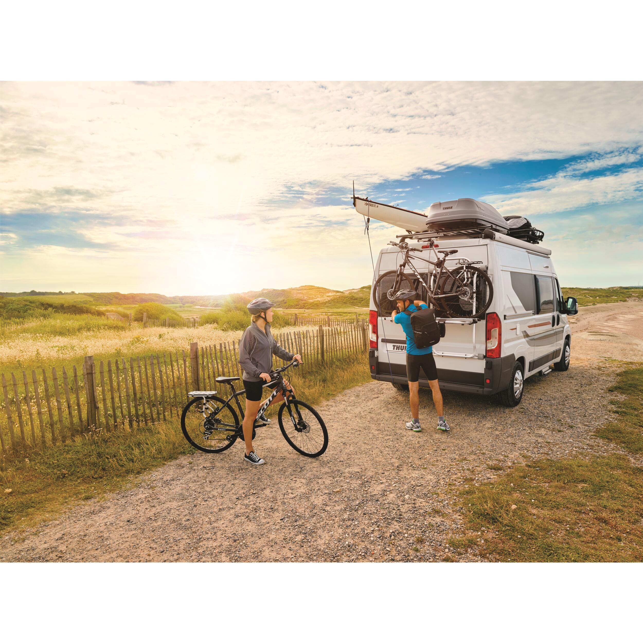 Porte-vélos robuste pour fourgons, sans perçage, permet l’ouverture des portes même chargé, avec bras AcuTight et supports ajustables.