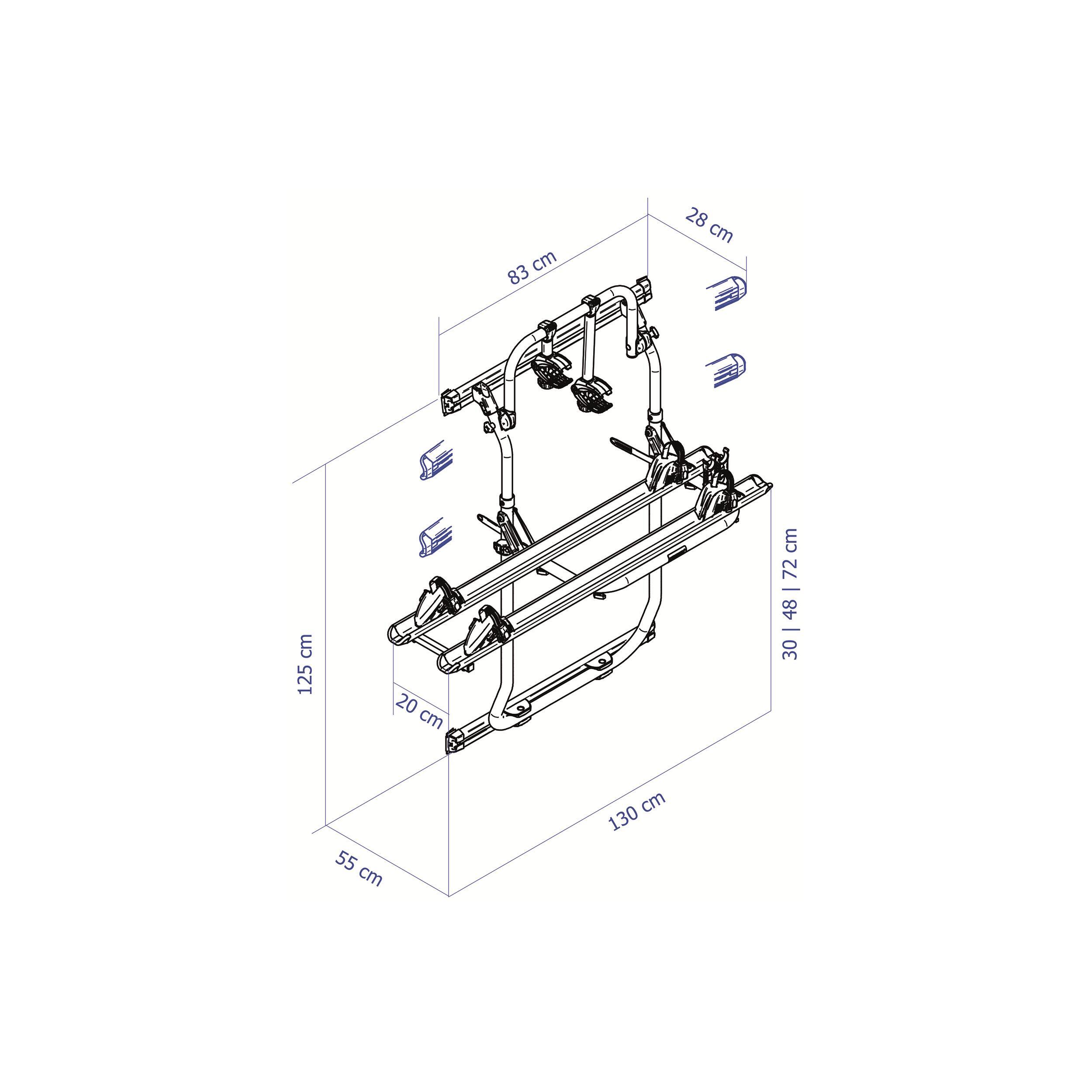 Les rails de support sont espacés de 20 cm, permettant un chargement facile même avec des vélos volumineux. Les sabots de roue sont réglables en longueur, s’adaptant à toutes les tailles de vélos, y compris certains modèles électriques grâce à une capacité de charge individuelle de 19 kg et une charge totale maximale de 35 kg.