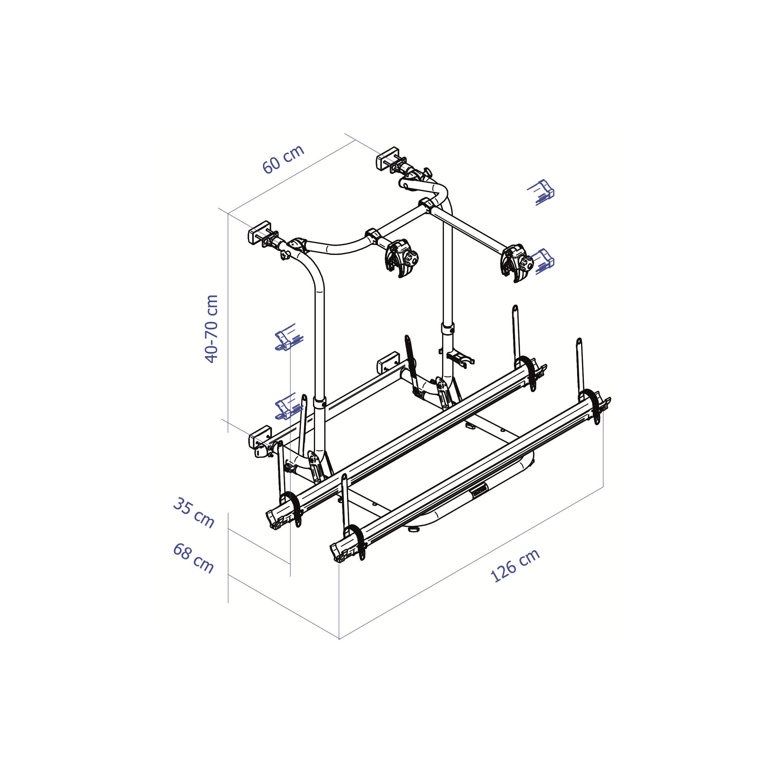 Porte 2 vélos avec cadre en aluminium. Transformable en porte 3 vélos. La plateforme est verrouillable et parfaitement stable pendant la route : fixation optimale des vélos. Les rails coulissent de gauche à droite facilitant ainsi le positionnement des vélos. Possibilité de verrouiller les barres de maintien grâce aux serrures antivol. Montage possible sur pattes de fixation Fiamma pré-montées sur certains véhicules.