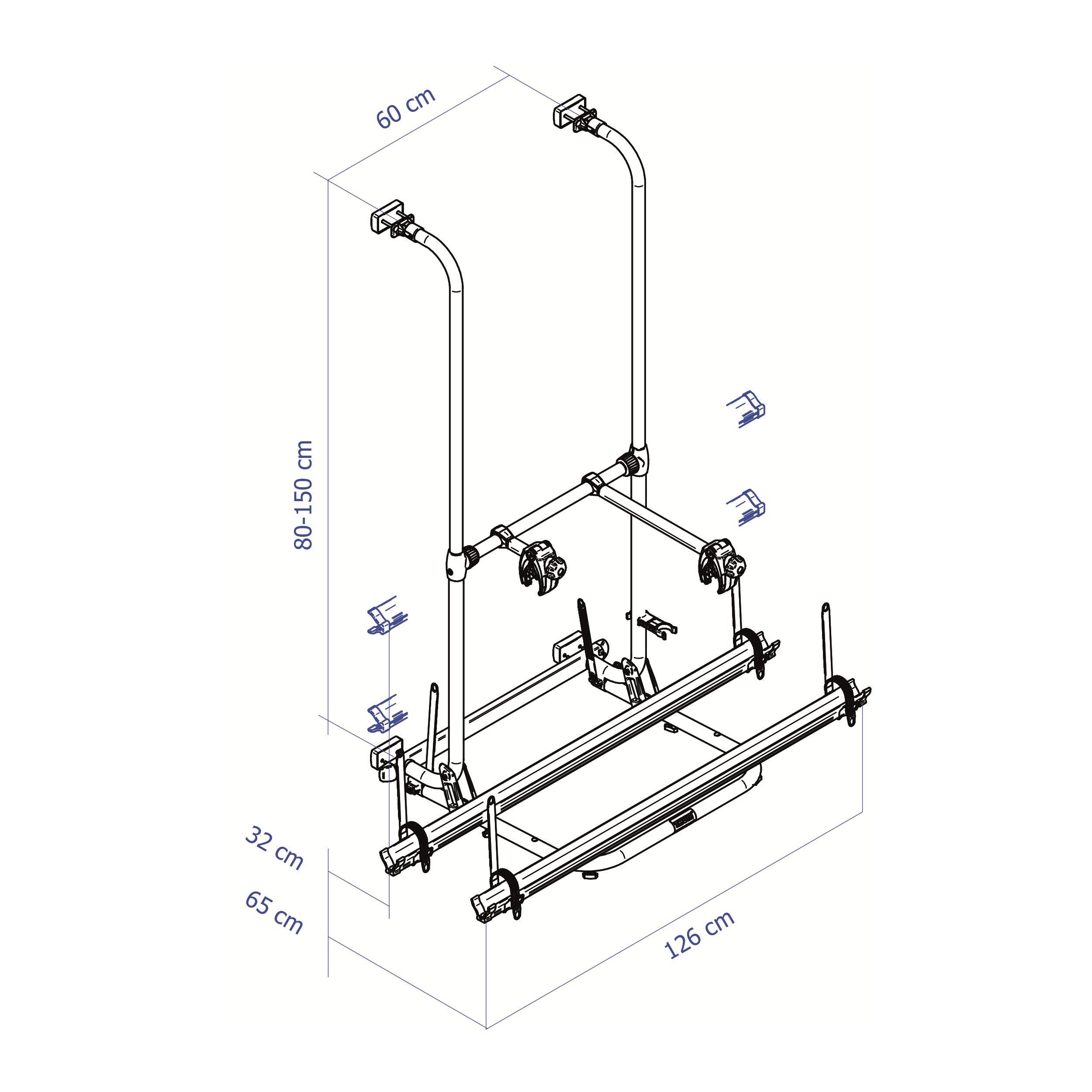 Porte 2 vélos avec cadre en aluminium. Transformable en porte 3 vélos. La plateforme est verrouillable et parfaitement stable pendant la route : fixation optimale des vélos. Les rails coulissent de gauche à droite facilitant ainsi le positionnement des vélos. Possibilité de verrouiller les barres de maintien grâce aux serrures antivol. Montage possible sur pattes de fixation Fiamma pré-montées sur certains véhicules.