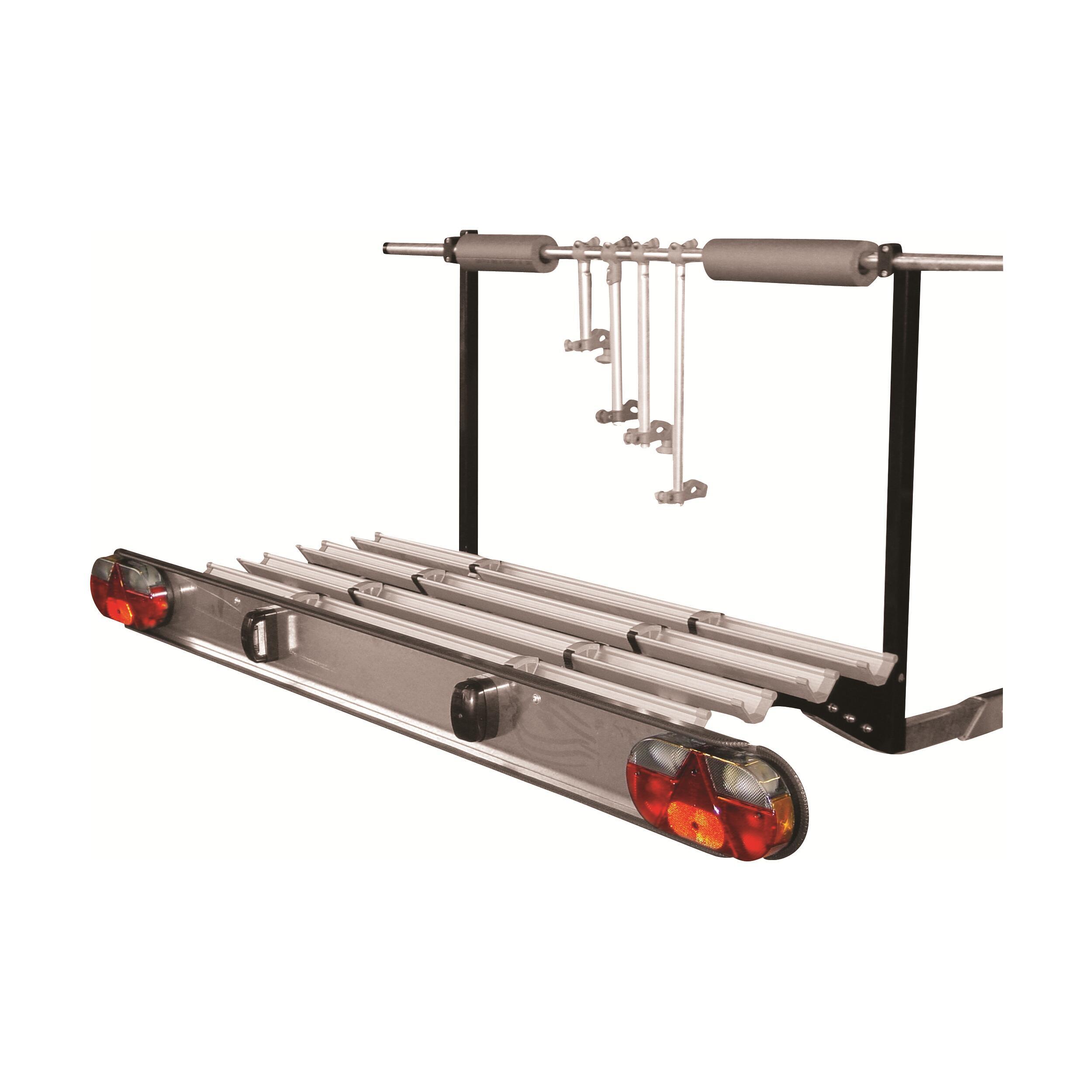 Porte 3 vélos sur châssis en acier galvanisé. Extension en porte 4 vélos possible. Spécialement adapté au transport des vélos à assistance électrique. Equipé de rails en aluminium avec blocs roues et barres de maintien réglables.