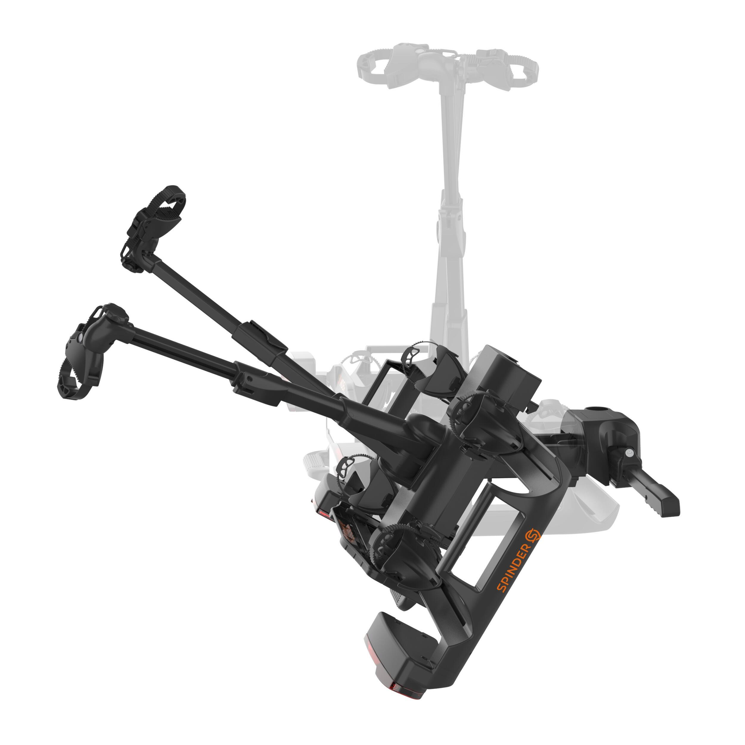 Porte-vélos plateforme basculant TX2 Premium SPINDER spécial hayon pour 2 vélos électriques, extensible à 3 avec rail XB2. Montage sur boule d'attelage, design élégant et fonctionnalité optimale.