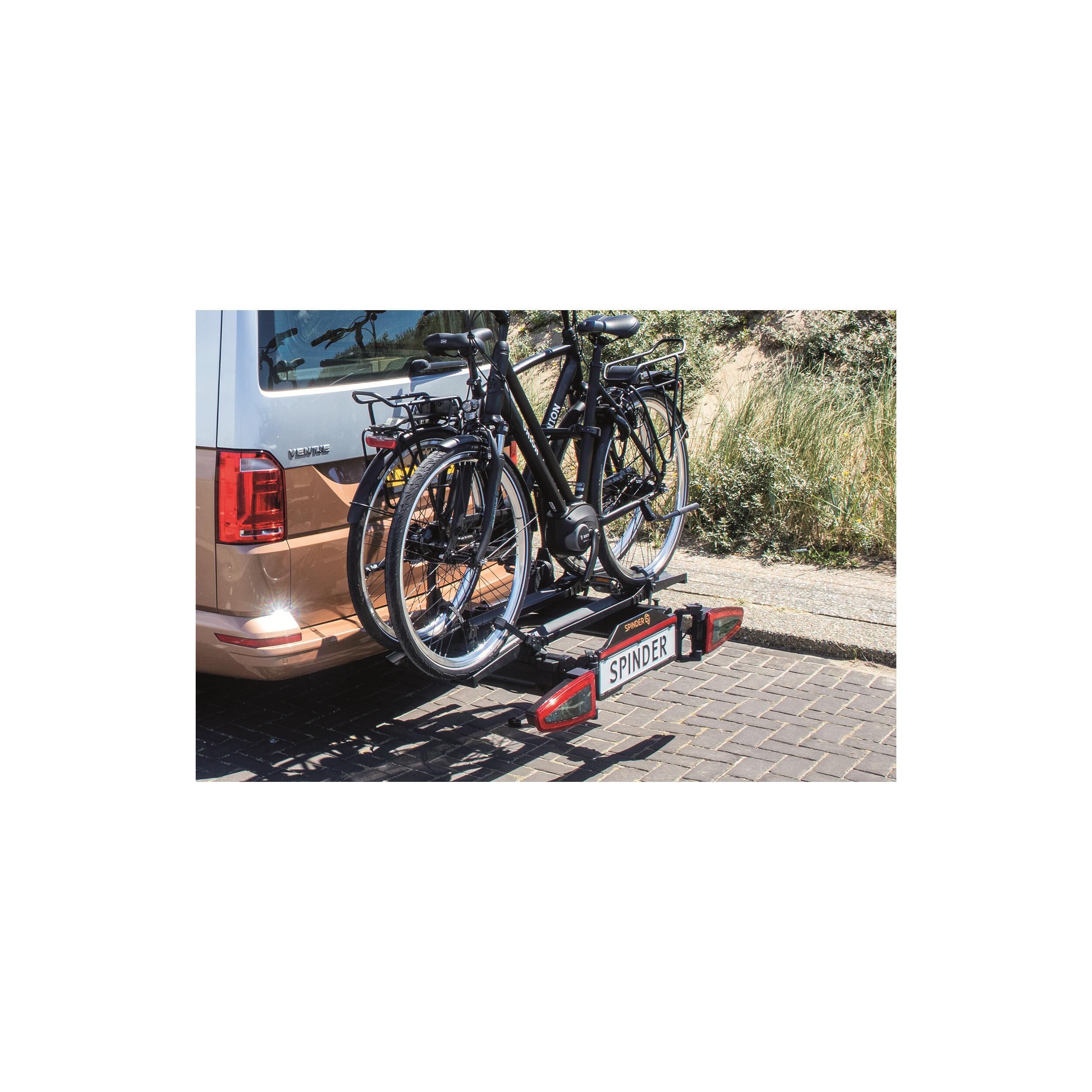 Le porte-vélos SC2 Premium SPINDER spécial portes battantes, compatible avec 2 vélos électriques et extensible pour un troisième, allie fonctionnalité et design avec sa capacité de 60 kg et sa fonction coulissante.