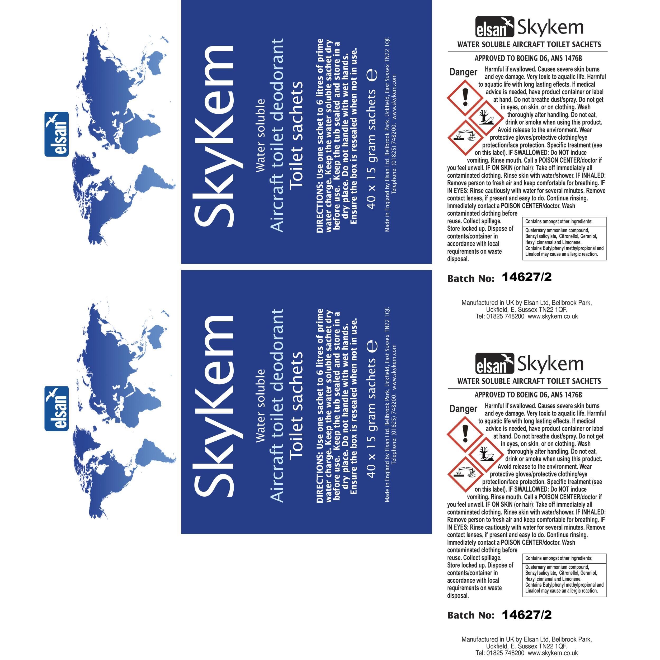 SKYKEM 40 GR de ELSAN, l’additif sanitaire en sachets pré-dosés pour un entretien optimal des toilettes chimiques. Dissout matières et papier, limite les gaz et neutralise les odeurs. Pratique et efficace, sans gaspillage.