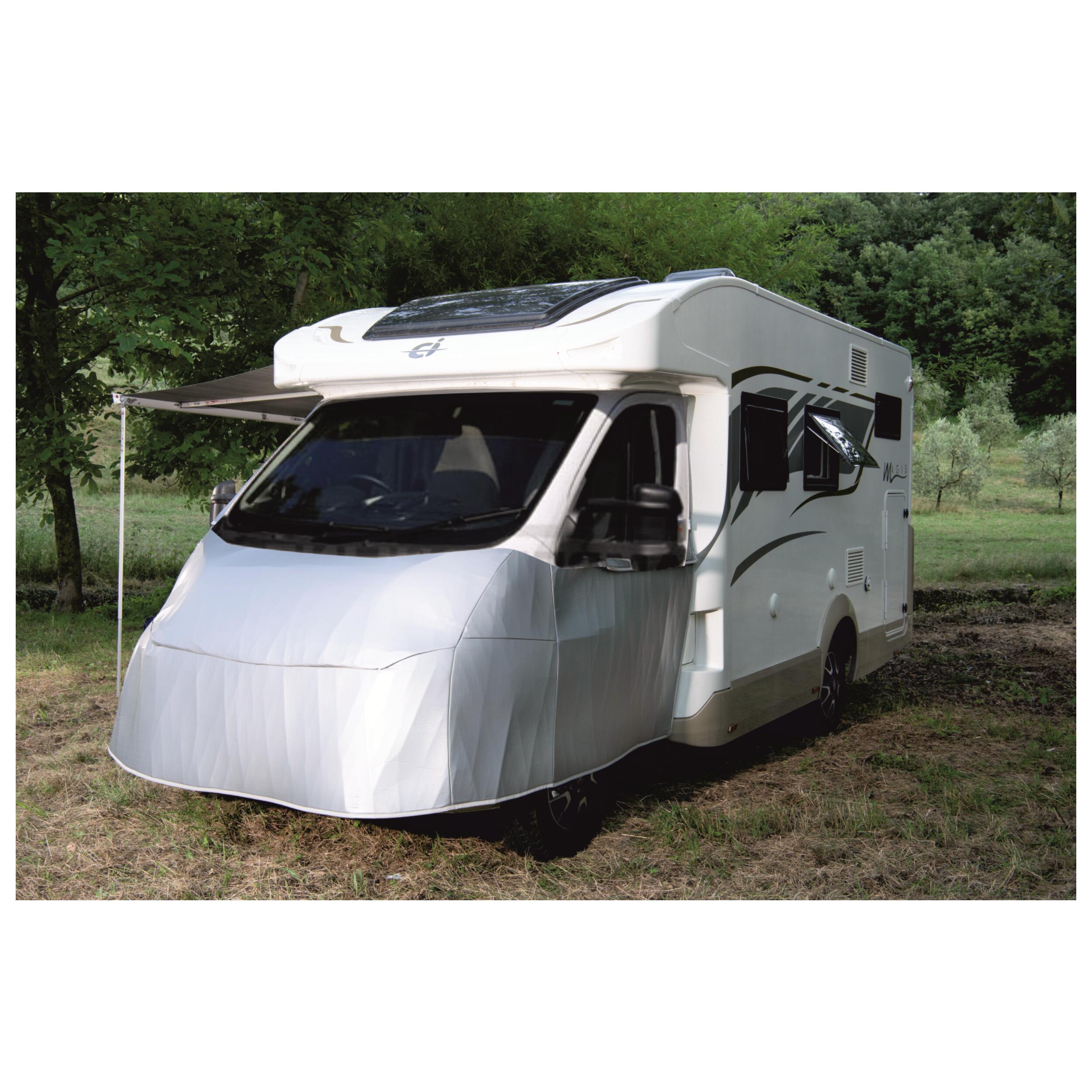 Le volet occultant isotherme extérieur est la meilleure isolation contre la chaleur et le froid. Conçu spécifiquement pour repousser la lumière du soleil et le froid même à des températures jusqu'à -20°c, il est disponible dans la version pare-brise ou capot moteur. Pratique, facile à positionner, il est livré dans un sac pratique.Le volet cabine permet d'isoler la cabine et d'éliminer la condensation hivernale gênante qui se crée à l'intérieur du pare-brise. Il se positionne facilement et rapidment : le pare-brise est à insérer dans les coins supérieurs des deux portes au moyen de bandes élastiques et par une languette qui, à la fermeture de la porte, bloquera le store latéral. Le volet capot est positionné et fixé avec une bande élastique sur les coins inférieurs de la porte et les deux parties (cabine + capot) se joignent entre elles grâce à une bande velcro placée sur toute la largeur du volet occultant. En l'absence de porte côté passager, la fixation est munie d'une corde élastique, de ventouses et d'une boucle nylon.