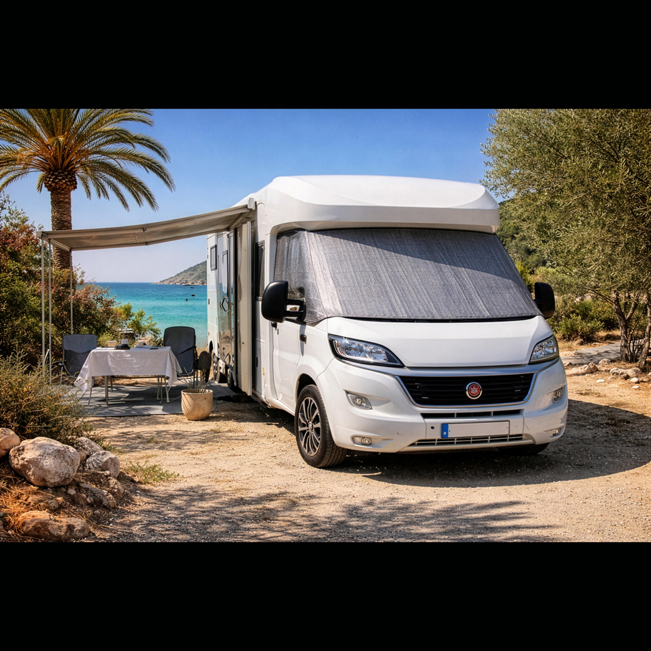 Le volet extérieur isotherme Optima offre une protection thermique exceptionnelle pour votre camping-car, préservant votre confort été comme hiver tout en évitant la condensation et le givre sur le pare-brise.