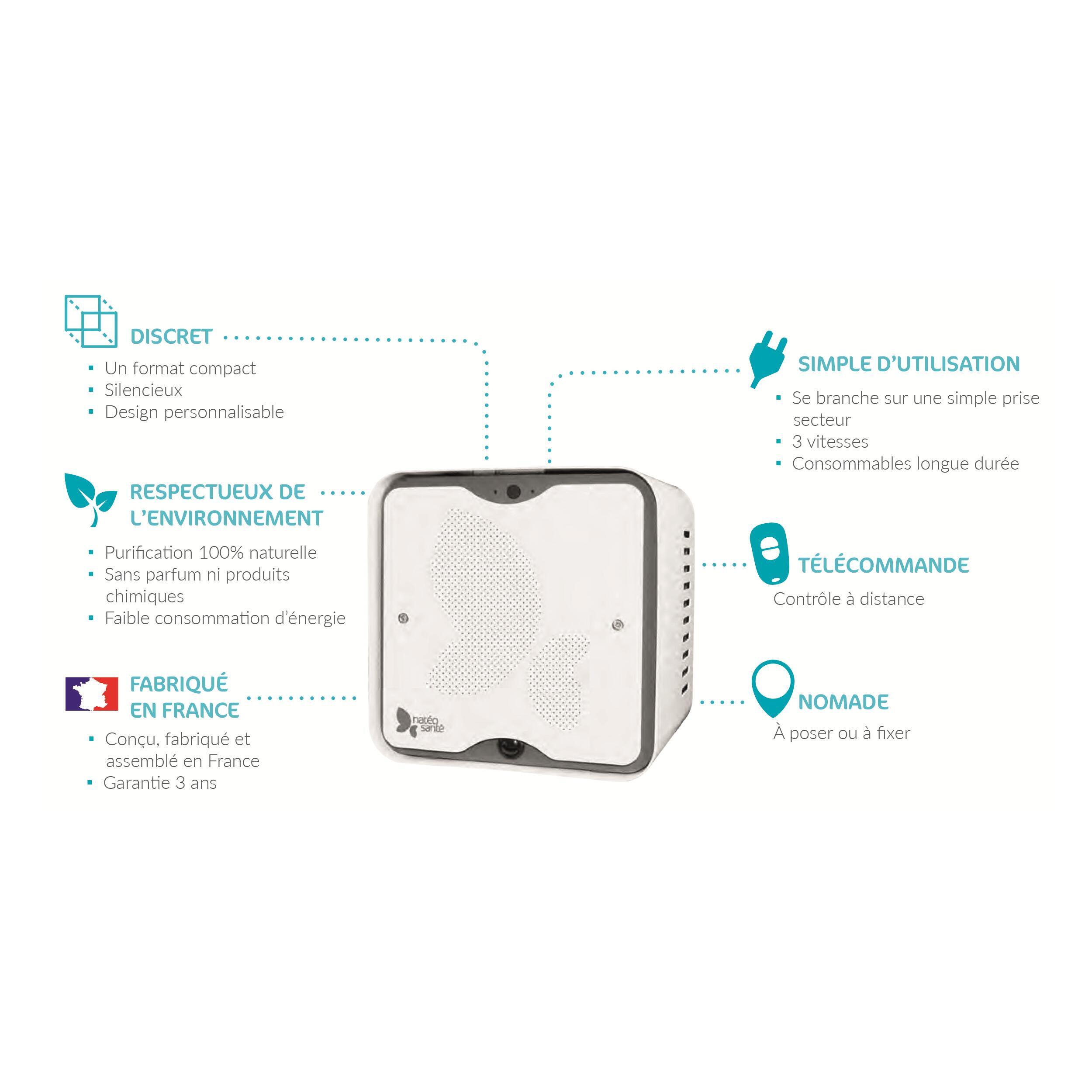 Hygeolis détruit les odeurs et assainit l'air de façon 100% naturelle. Cette solution « Anti-Odeurs » est parfaite pour régler les problèmes d'hygiène dans les petites surfaces exposées à des problématiques d'odeurs et d'humidité. Ce purificateur d'air idéal pour les espaces allant jusqu'à 30-45m² est doté d'un préfiltre biocide (efficace contre la propagation des bactéries et virus), d'un filtre à charbon de très haute densité efficace contre les COV (Composés Organiques Volatiles / Composés Chimiques).