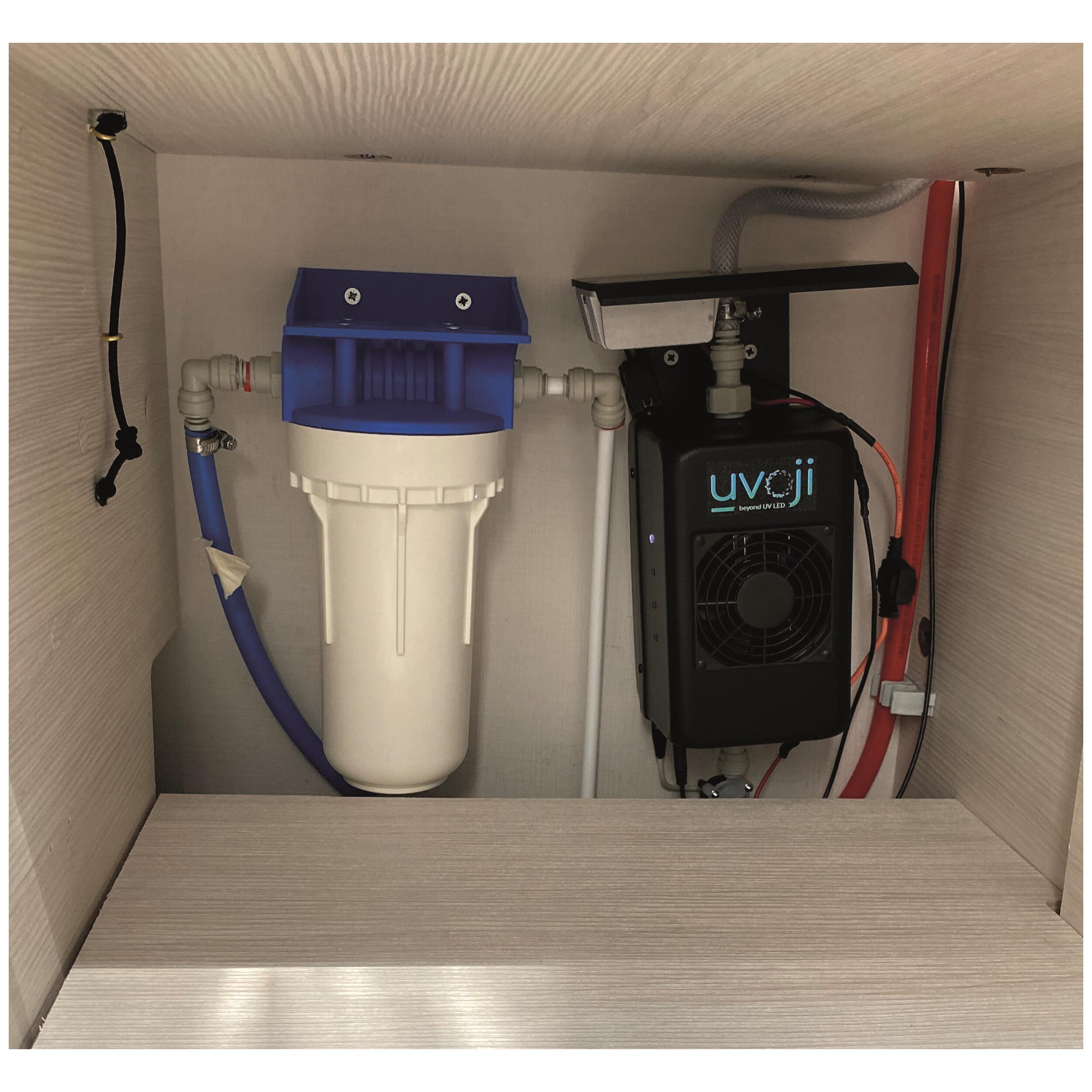 À destination des Camping-cars et des mobil-homes, le pack purificateur d'eau Oji Pure débarrasse l’eau de tout agent pathogène grâce à la technologie LED UV-C ! Avec un débit maximum de 16L/min, pour une sortie de 8L/min d’eau potable au robinet. Il décontamine au point d'usage, au moment même de l’utilisation de l’eau!