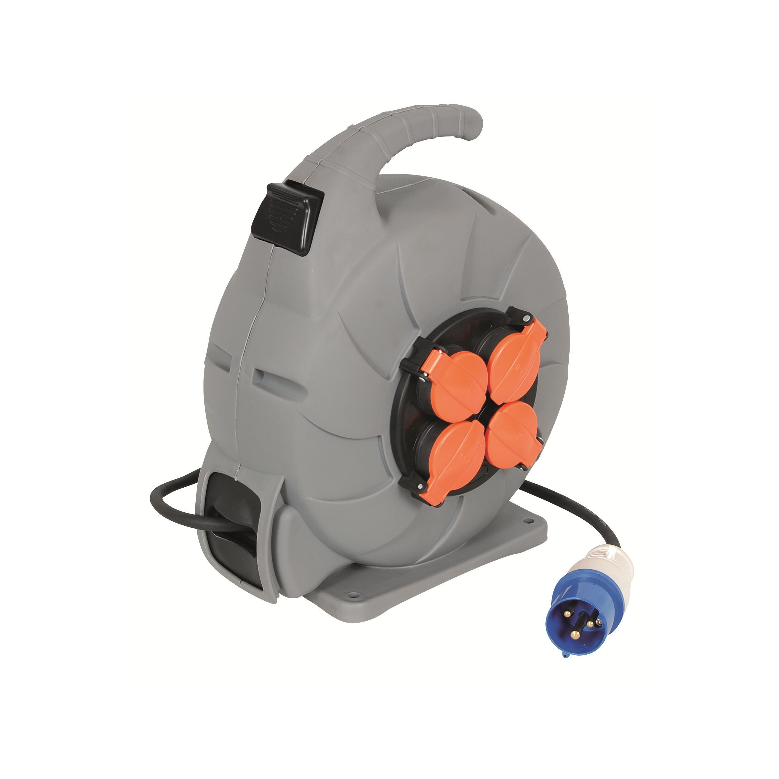 Pour le raccordement aux bornes du terrain de camping. Déroulez seulement la longueur nécessaire. Rappel automatique du câble en appuyant sur un simple bouton. Fiche mâle CEE 17. Ilot fixe 4 prises femelles Schuko : évite que les câbles connectés s'emmêlent. Equipé d'un disjoncteur thermique.