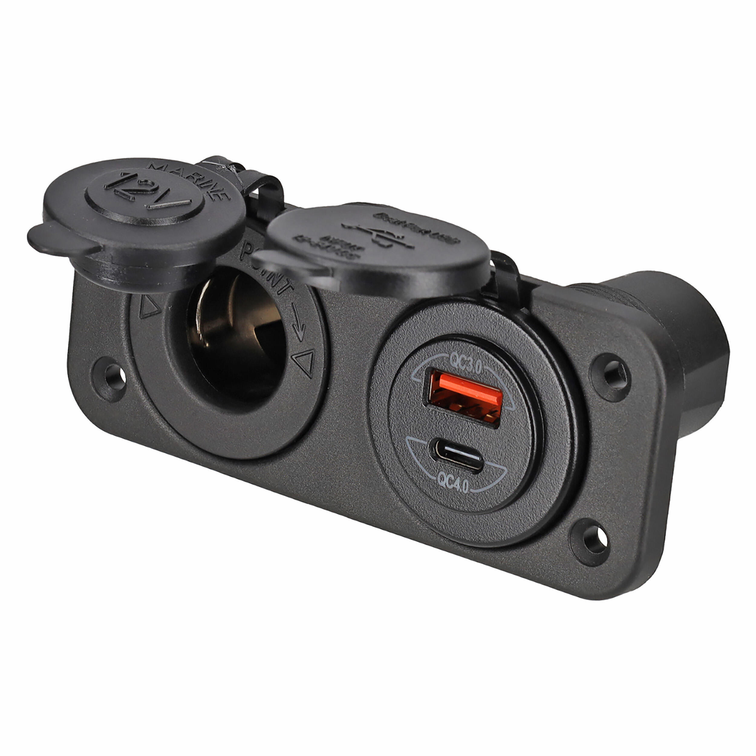 Socle 12V encastrable HABA avec prise allume-cigare et ports USB-A (QC 3.0) + USB-C (QC 4.0), compatible camping-car, caravane et bateau.