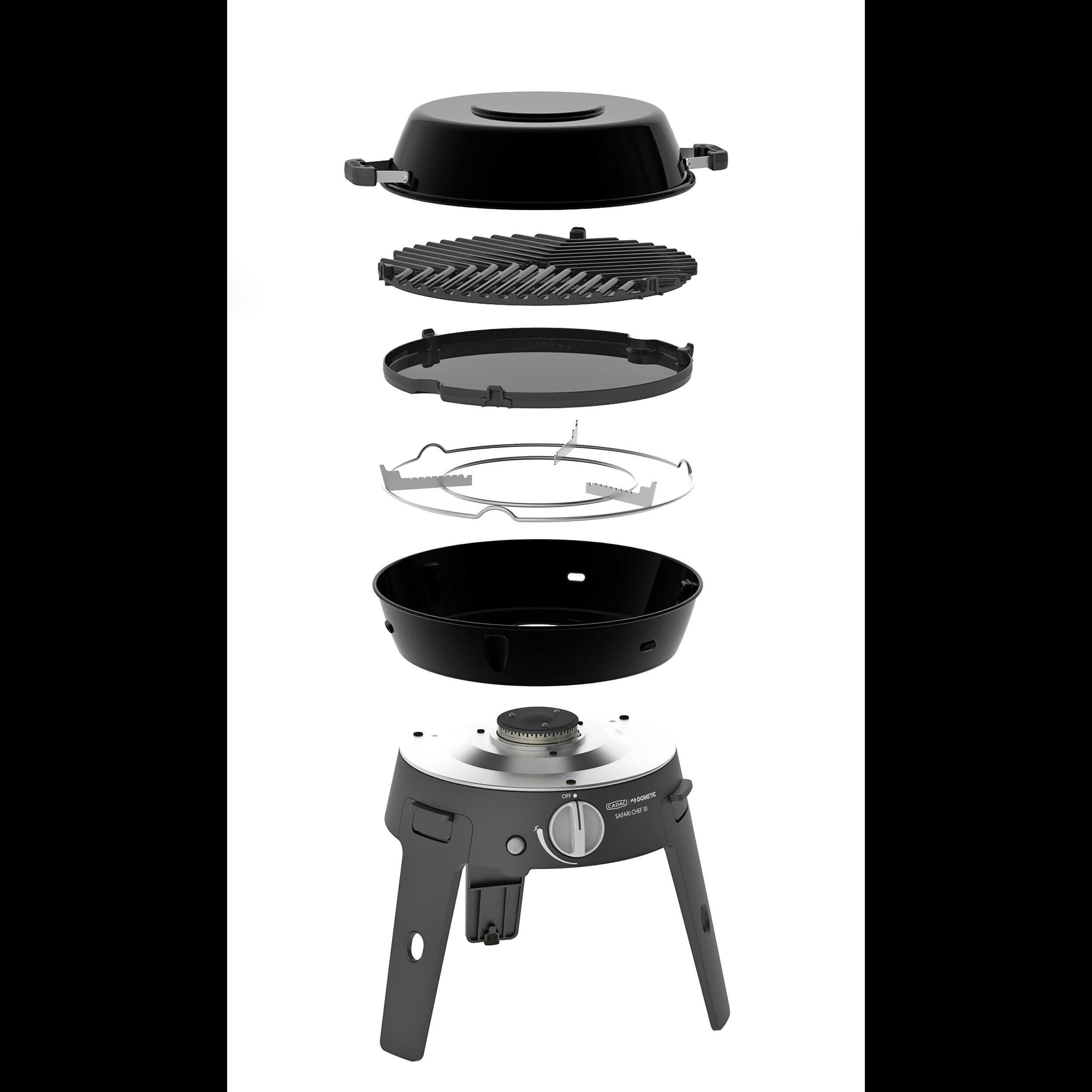 Découvrez le Safari Chef 30 Cadac, un barbecue à gaz portable, compact et pratique, offrant quatre surfaces de cuisson pour une cuisine variée, où que vous soyez.