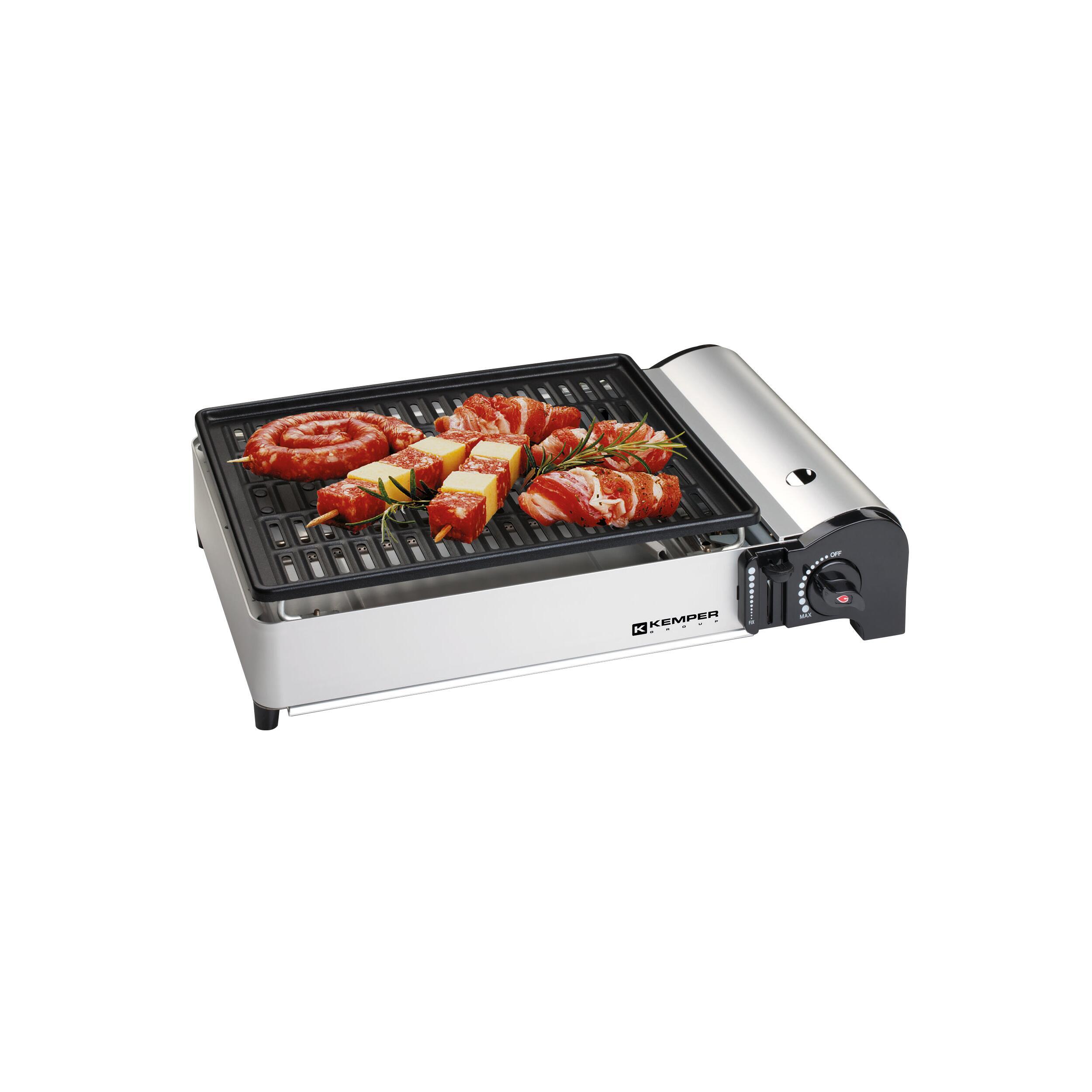 Barbecue/grille de camping léger, compact et robuste. Grille en aluminium avec couvercle anti-adhésive, réglage manuel, allumage piézo électrique. Bac collecteur de graisse. Sac de transport inclus.