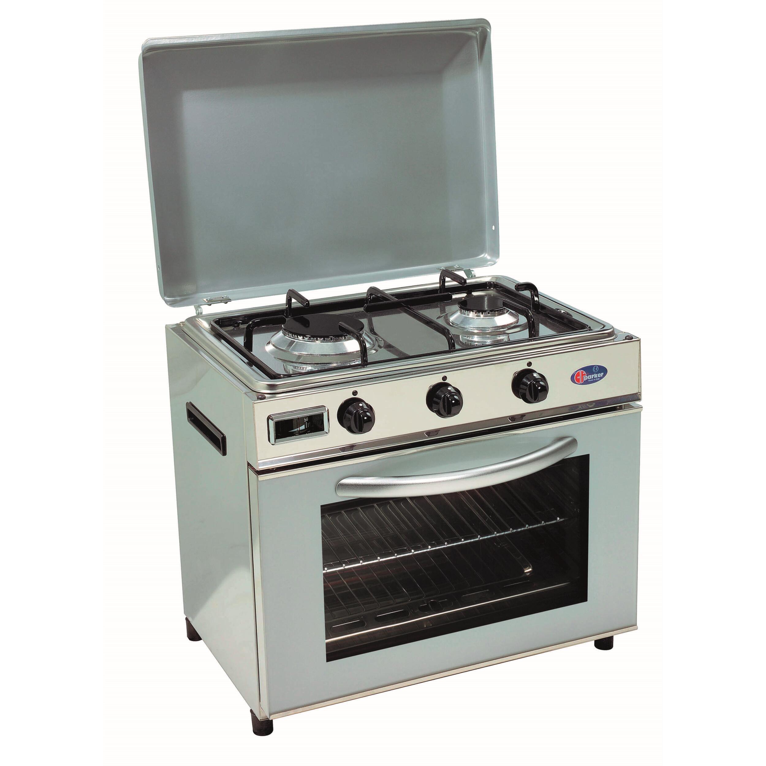 Petit four à gaz avec réchaud 2 feux, idéal pour être transporté dans un camping-car ou une caravane. Compatible avec tout type de gaz notamment Butane, propane et GPL. Les deux brûleurs sont équipés d'un dispositif de sécurité de flamme, ce qui signifie que l'alimentation en gaz est automatiquement coupée si la flamme s'éteint.