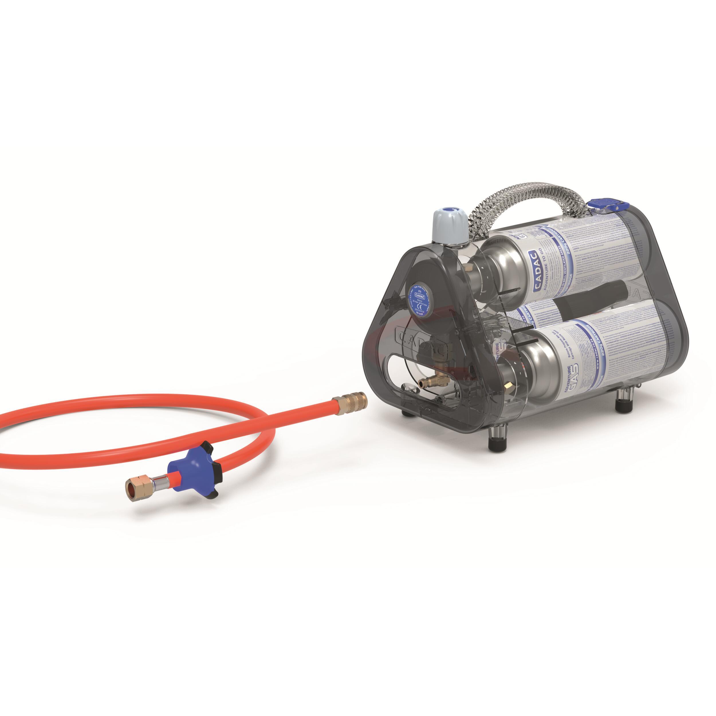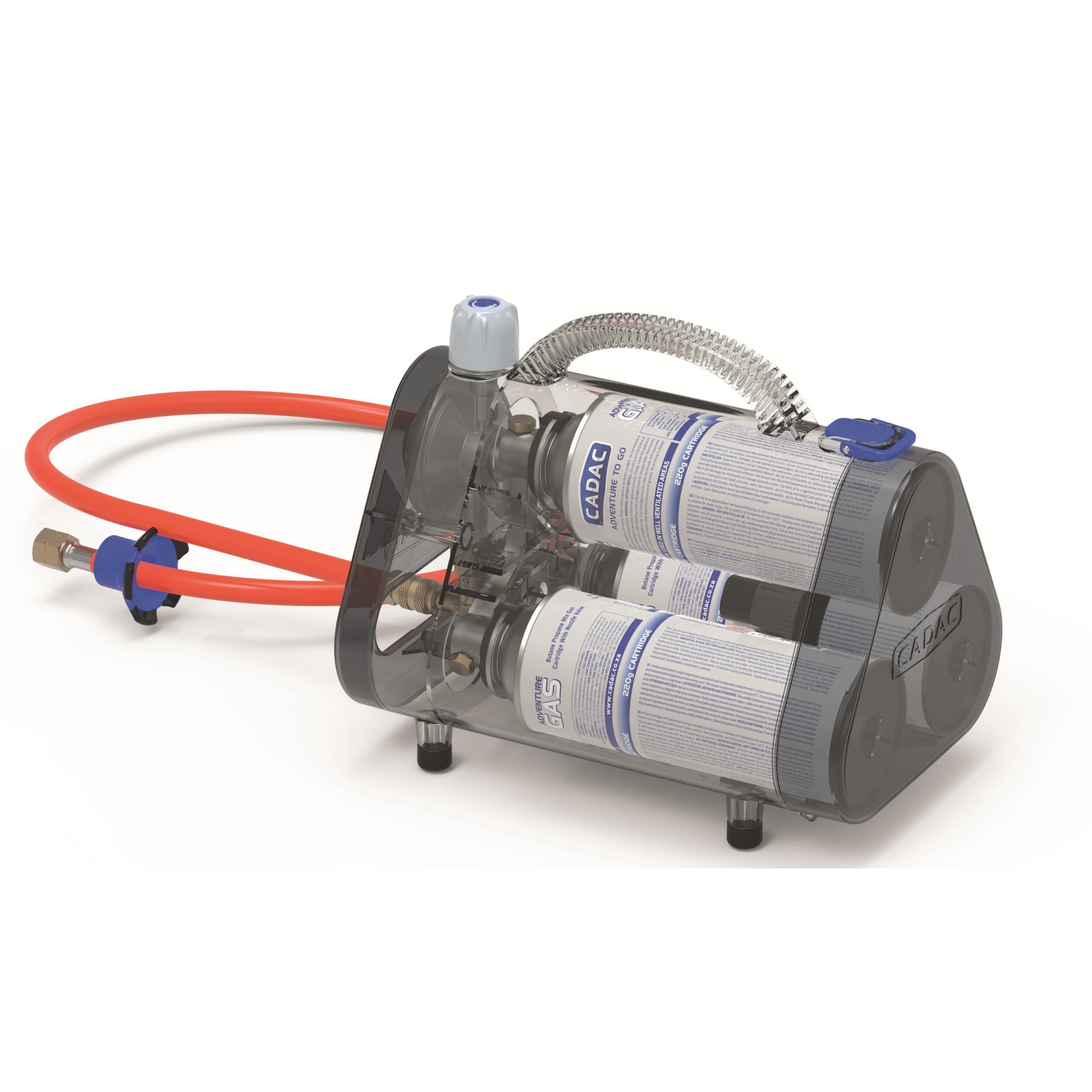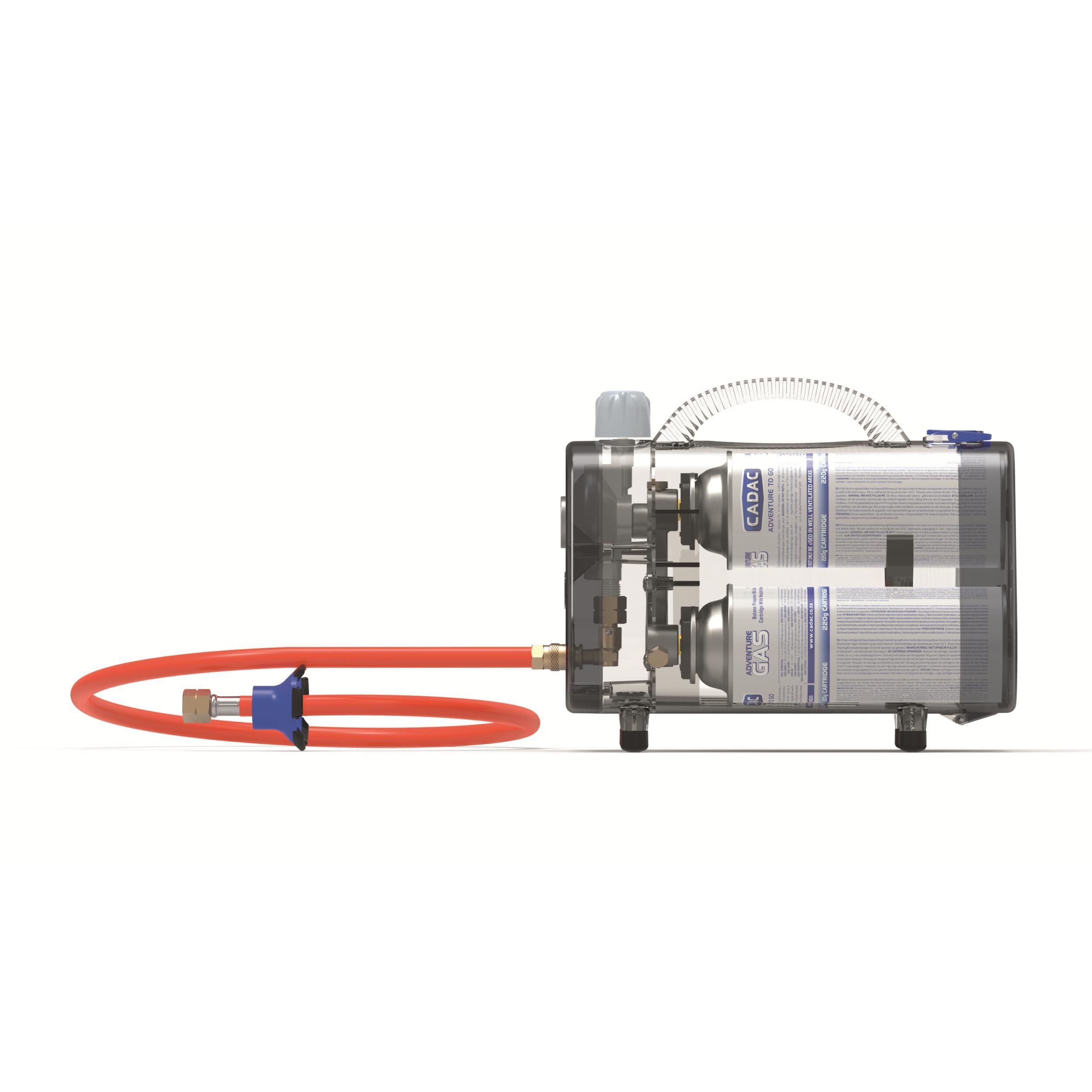 Ne pèse que 1,2 kg et dispose de trois entrées pour cartouches de gaz 220 g avec connexion à baïonnette (non incluse : réf 016428), ce qui est une bonne alternative aux lourdes bouteilles de gaz.