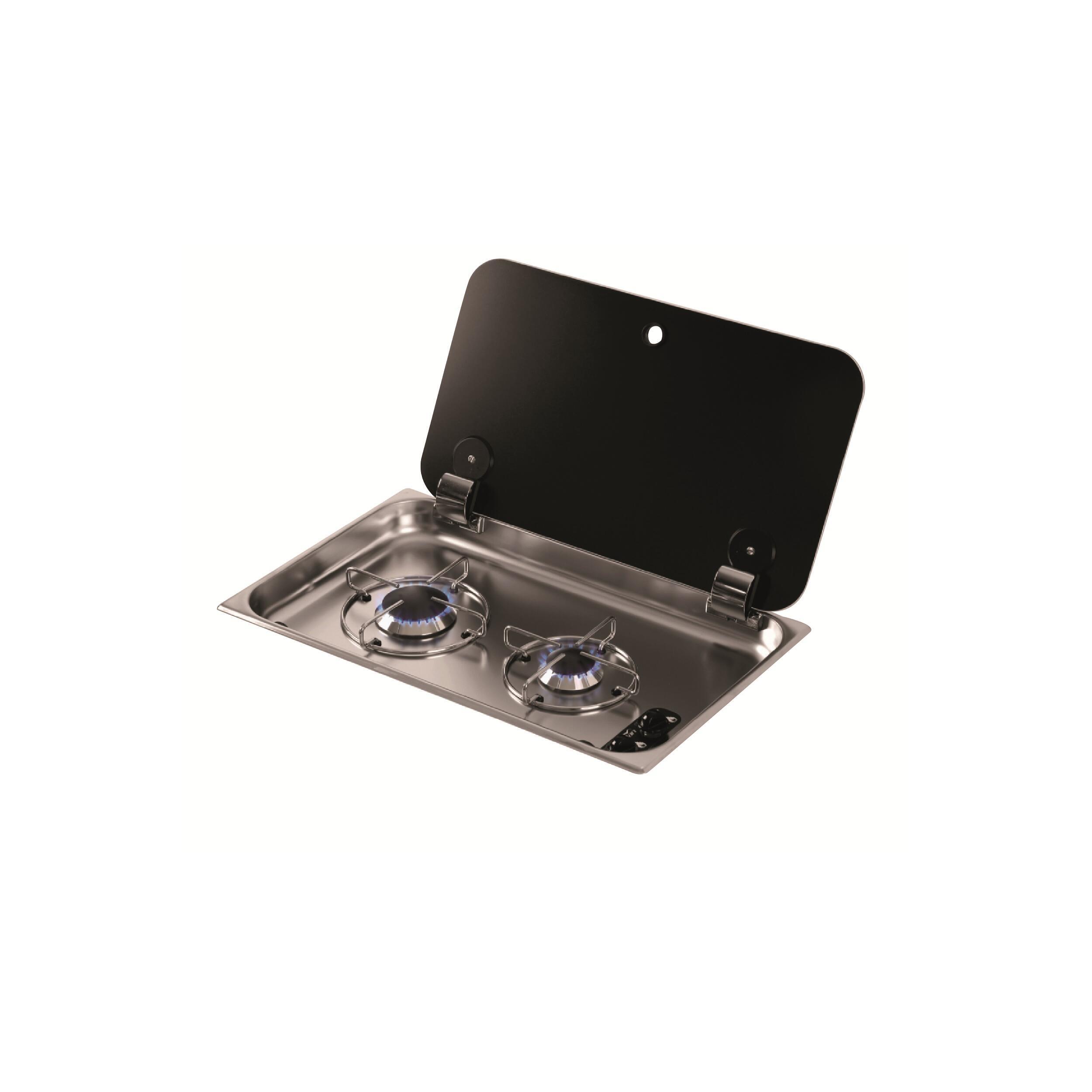 Réchaud encastrable en inox avec couvercle en verre trempé résistant à la chaleur. Grilles chromées. Fonctionnement : gaz. Allumage piezo.