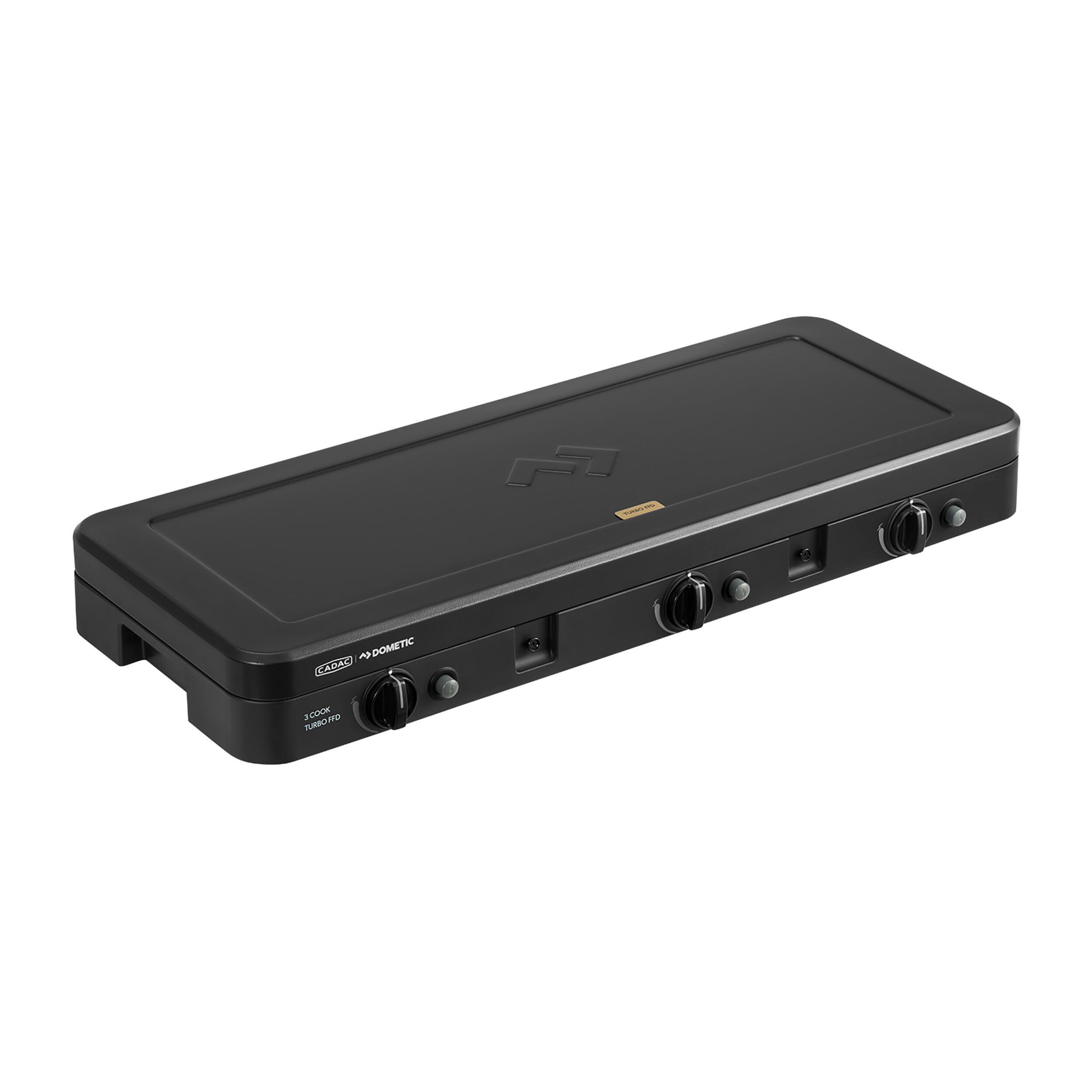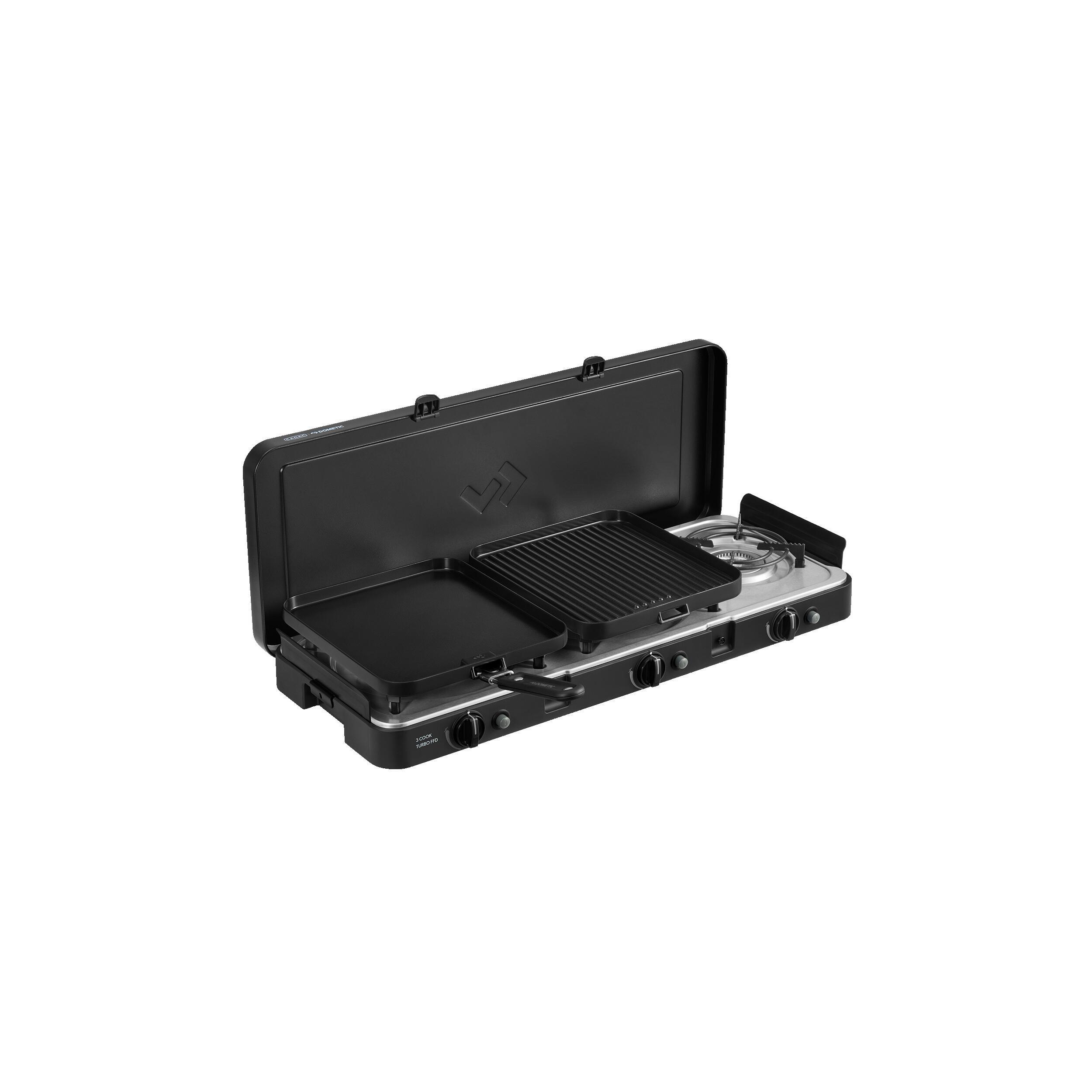 Le 3-Cook Turbo FFD Deluxe de CADAC offre 3 brûleurs, une grille, un grill et des supports de casseroles. Avec revêtement GreenGrill et pare-vent, il assure une cuisson polyvalente, stable et compacte.