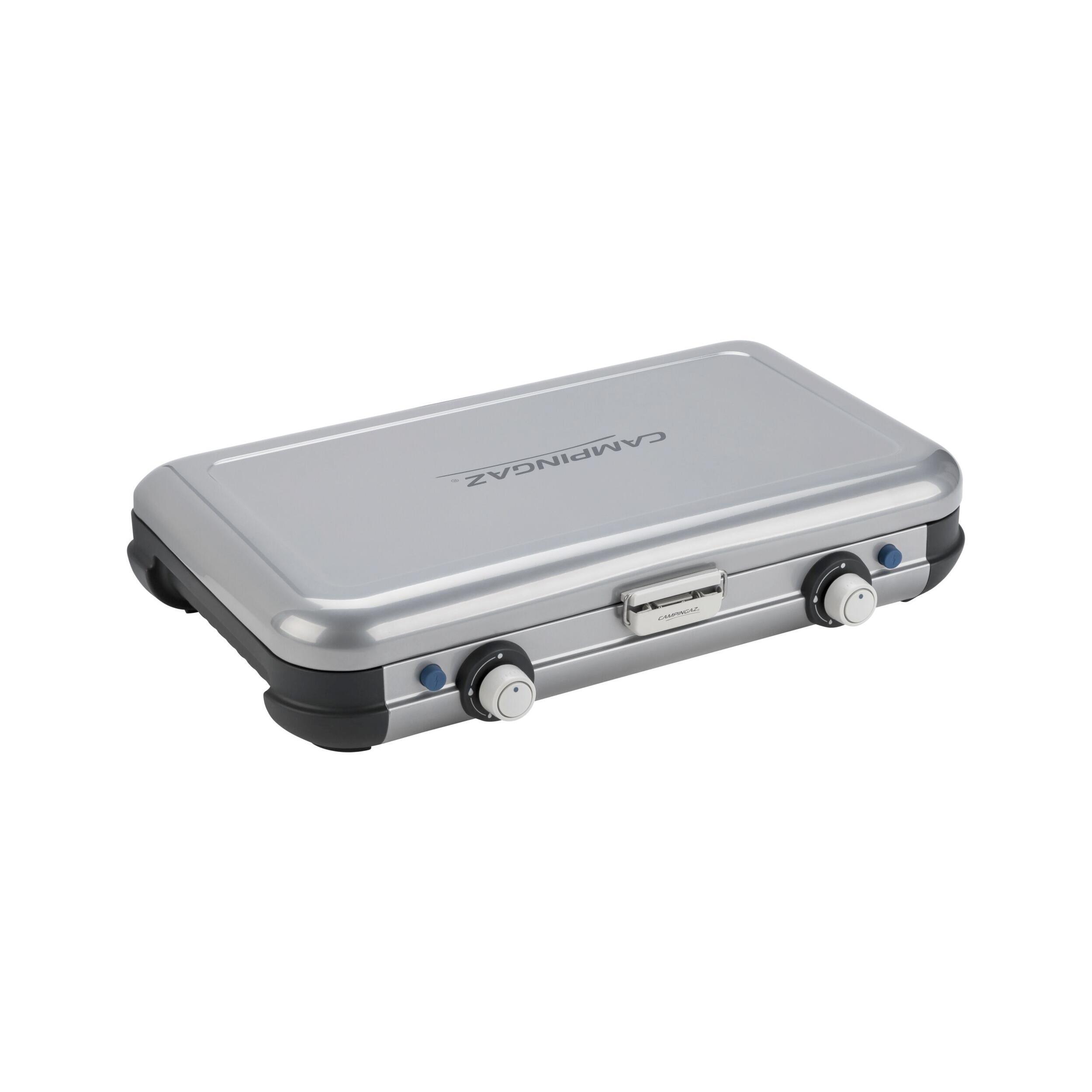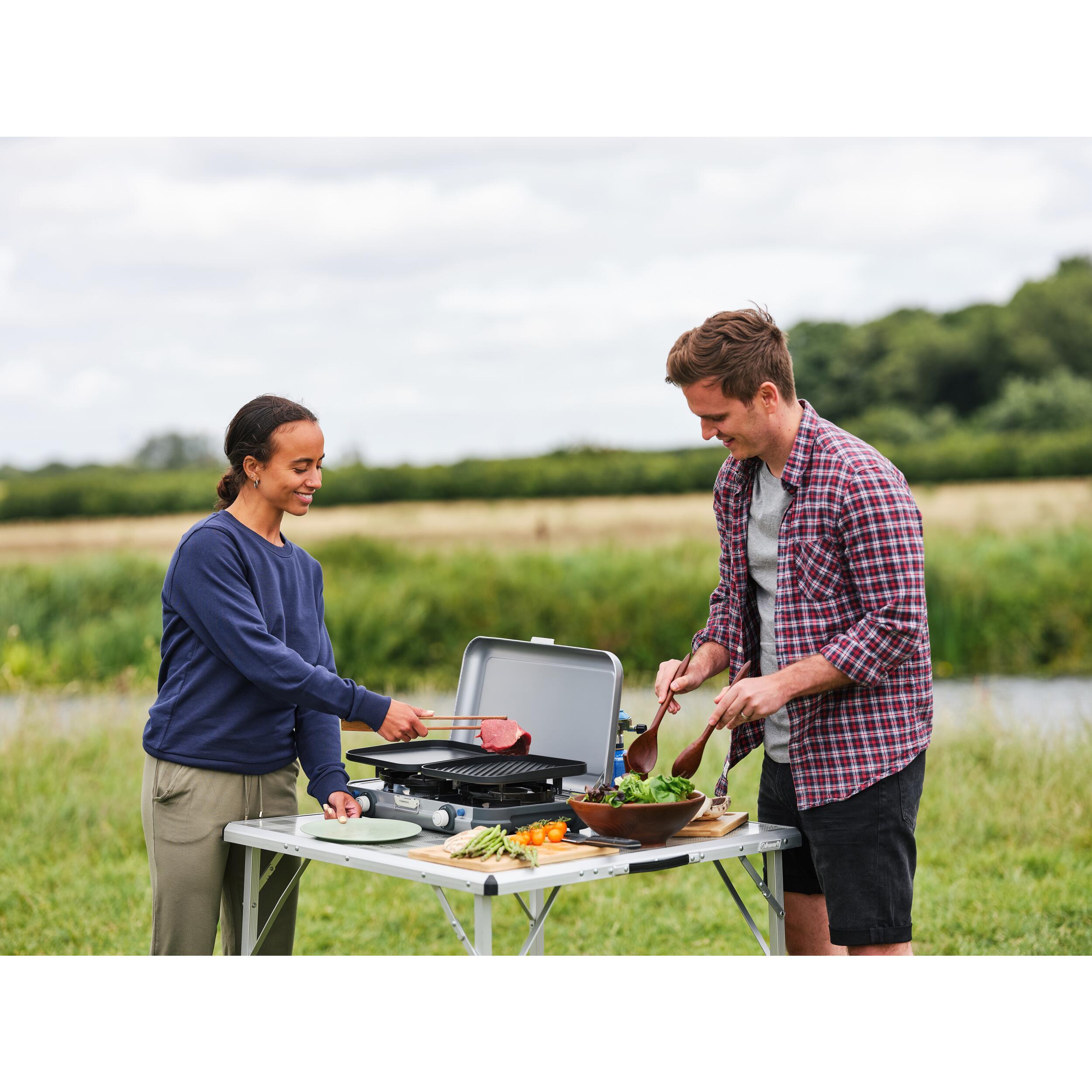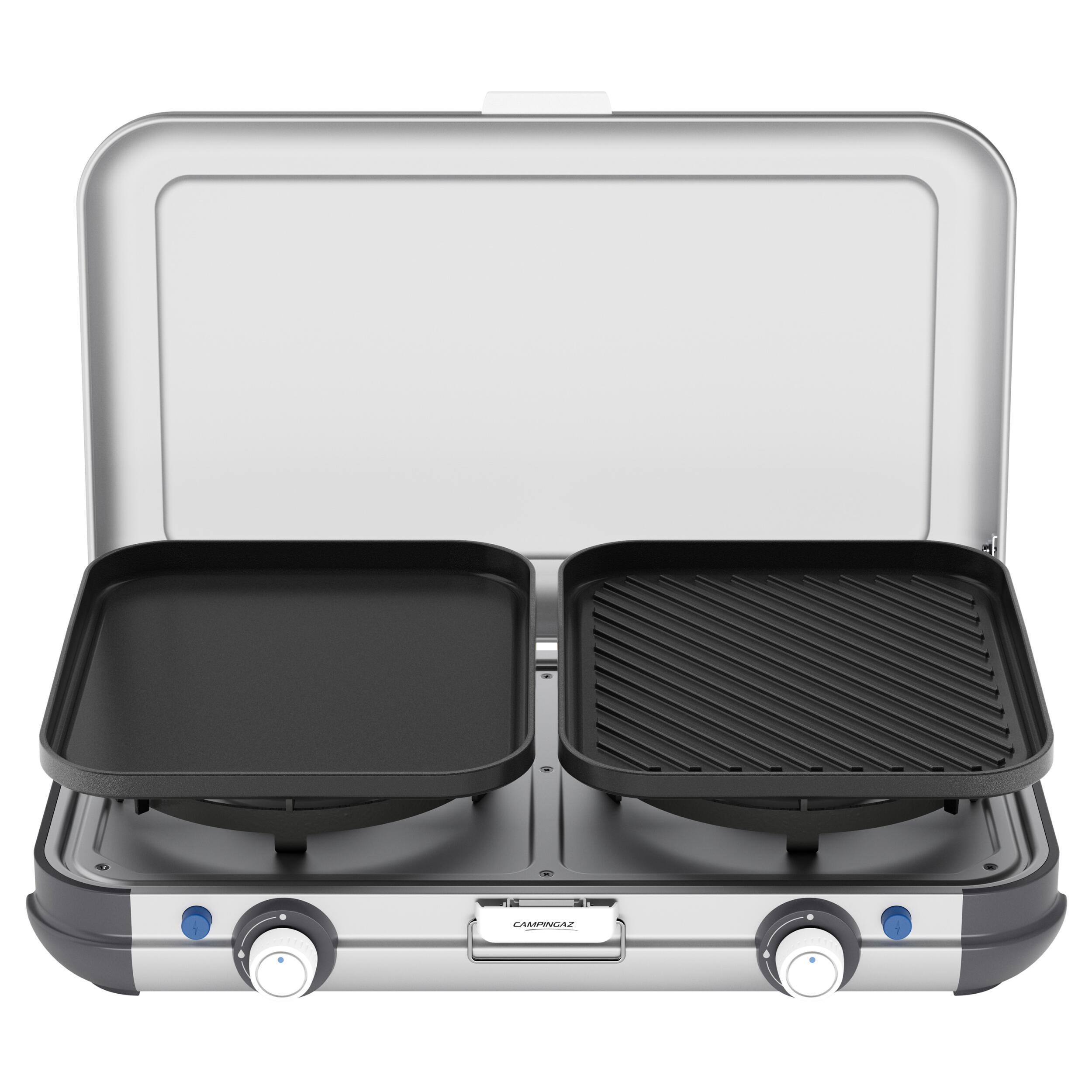 Campingaz Camping Kitchen Grill & Go CV Kit : réchaud 2 feux compact et polyvalent, avec plaques grill et plancha interchangeables.