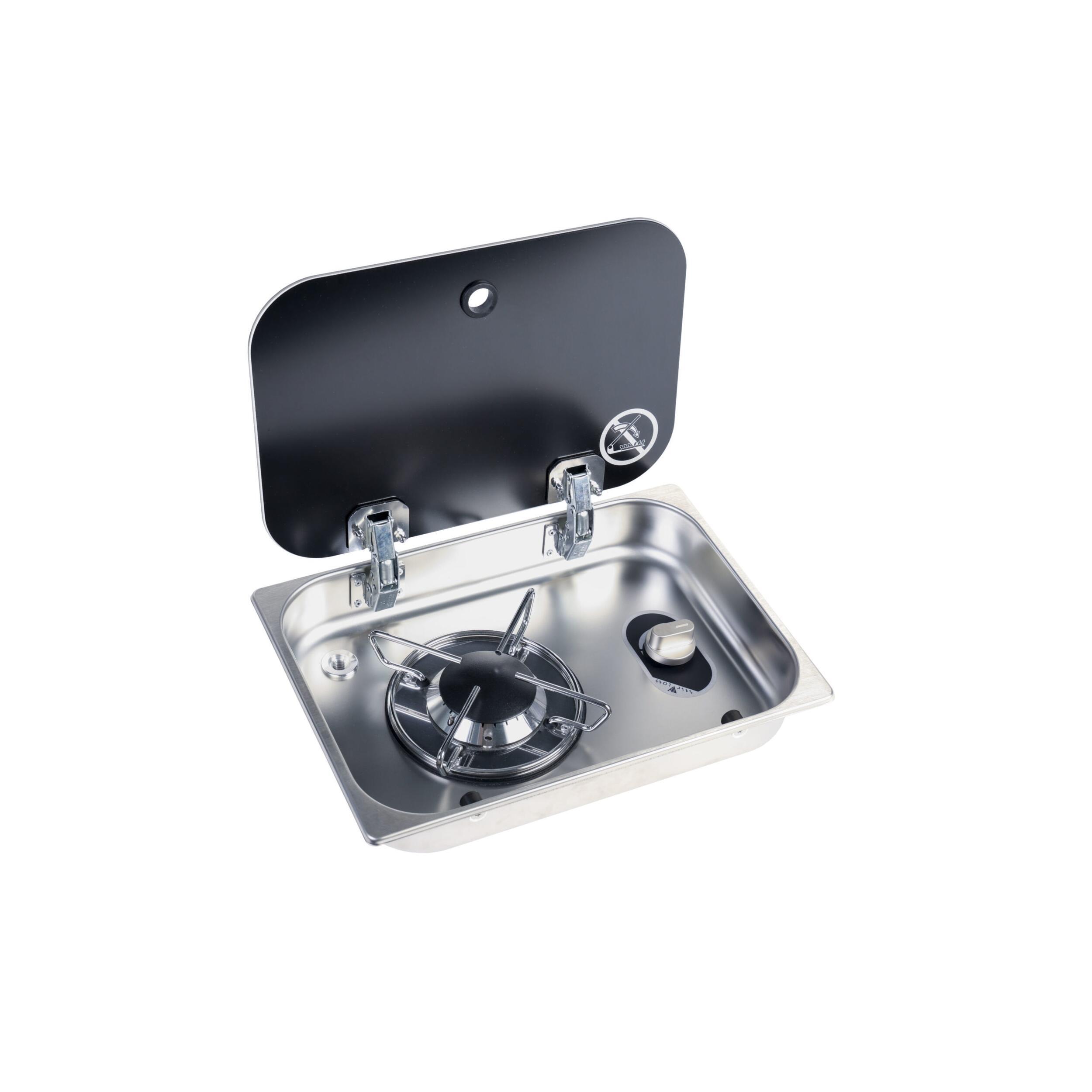 Réchaud à gaz encastrable 1 feu en acier inoxydable avec couvercle en verre trempé. Compact et pratique pour camping-car, caravane ou bateau.