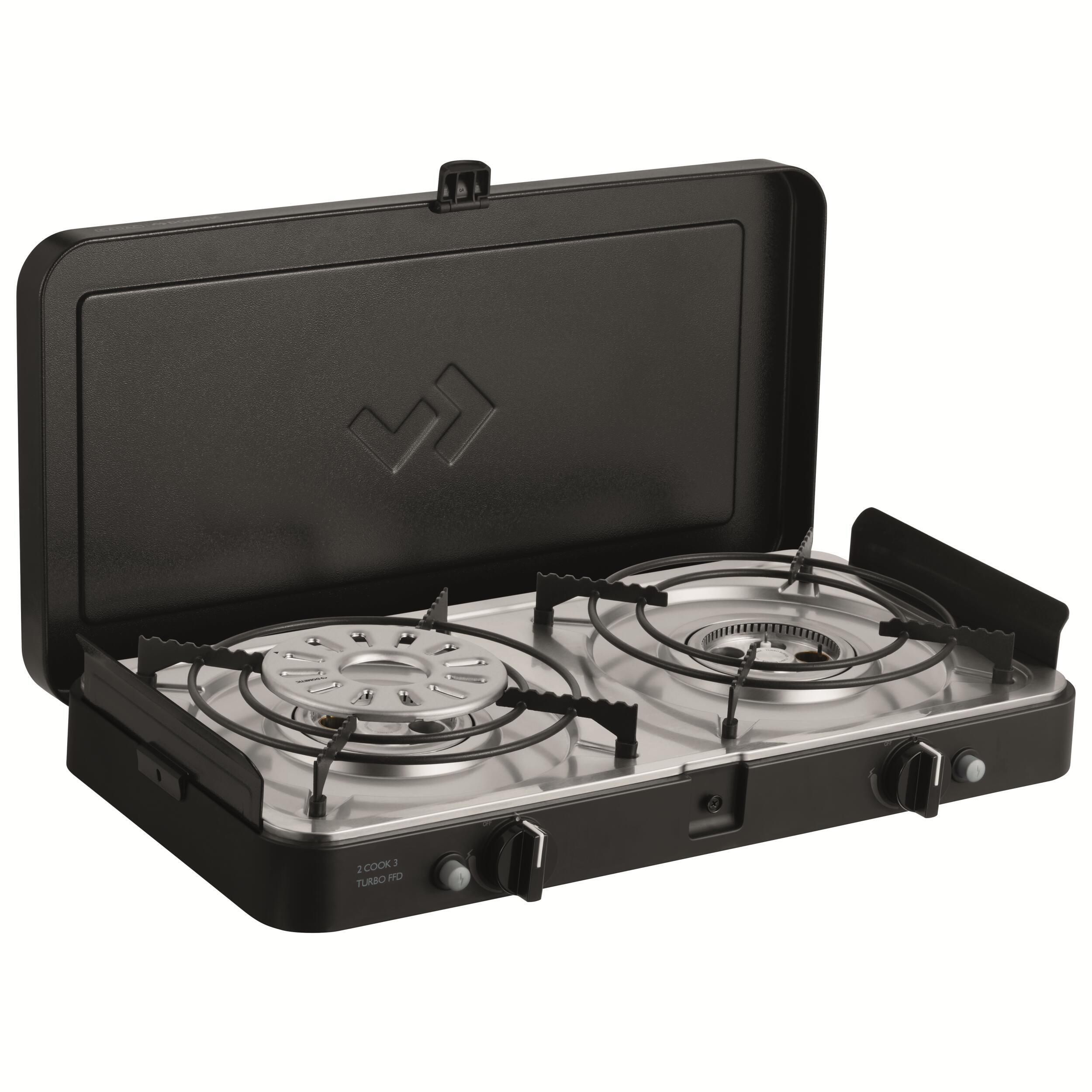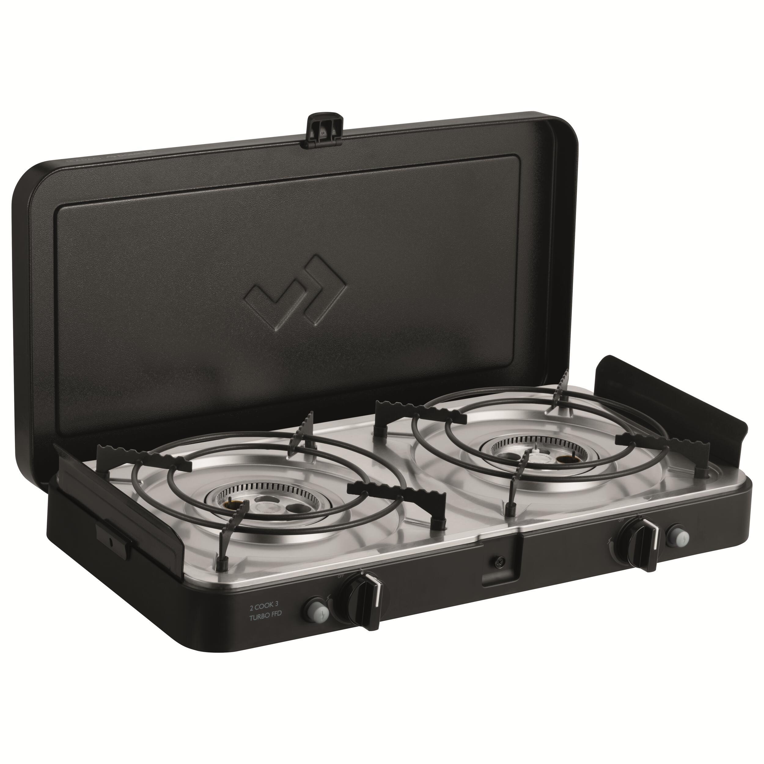 Le 2-Cook Turbo FFD Stove de CADACest un réchaud à 2 brûleurs livré de série avec deux supports pour casseroles et des pare-vents latéraux.