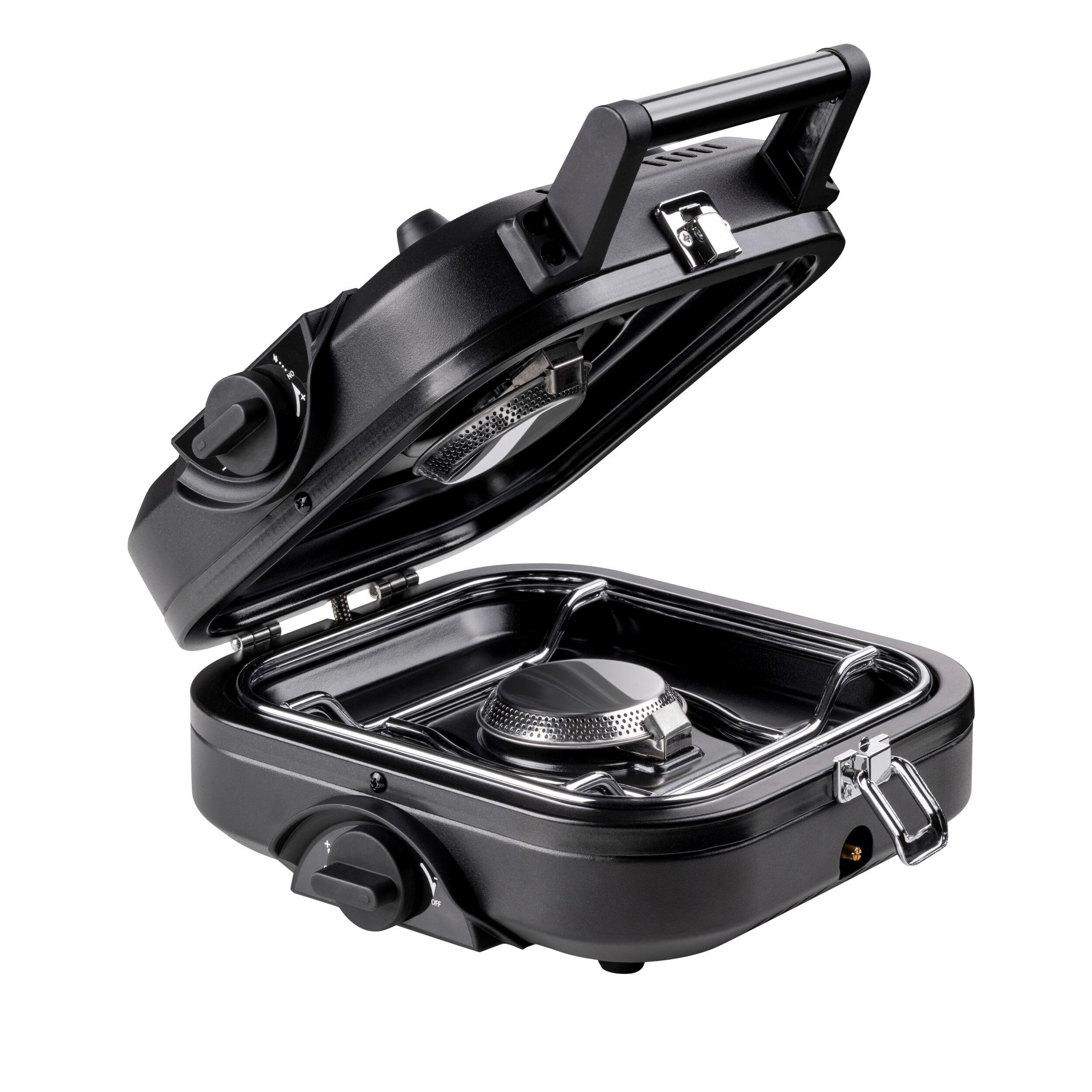 Réchaud à gaz pliable 2 feux Kemper, idéal pour la cuisine extérieure avec allumage piezo et compatibilité cartouche butane/propane. Facile à transporter et à ranger.