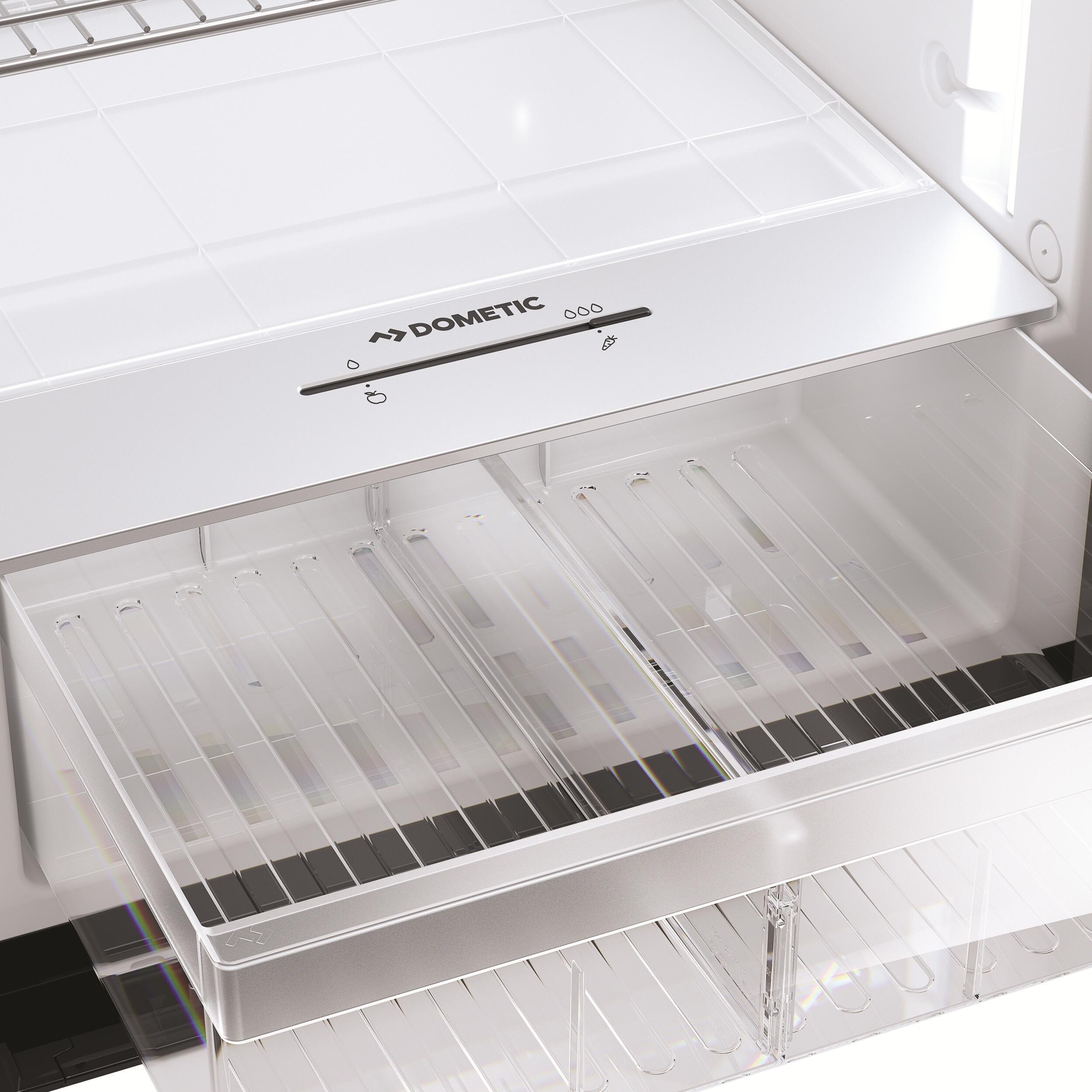 Dometic soigne l’esthétique comme la praticité. Tous les modèles de la Série 10 sont équipés de portes à double charnière exclusives, permettant une ouverture aussi bien à droite qu’à gauche, sans modification de l’installation. Les poignées verticales en aluminium, sobres et élégantes, offrent une excellente prise en main, quel que soit l’angle d’accès. À l’intérieur, un éclairage LED bilatéral éclaire uniformément l’ensemble du volume. L’ensemble dégage une impression de modernité, de confort et d’intelligence d’usage.