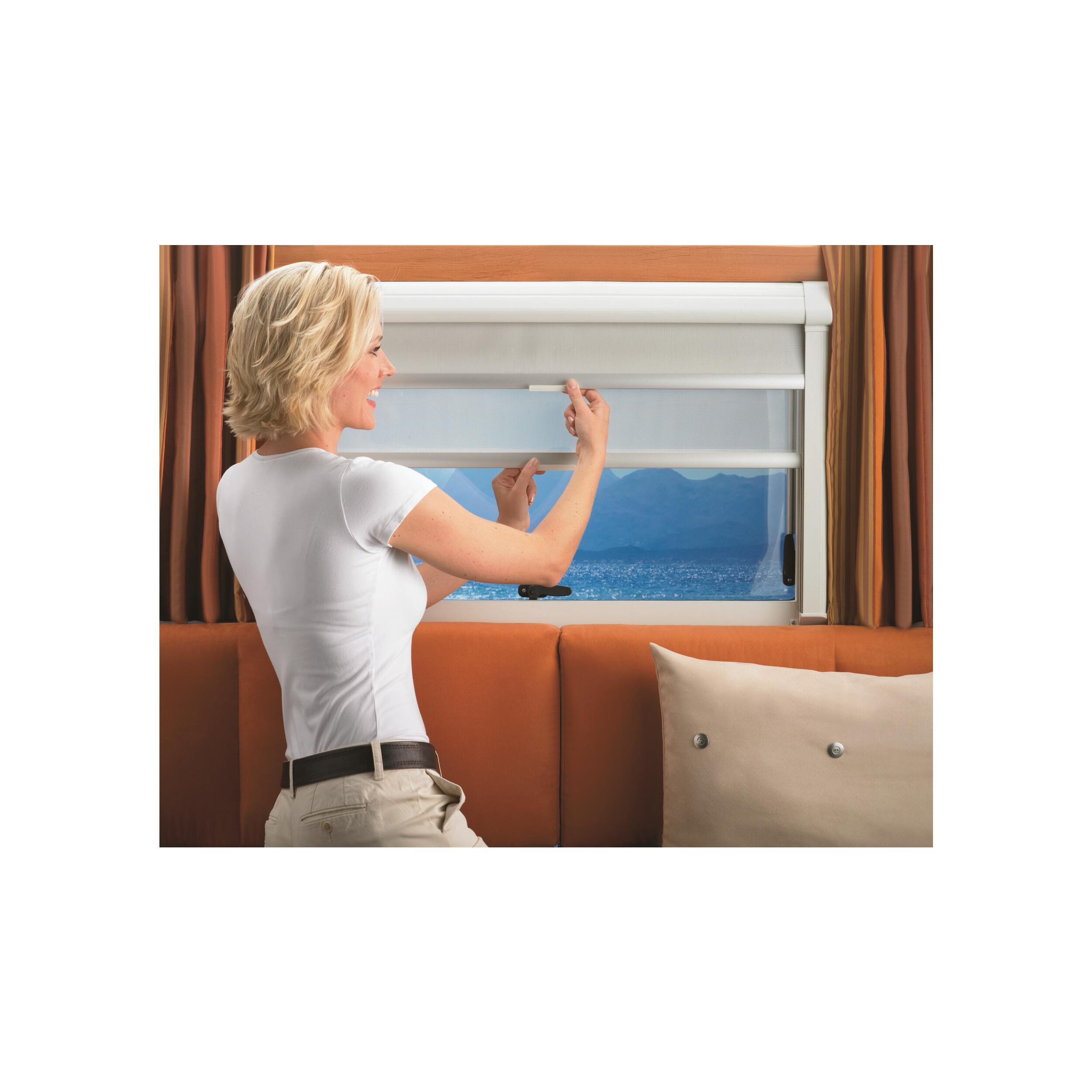 Ce store est la solution idéale pour les fenêtres sans cadre, il est conçu pour être installé au-dessus du bord supérieur de la découpe de la fenêtre. Protection très efficace contre les insectes. Toile extérieure du store en aluminium à forte puissance thermo réfléchissante. Toile intérieure blanche. Moustiquaire et store d'occultation intégrés et manœuvrable en différentes positions.