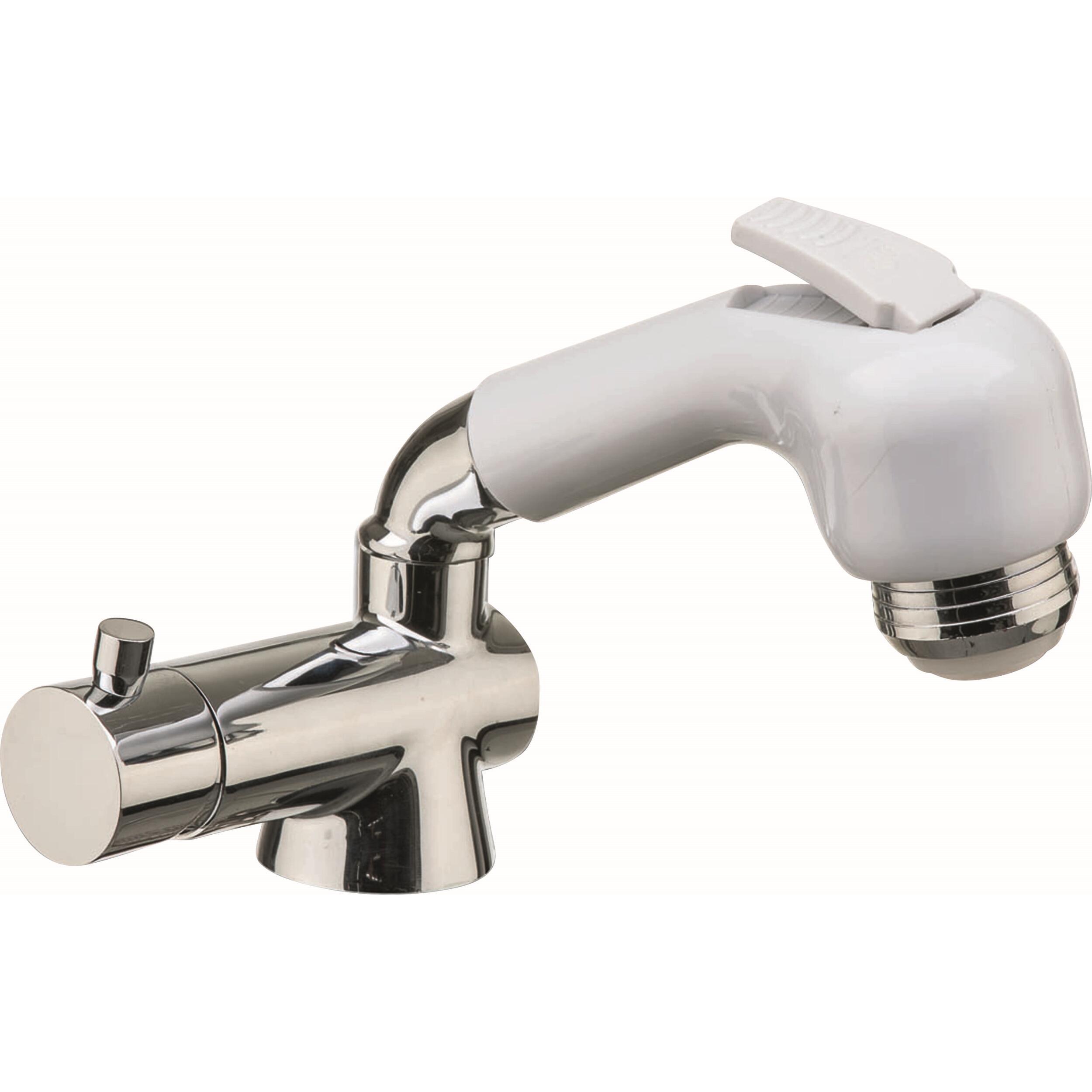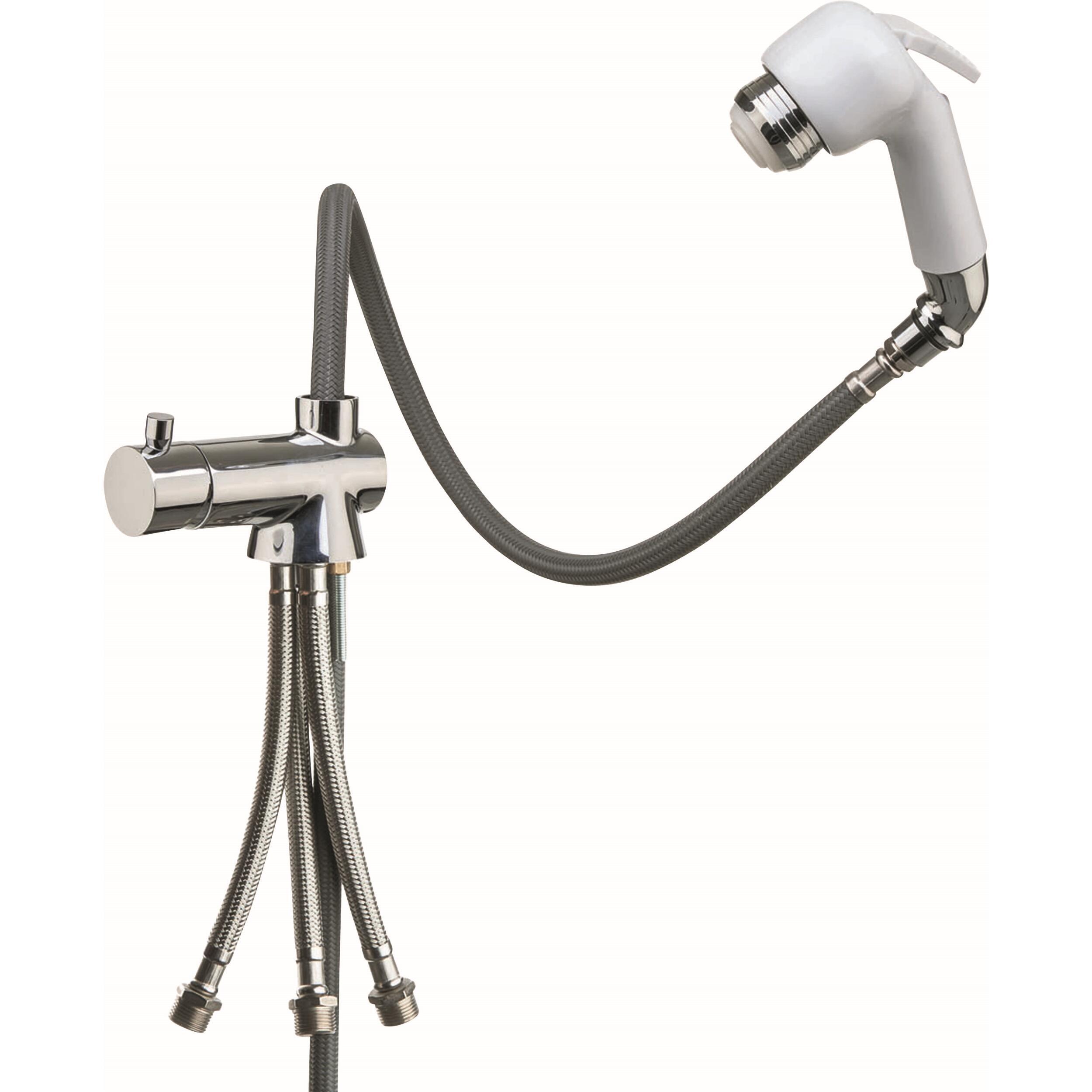 Robinet en laiton chromé avec mitigeur eau froide / eau chaude. Sa douchette est équipée d’une gâchette de contrôle de flux. Prévu pour un montage sur paroi horizontale. Compatible avec pompe automatique.