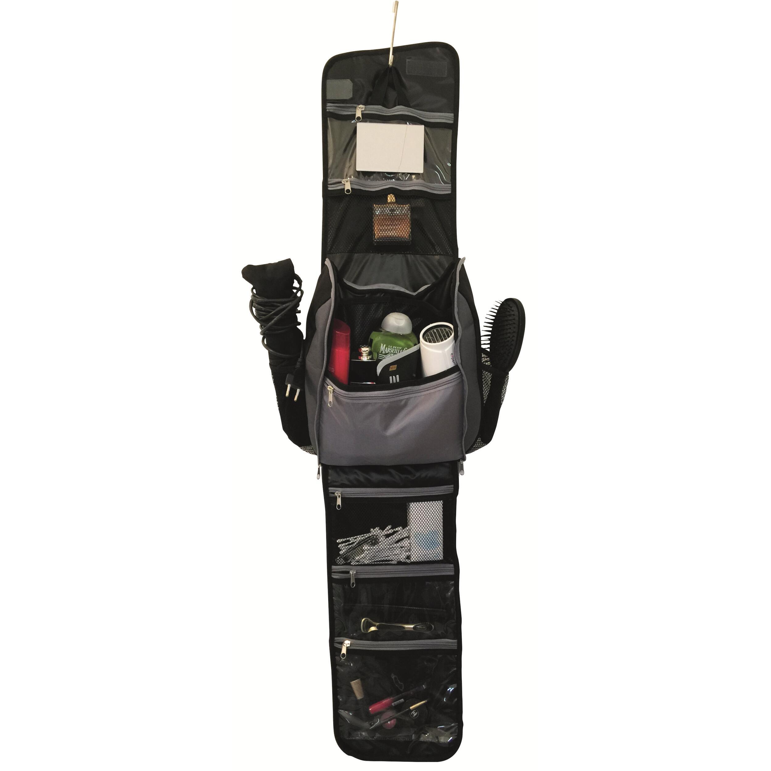 Multiples pochettes intérieures et deux pochettes extérieures offrant beaucoup d'espace de rangement. Miroir amovible. Crochet en forme de L permettant une installation sur toutes les portes. Pliable pour un rangement compact. Avec poignée de transport pour l'emporter partout.