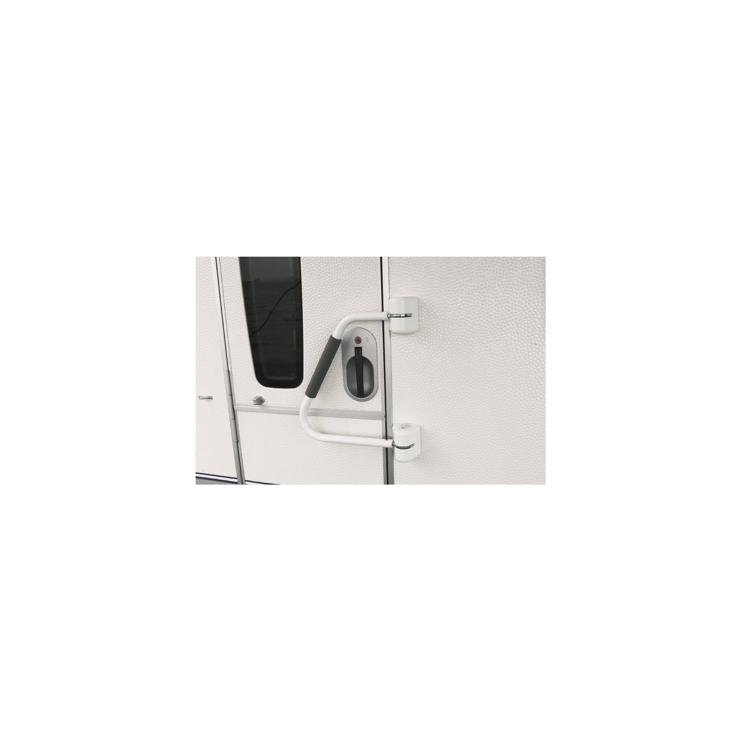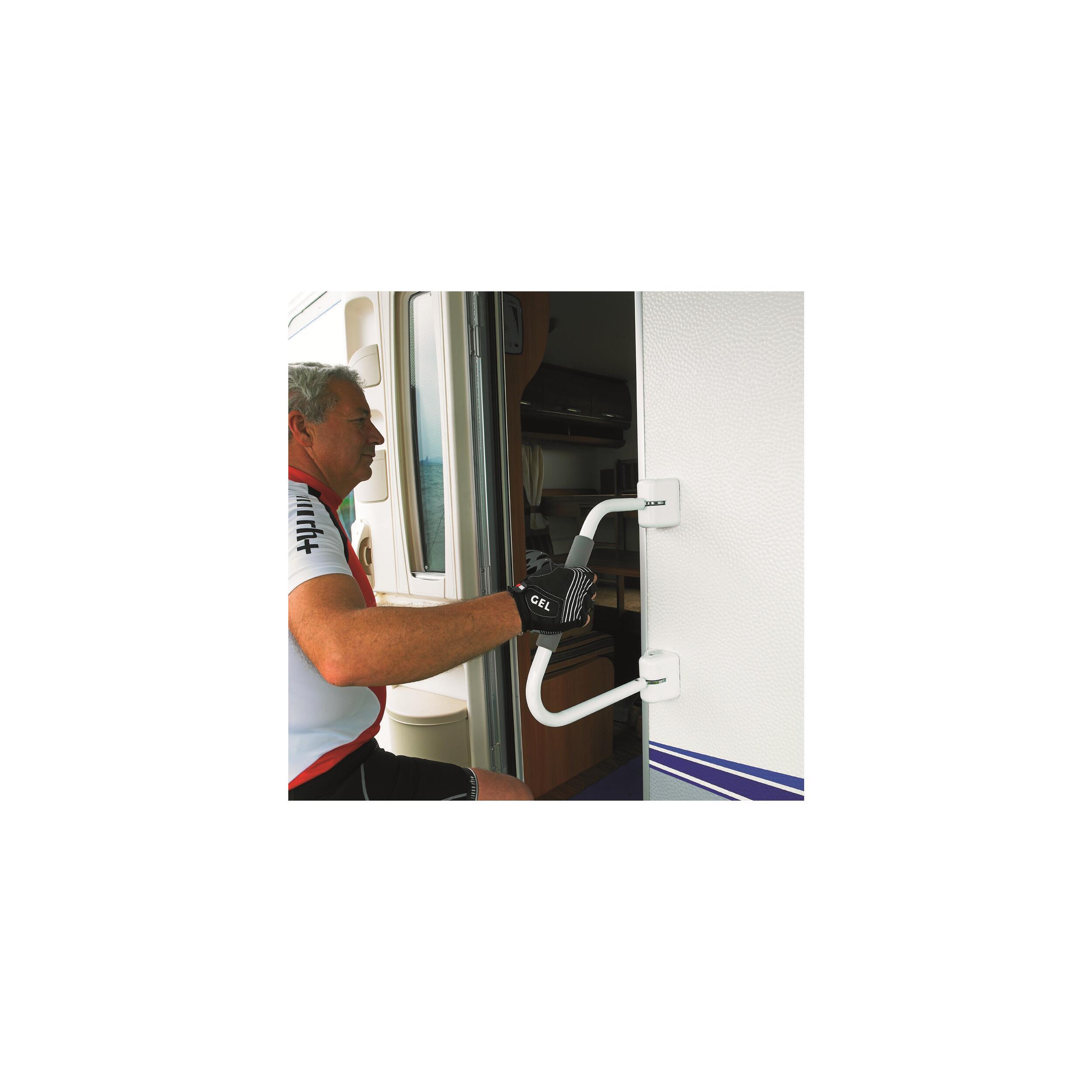 Poignée de sécurité en aluminium laqué blanc se fixant sur la bordure du cadre de porte. Ouverte, la poignée aide à monter sans effort à l'intérieur du véhicule. Repliée, elle fait office d'antivol et de sécurité supplémentaire contre l'ouverture de la porte. La main courante se replie indifféremment à gauche ou à droite.