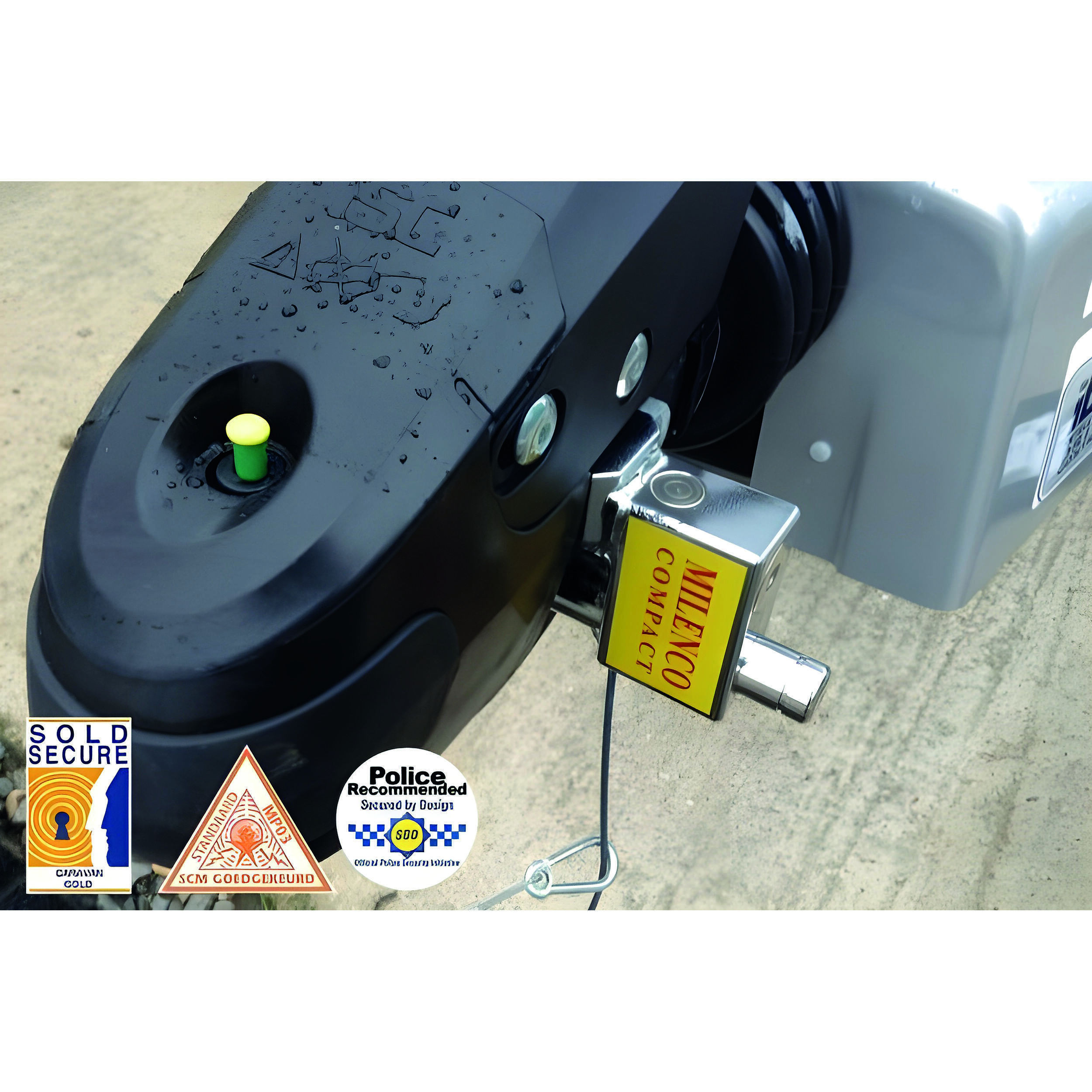 Antivol d’attelage compact Milenco en acier robuste avec serrure haute sécurité. Conforme aux normes Secure Gold et SCM MP03. Livré avec étui, 2 écrous de sécurité et 3 clés inox.