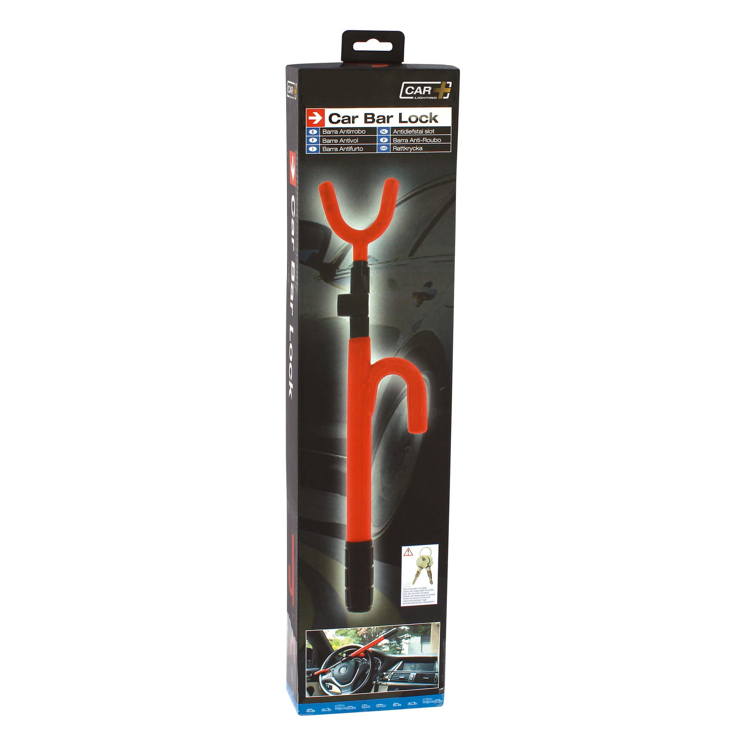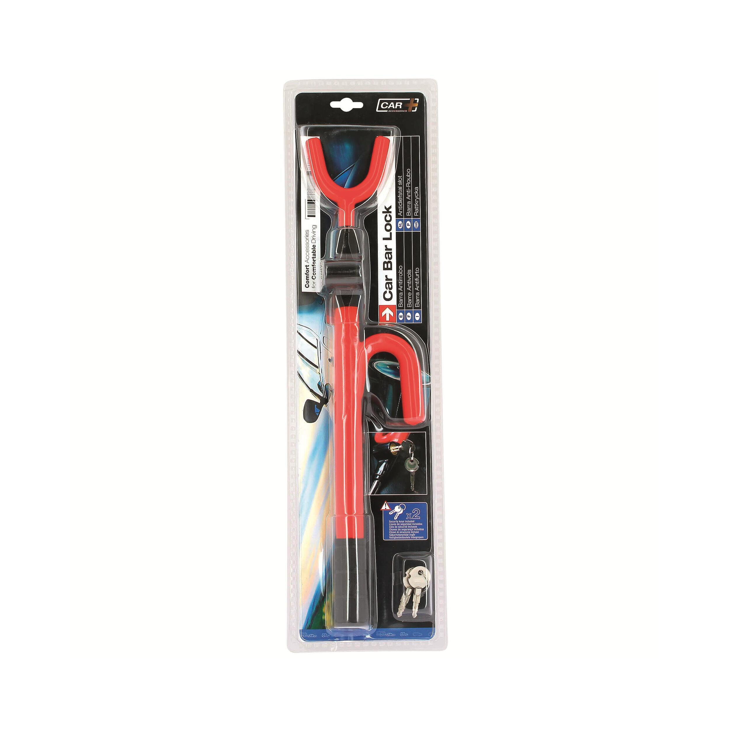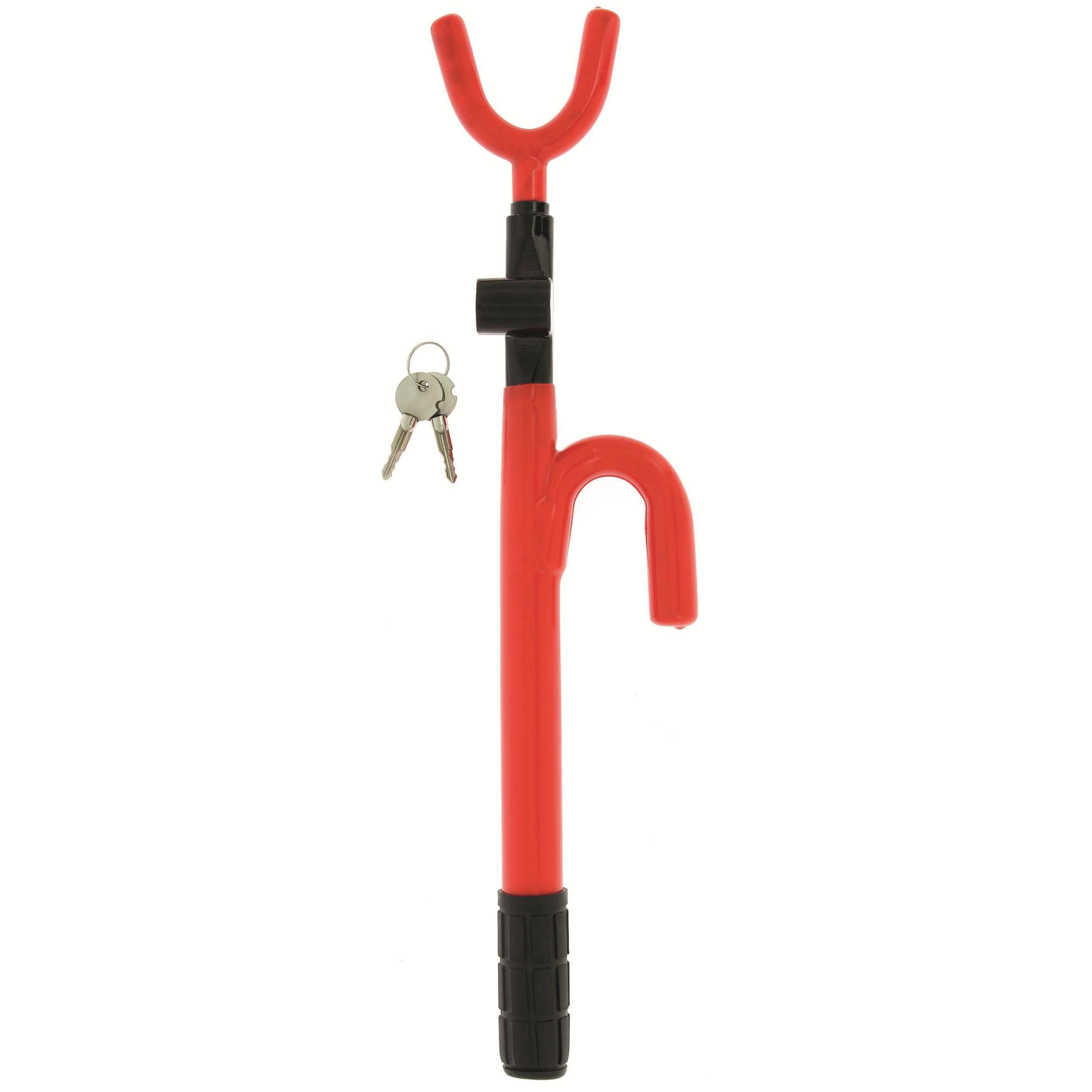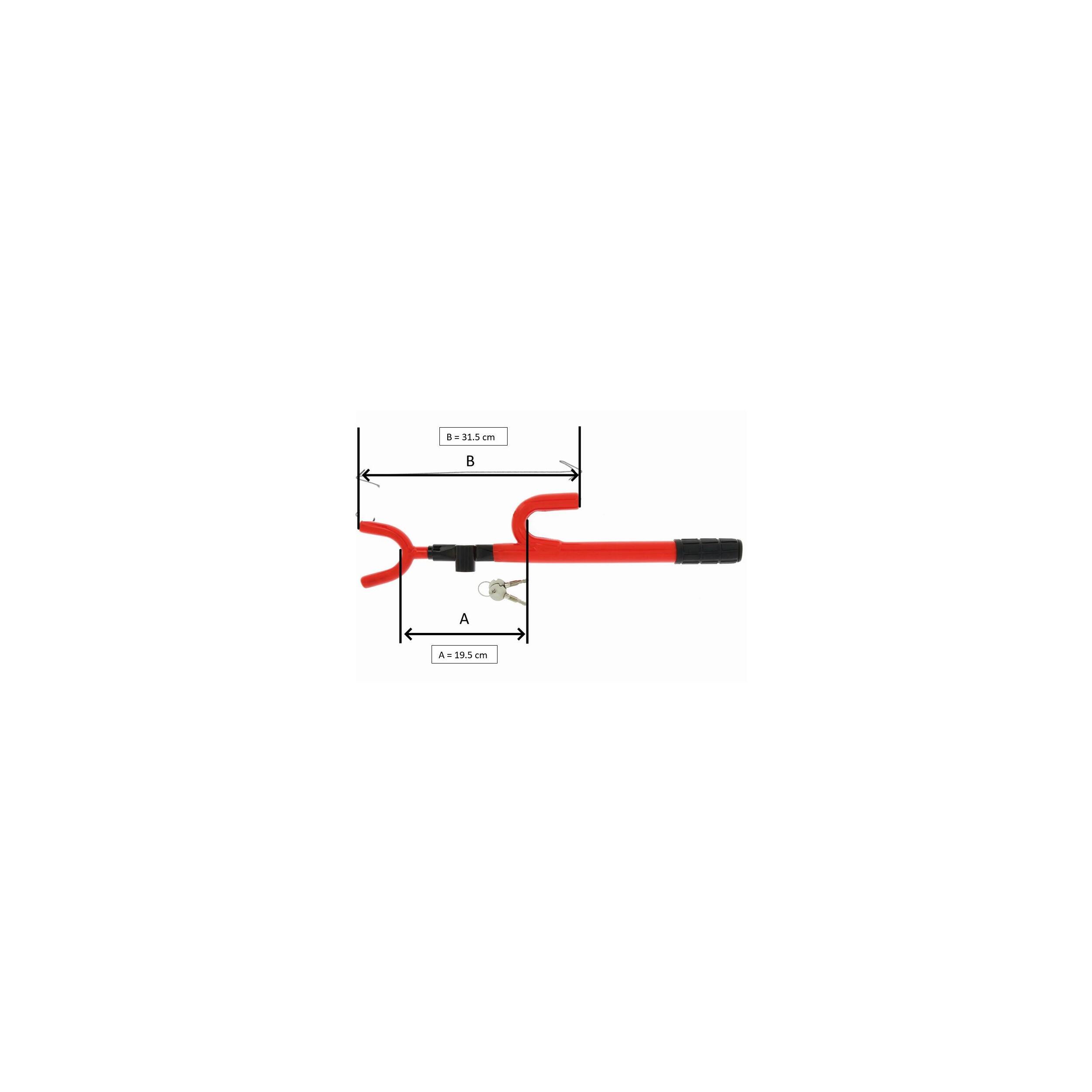 Barre antivol universelle pour volan, avec système d'accorche à 3 crochets. Deux clés fournies.
