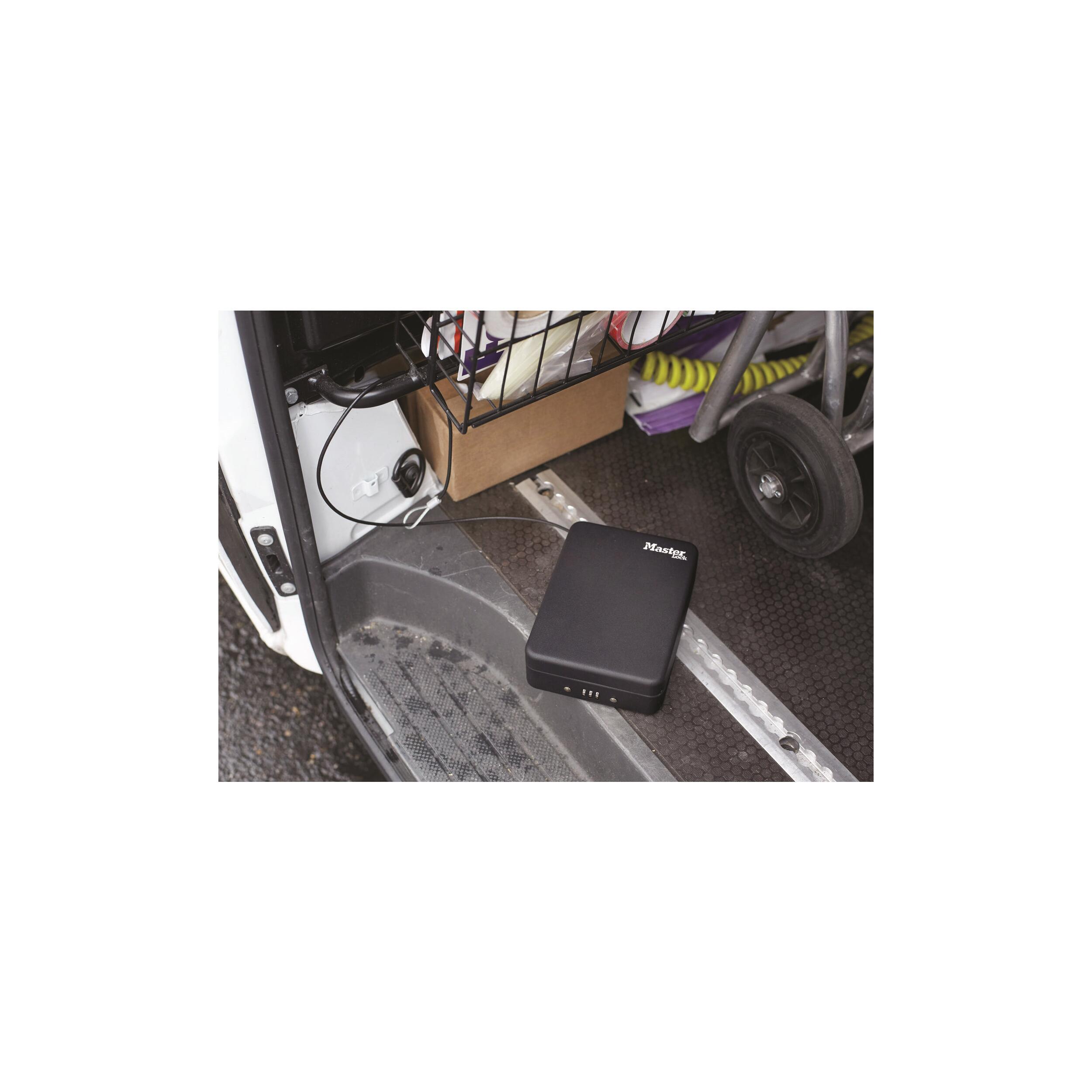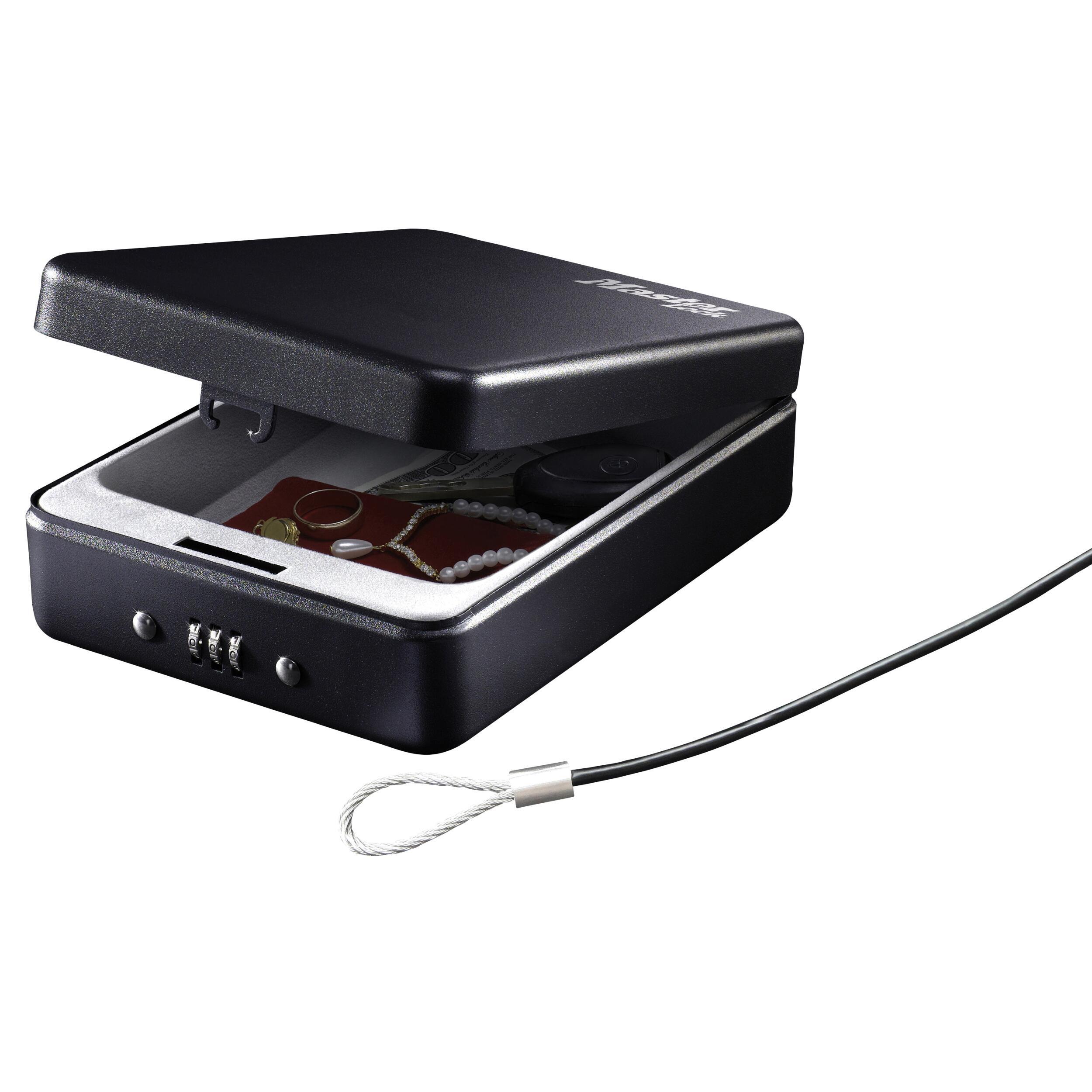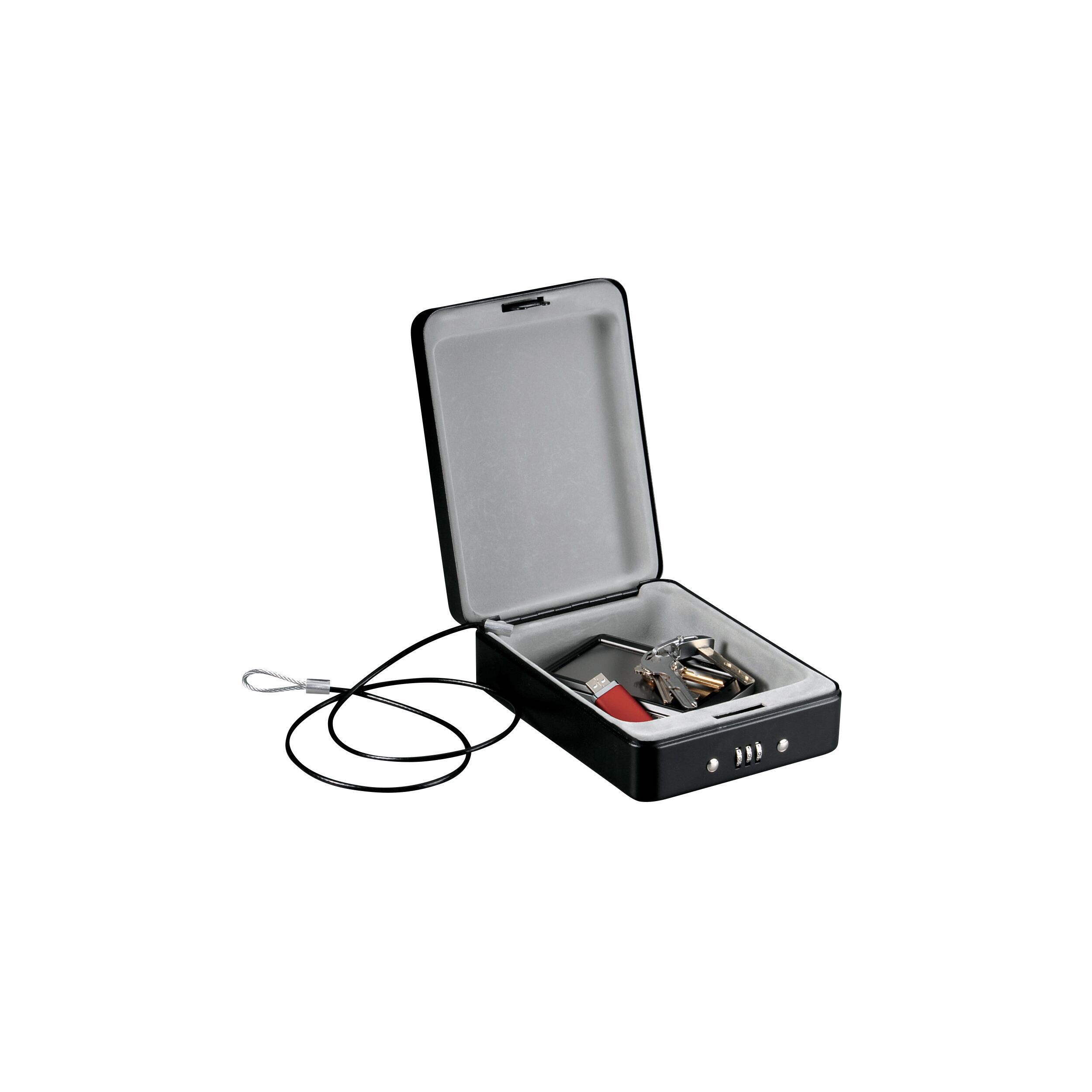 Mini-coffre de sécurité nomade avec câble de fixation en acier et combinaison programmable à 3 chiffres. Idéal en voiture, en fourgon, au camping, en bateau ou à la plage. Il assure la sécurité des smartphones, portefeuilles, lecteurs MP3 et autres objets de valeur de petite taille.