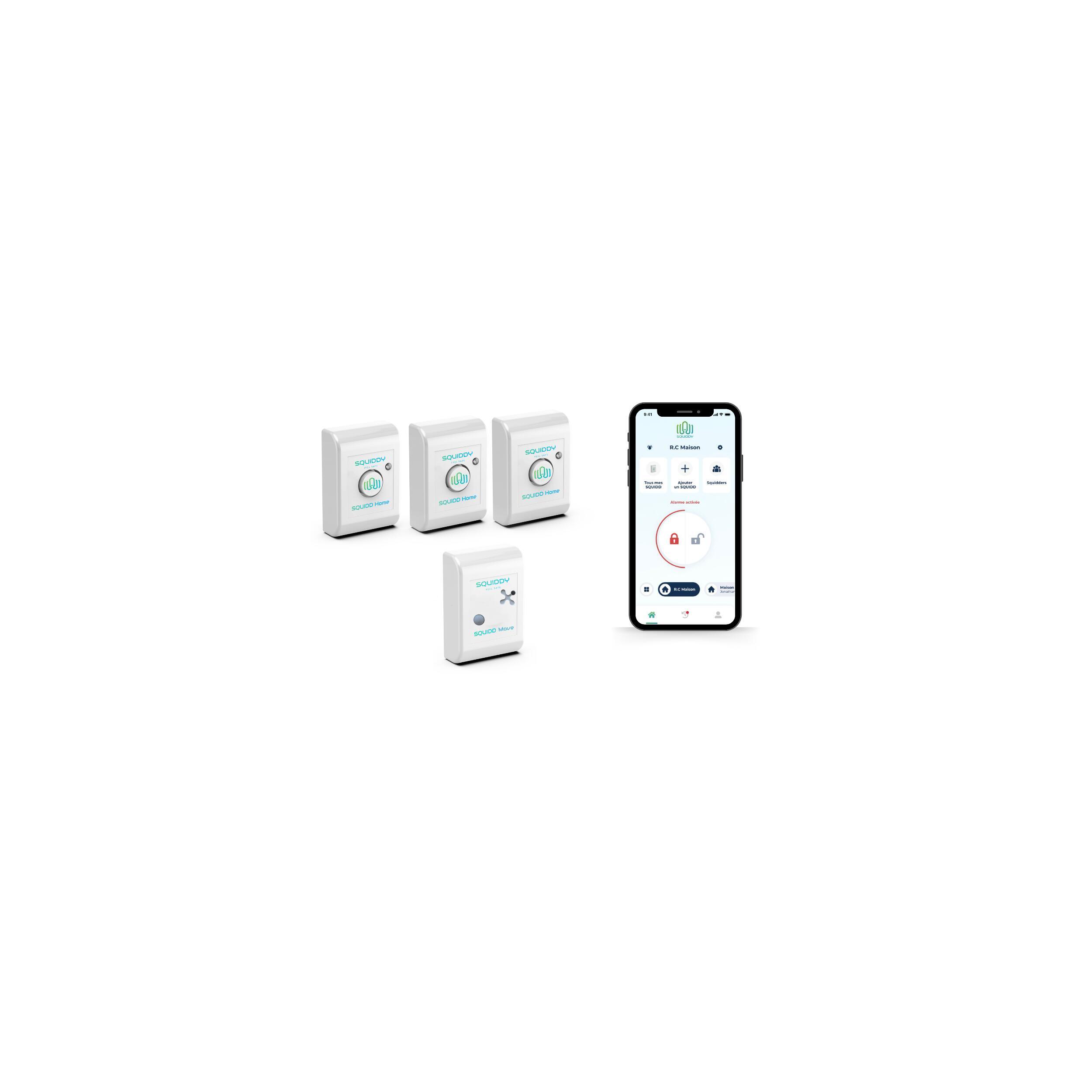 Le cœur du Pack Confort est le SQUIDD Home, une centrale de sécurité ultra-compacte, de la taille d’une carte de crédit, qui combine trois fonctions essentielles pour une protection optimale. Agissant à la fois comme détecteur de chocs, vibrations et ouvertures, il est doté d’une puissante sirène intégrée de plus de 95dB pour dissuader toute tentative d'intrusion. Connecté et autonome, le SQUIDD Home vous alerte immédiatement en cas de détection via SMS, e-mail ou notifications de l'application SQUIDDY. Cette alarme intelligente vous permet de garder le contrôle, où que vous soyez.