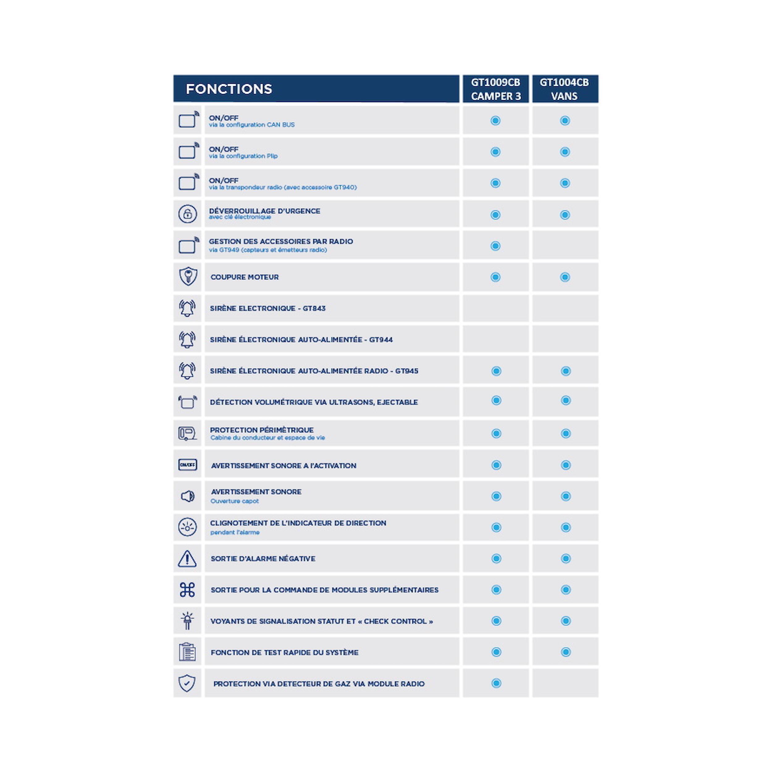 Le système d'alarme utilise la télécommande d’origine pour l'activation et la protection du véhicule. La clé électronique fournie permet le déverrouillage d'urgence. Le module intégré permet la gestion des capteurs par radio/radiocommandes GT.